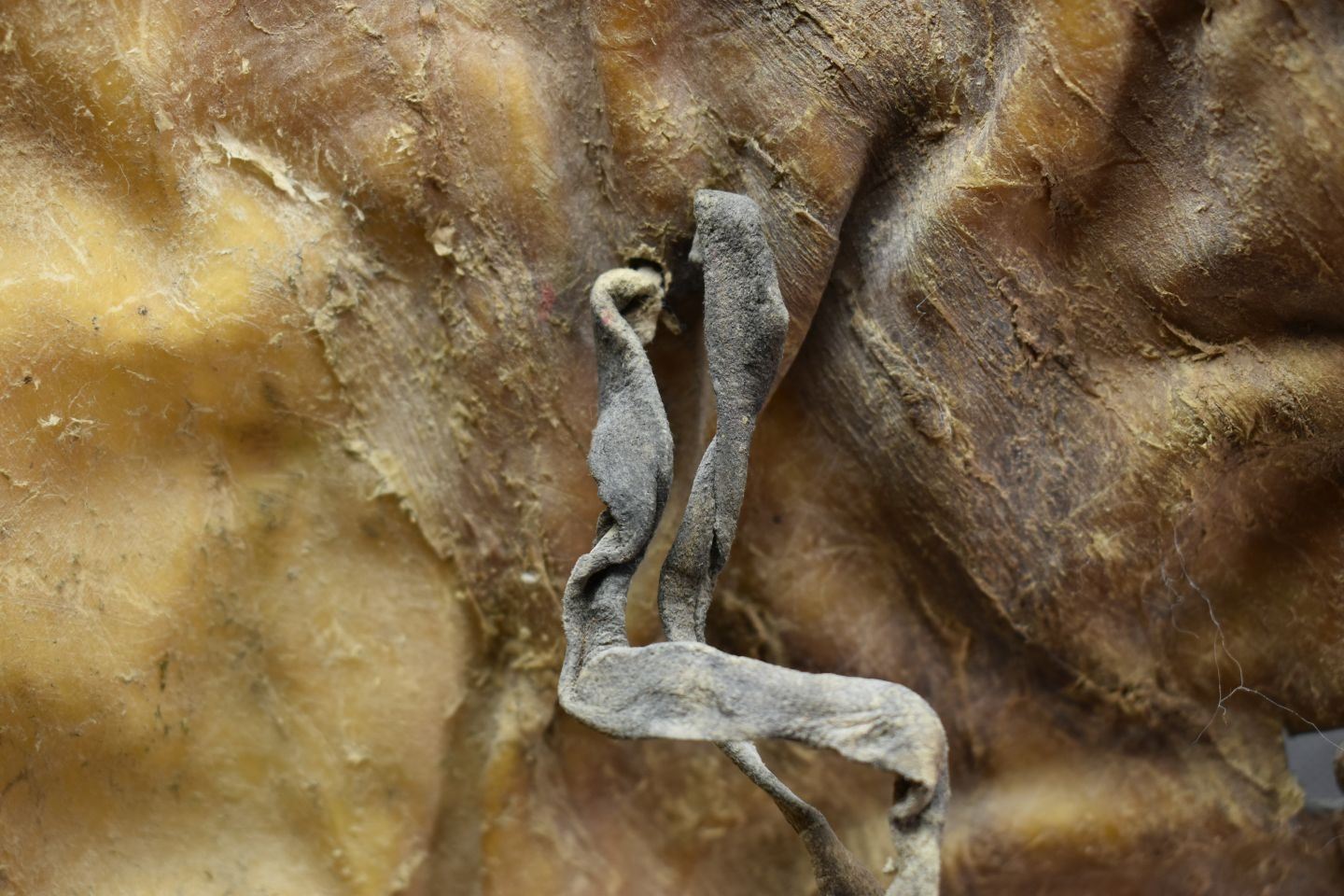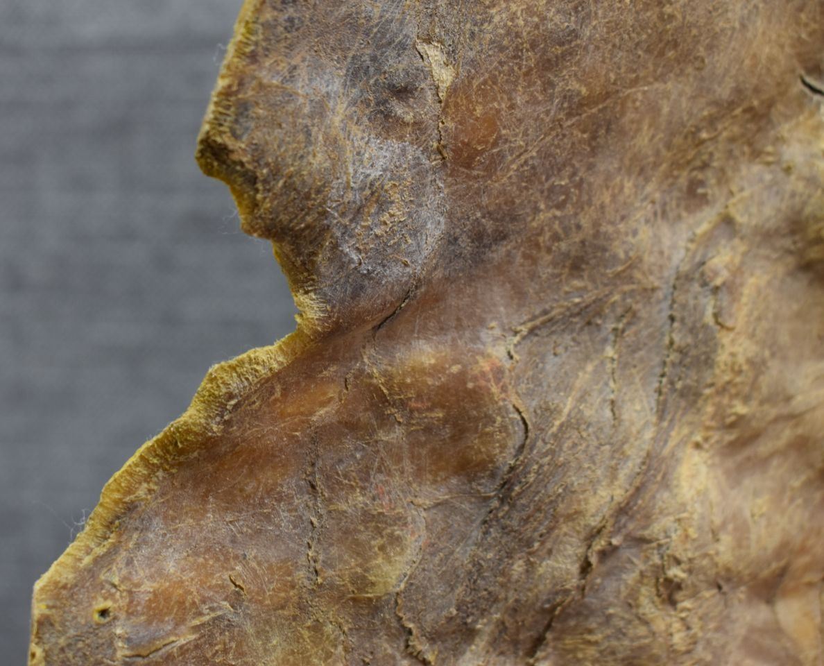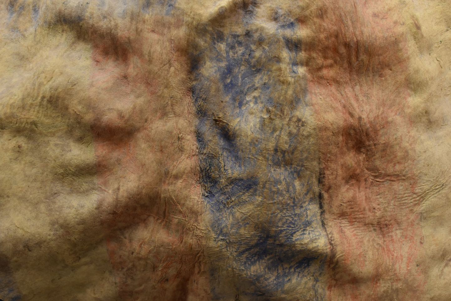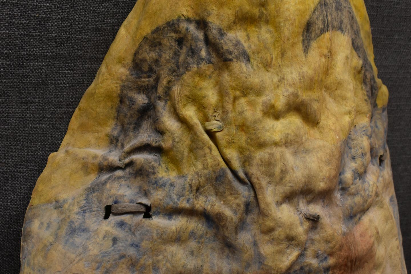 20th century. Hand painted design on hide dance shield. 22'' x 18''
