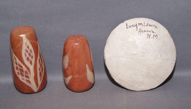 1960s 70s three total, one Acoma plate has been broken and glued signed Lucy M. Lewis .5" x 4" two Santo Domingo salt and pepper shakers tall one 3.75" x 1.75" Shipping charge are for the United States. The shipping on this lot is $10.00. Outside the United States there will be additional shipping fees.