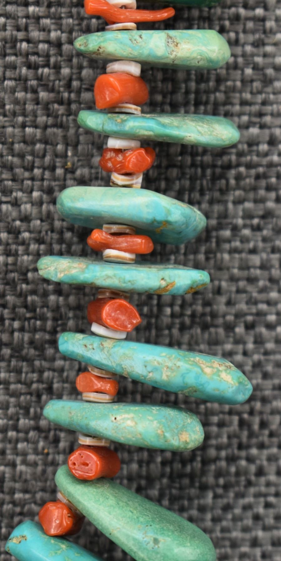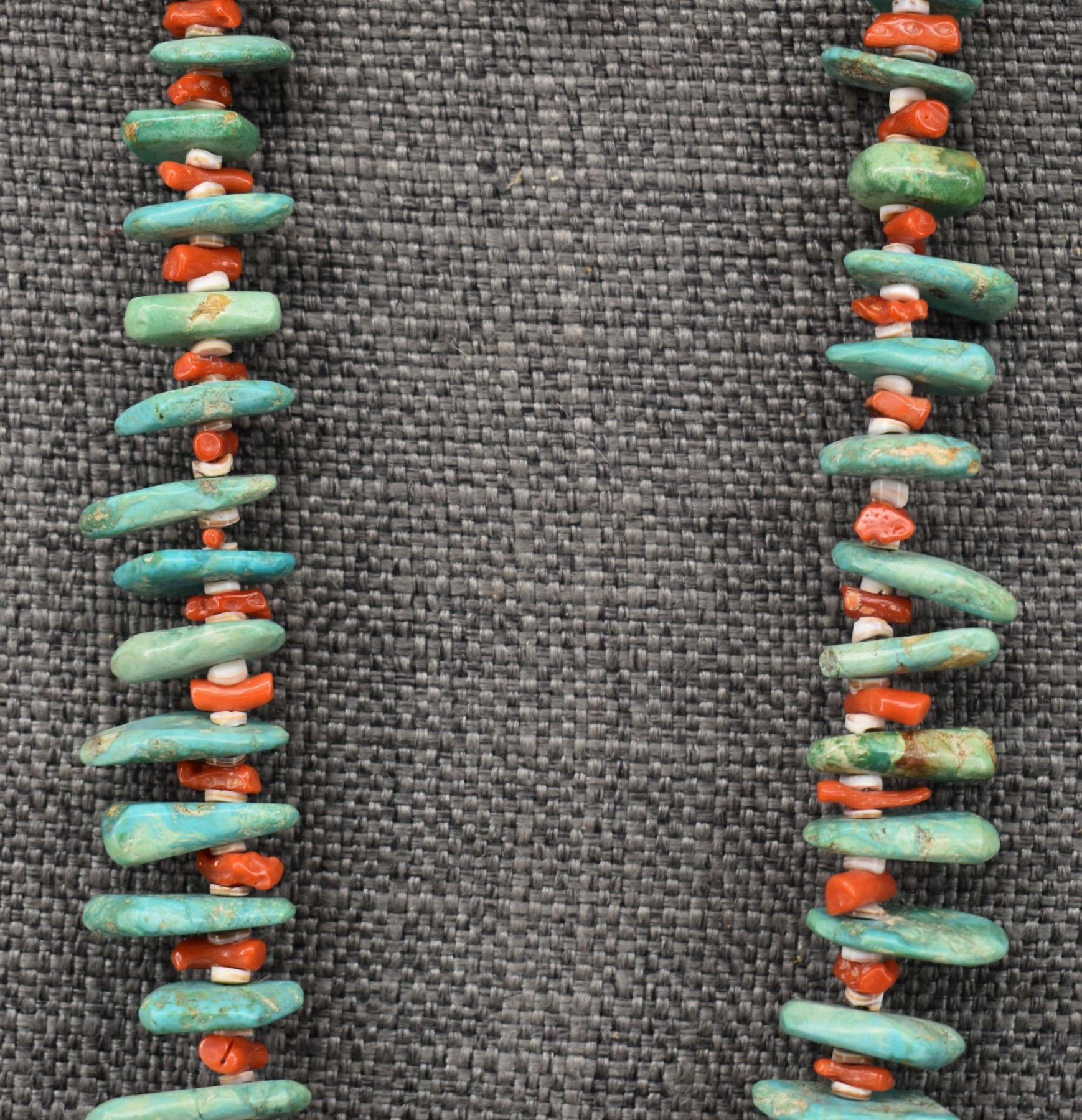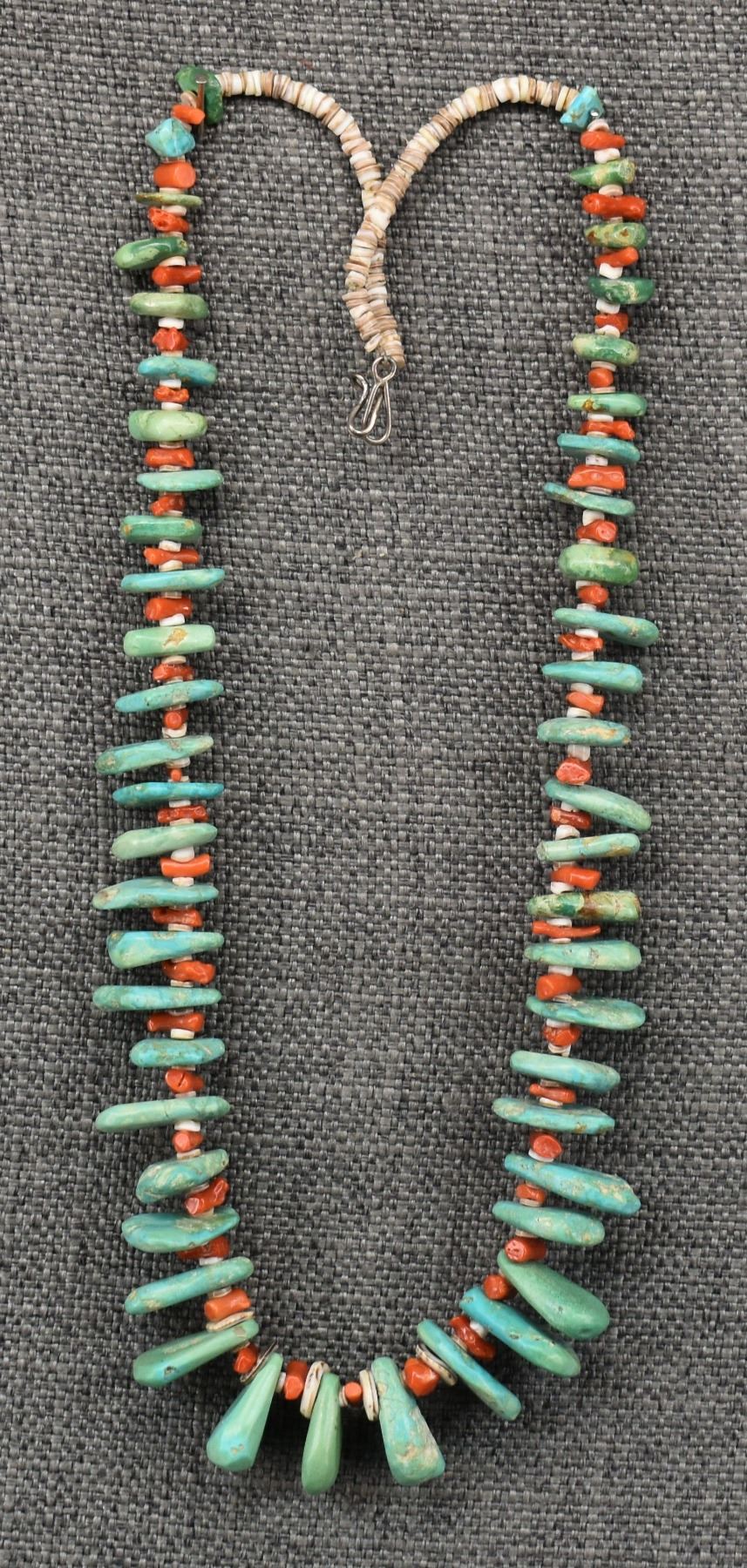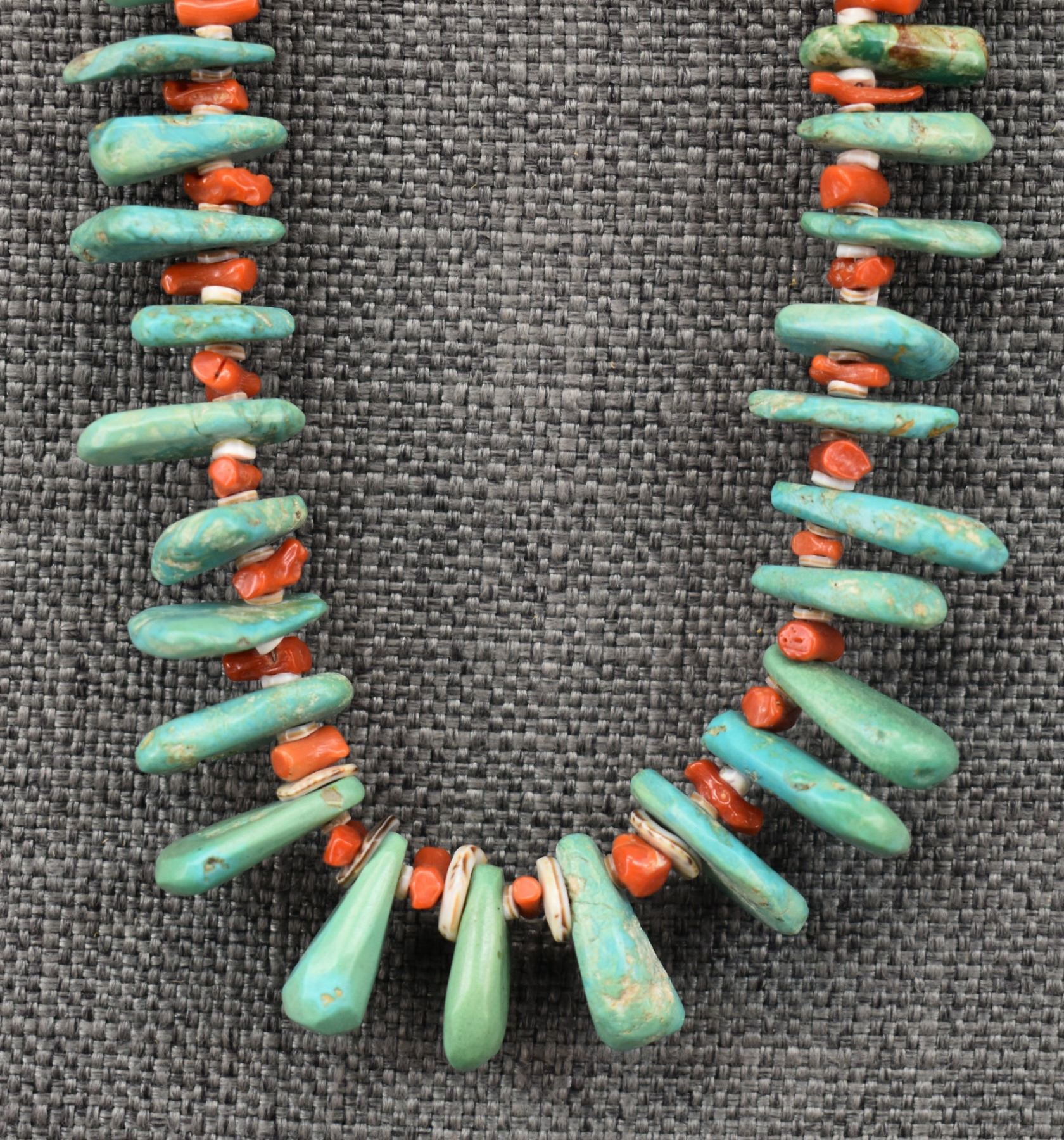 1960's Pueblo, single strand of heishi and coral with graduated turquoise tabs 25" long