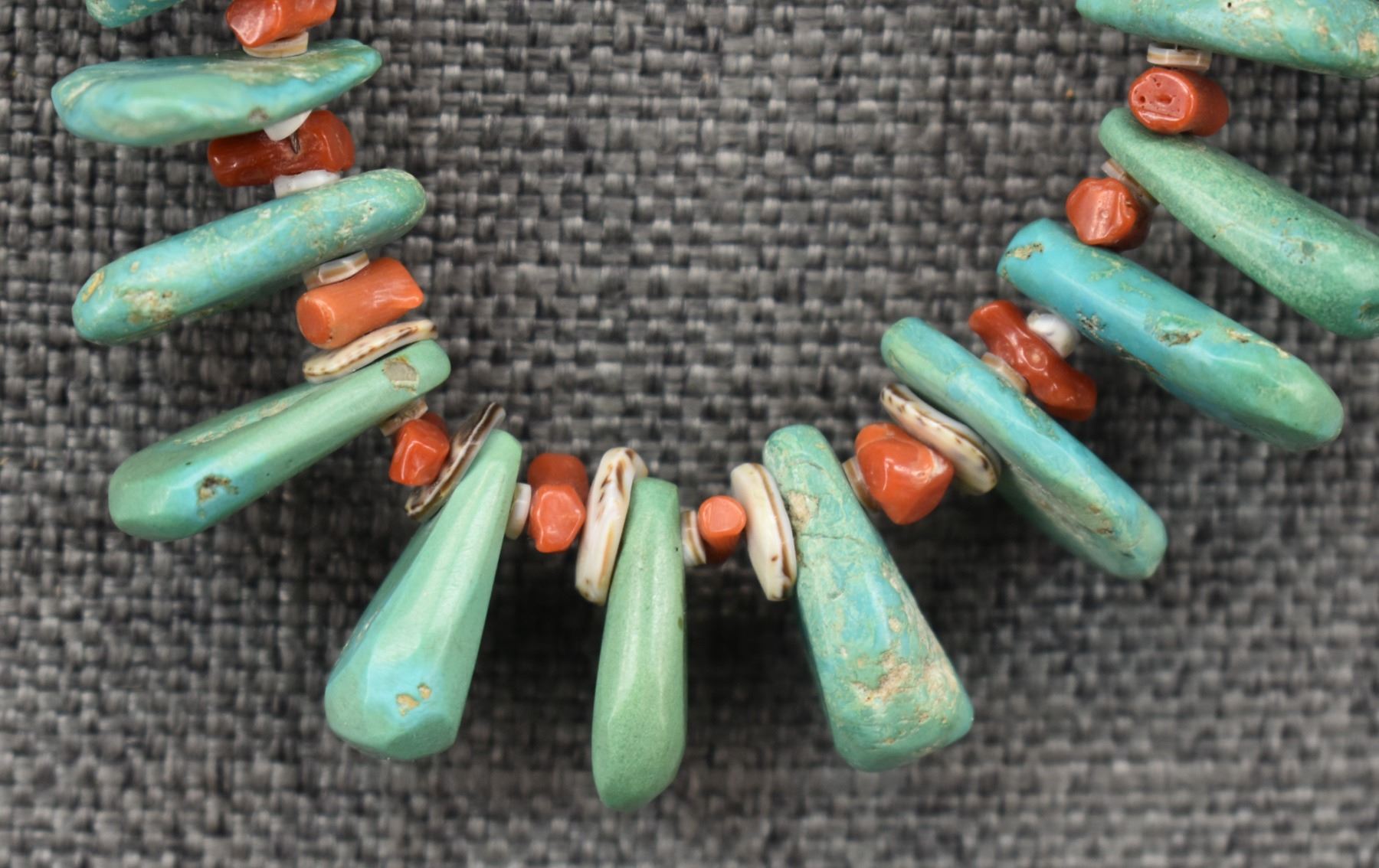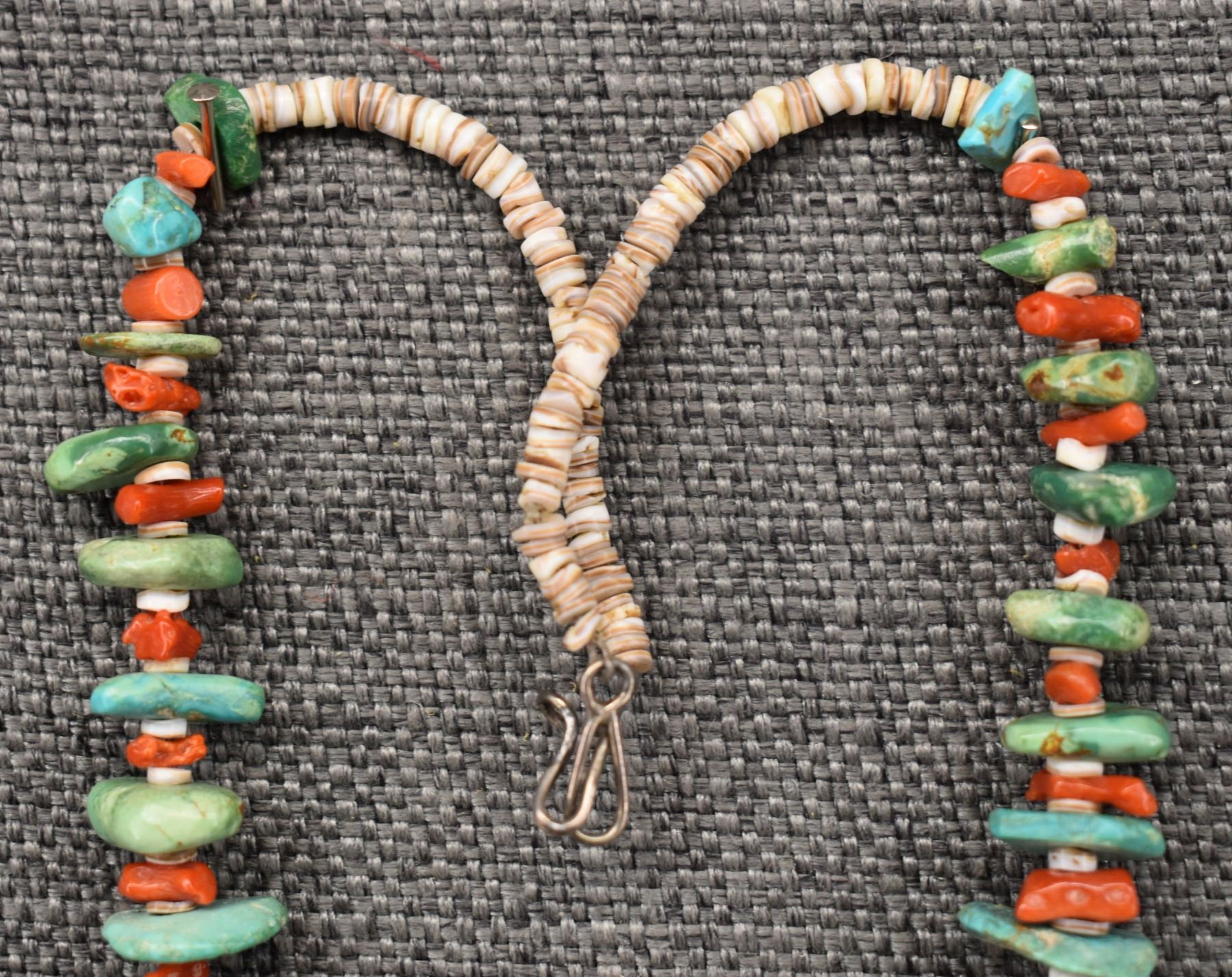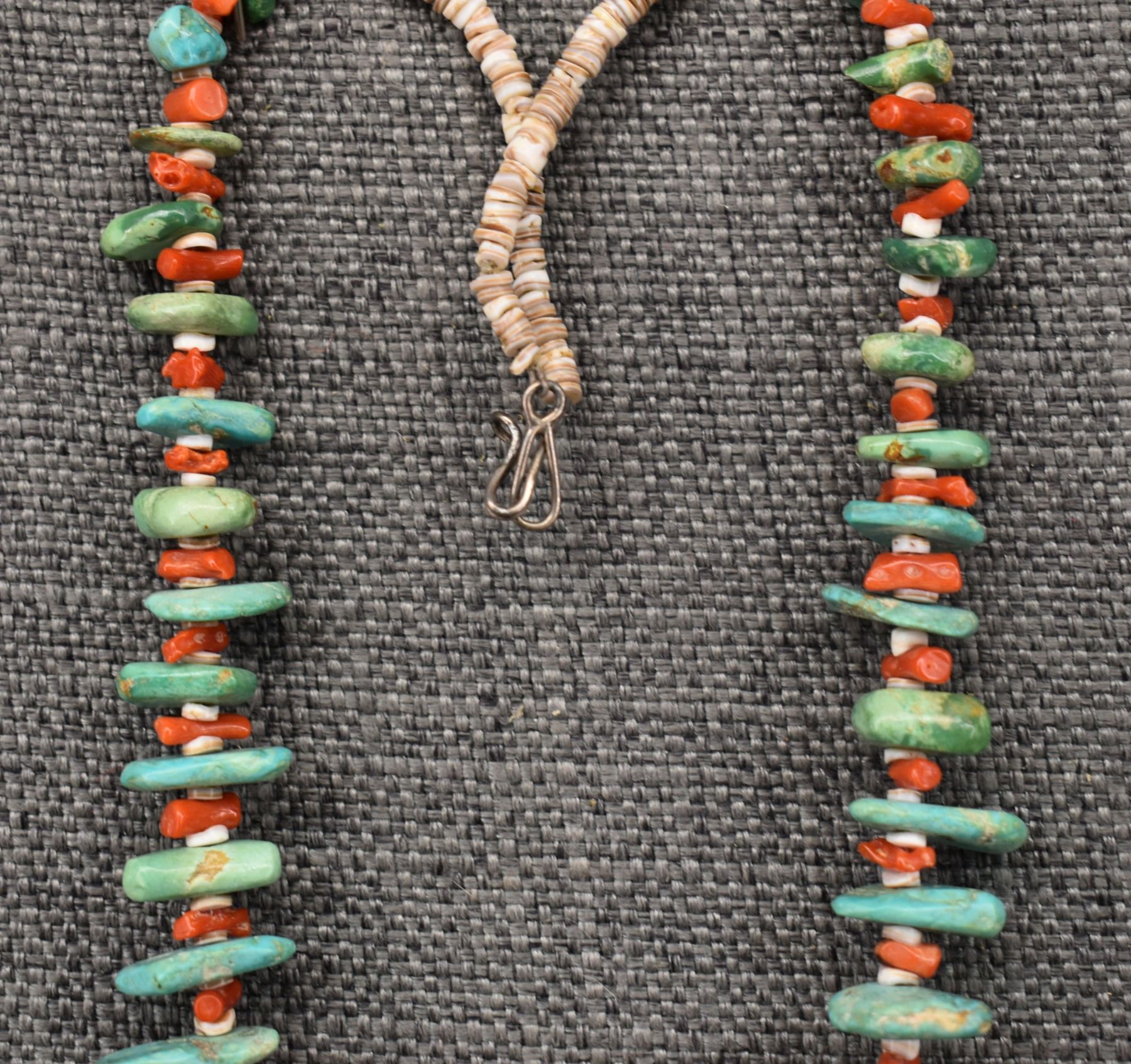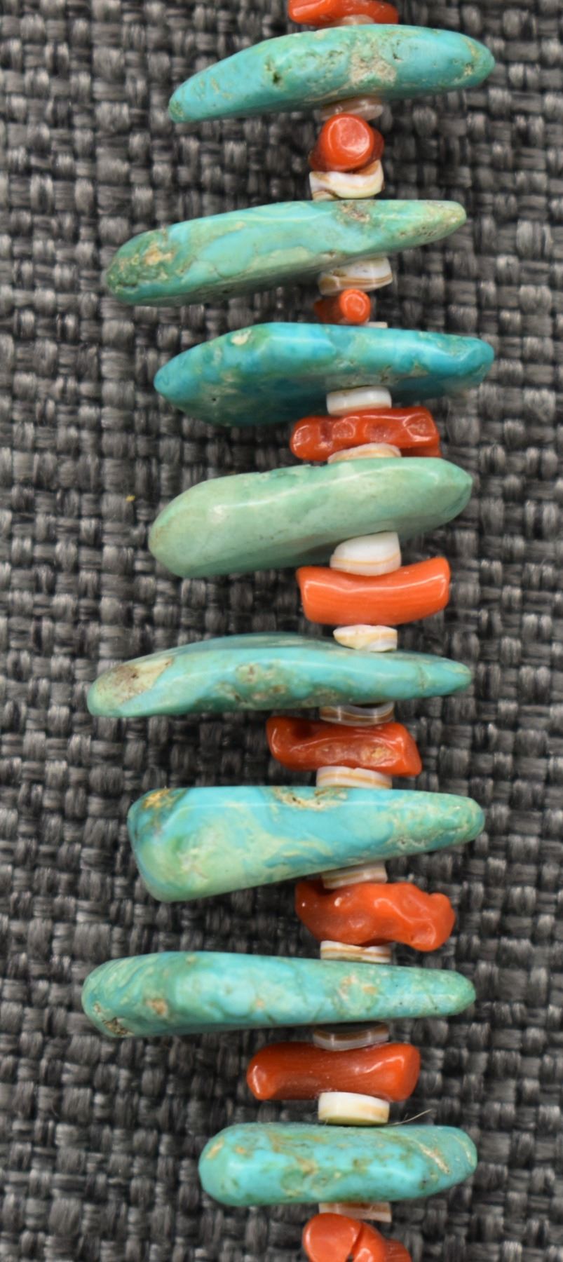 1960's Pueblo, single strand of heishi and coral with graduated turquoise tabs 25" long