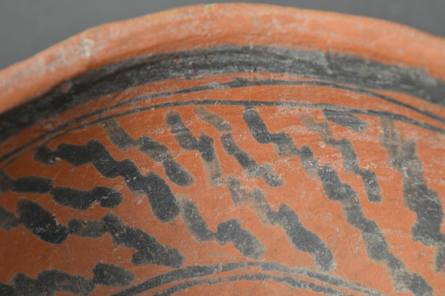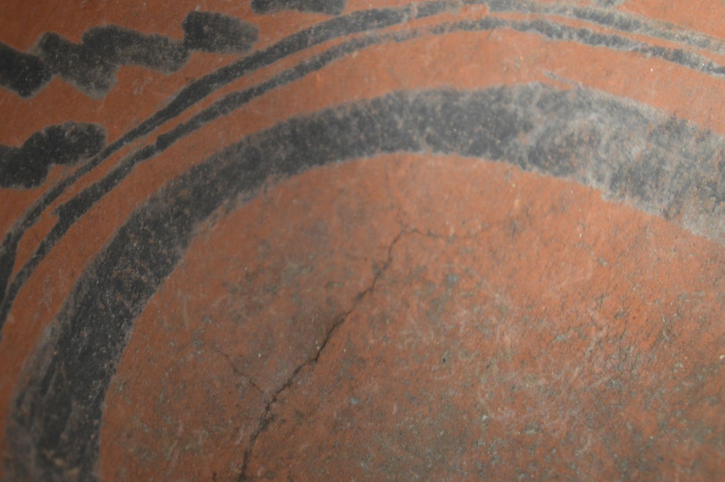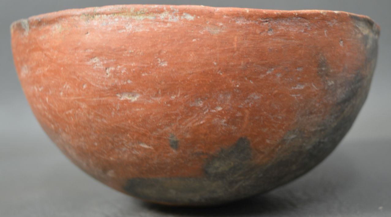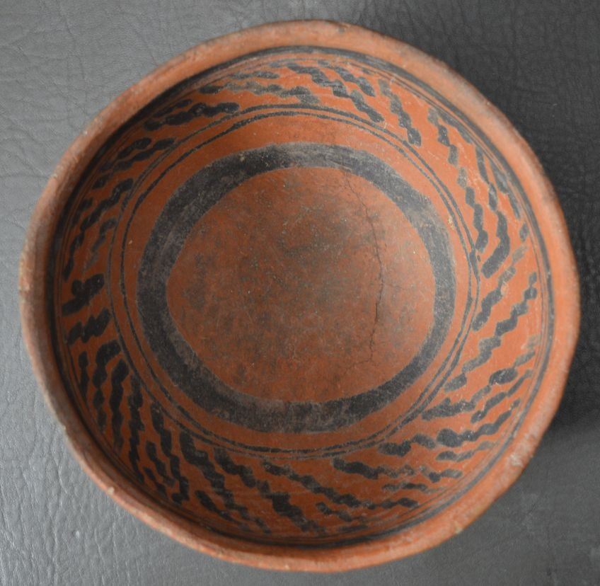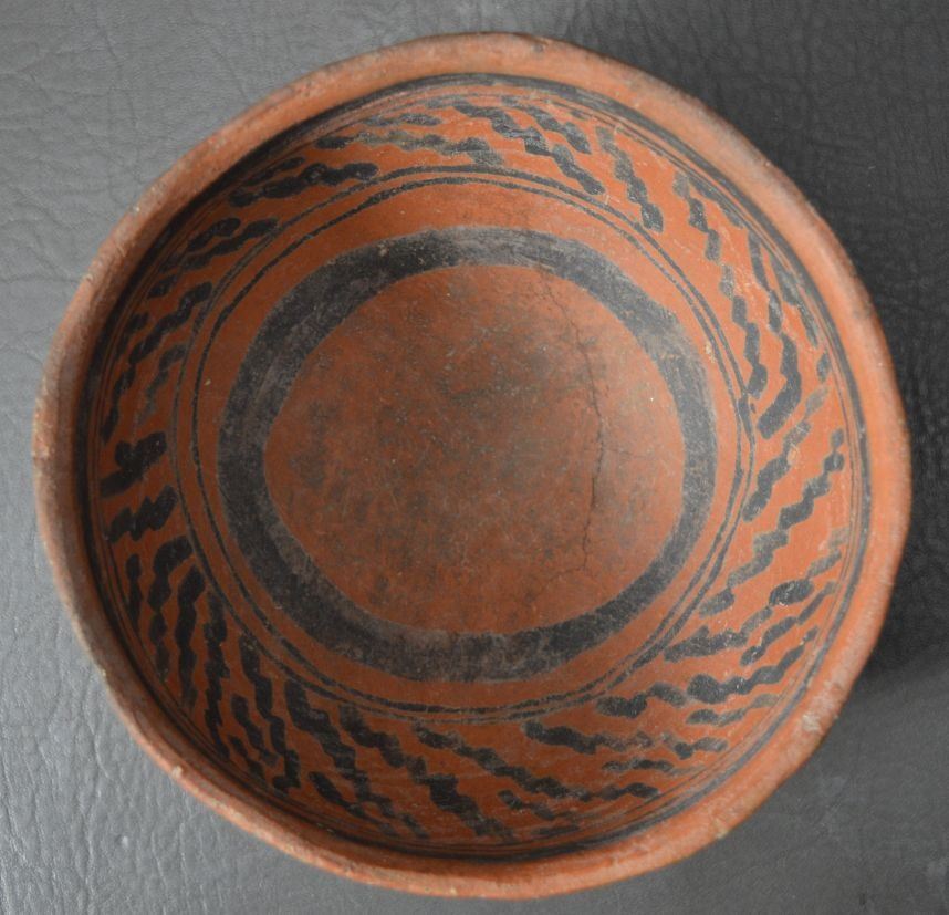 prehistoric Salado hand coiled painted red on black design pottery bowl. 3'' x 6'' has hairline crack in the bottom, in as found condition