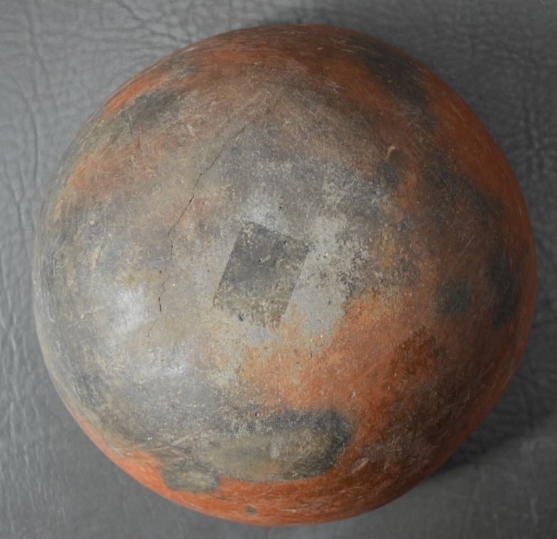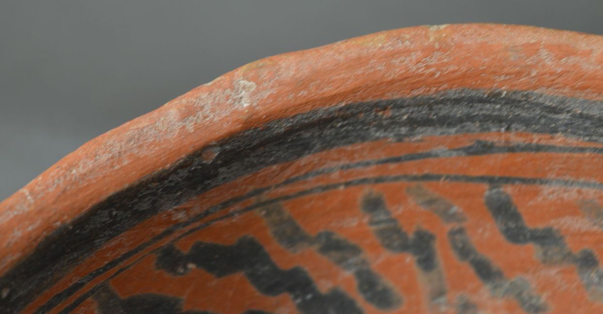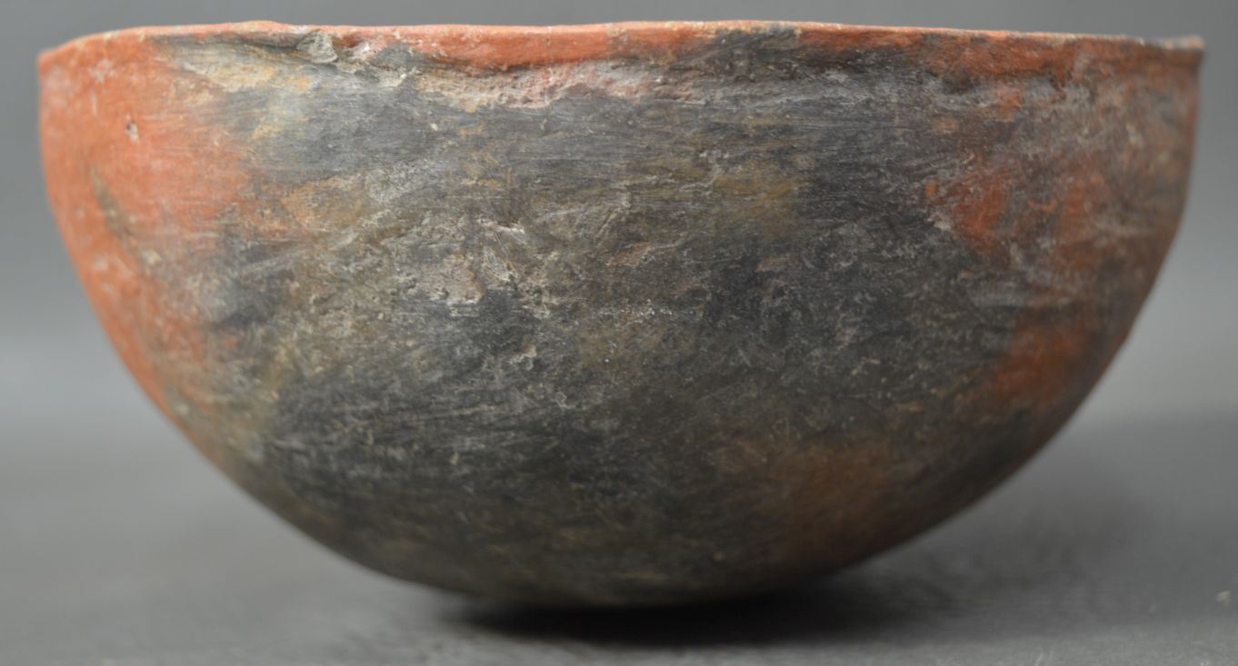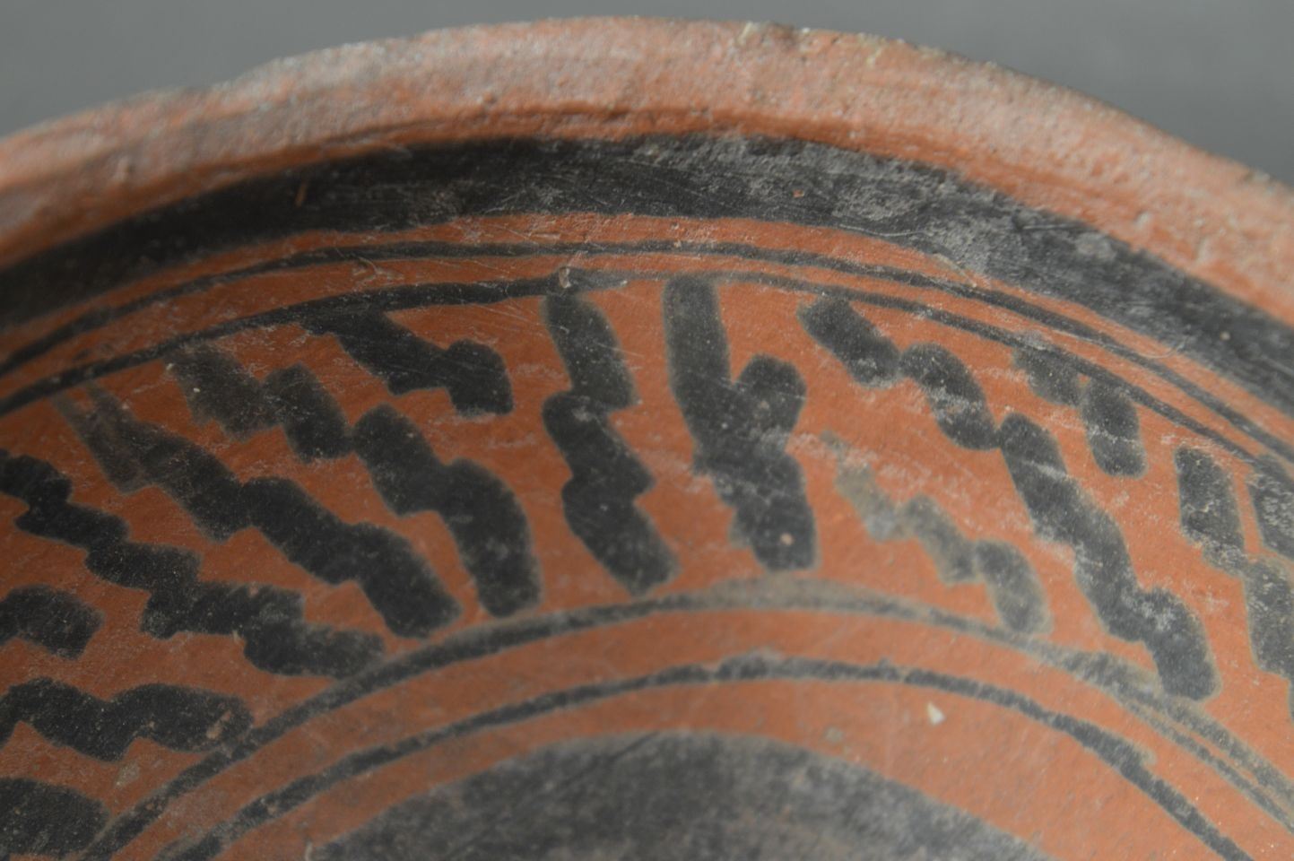 prehistoric Salado hand coiled painted red on black design pottery bowl. 3'' x 6'' has hairline crack in the bottom, in as found condition