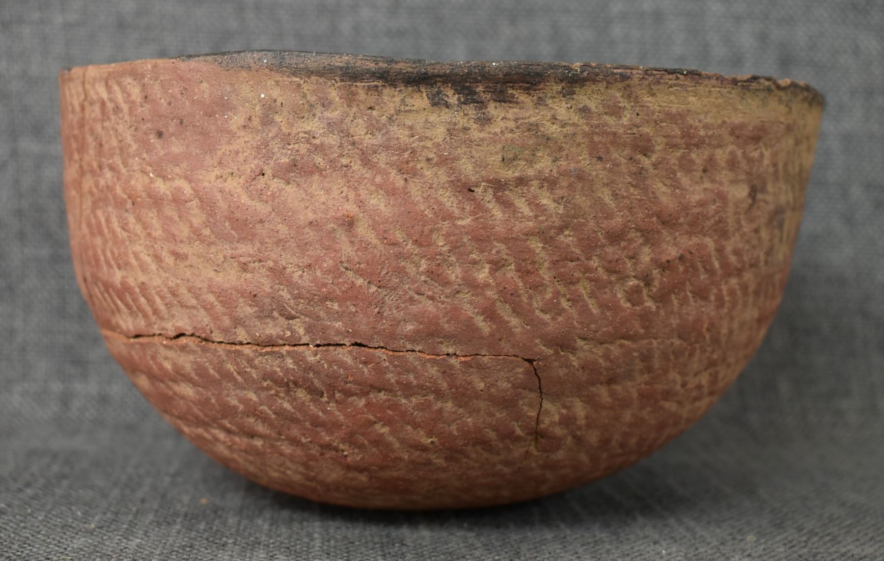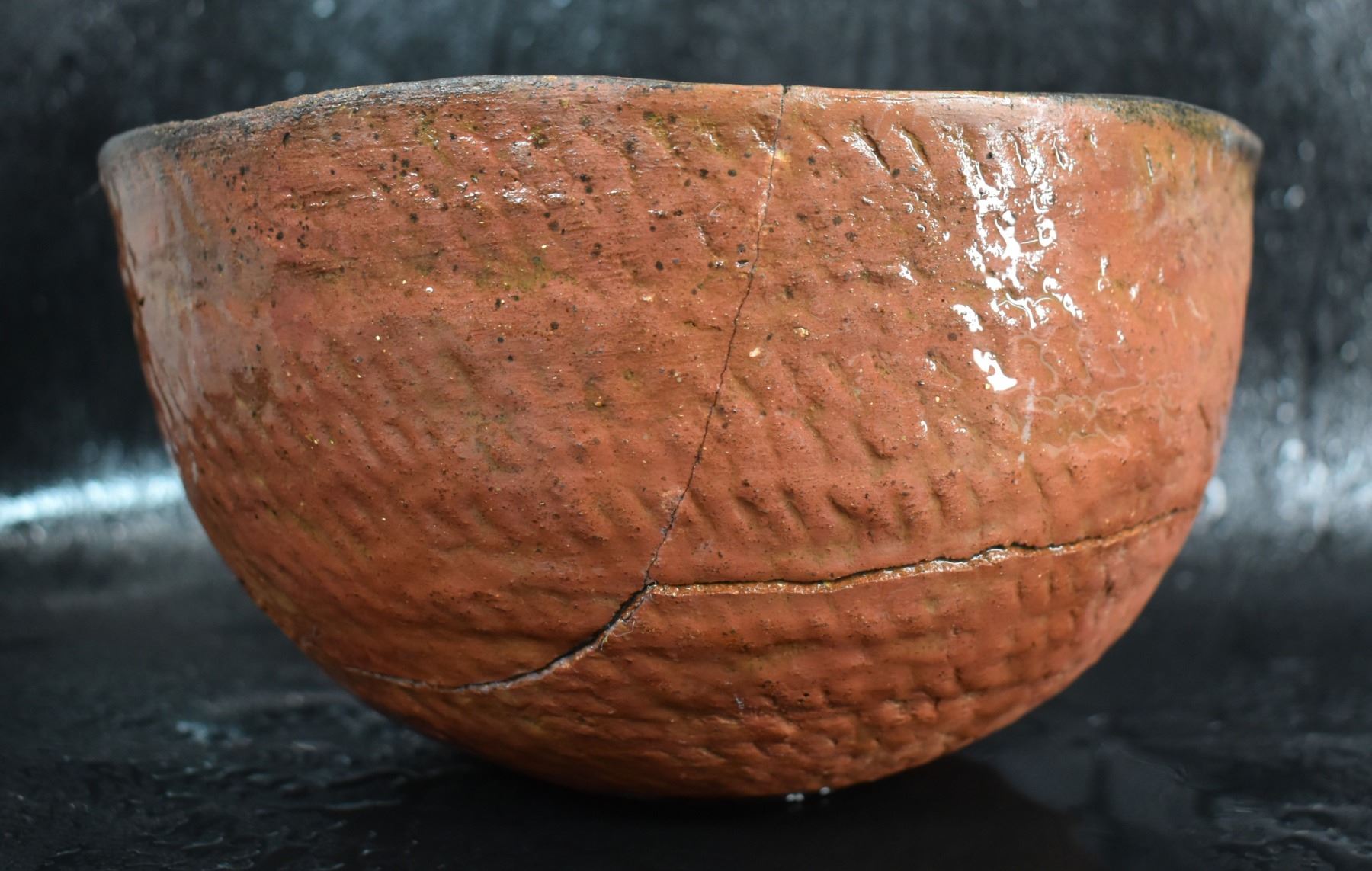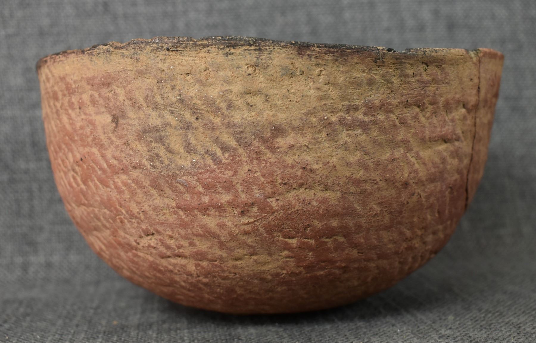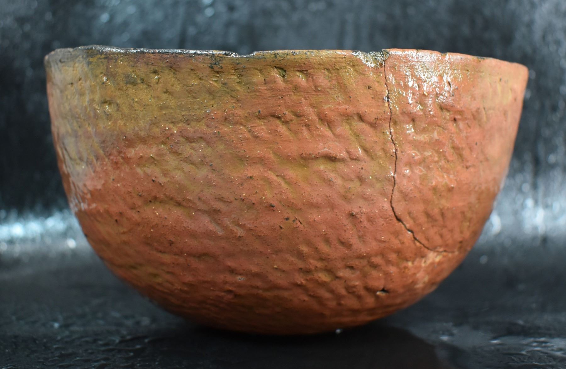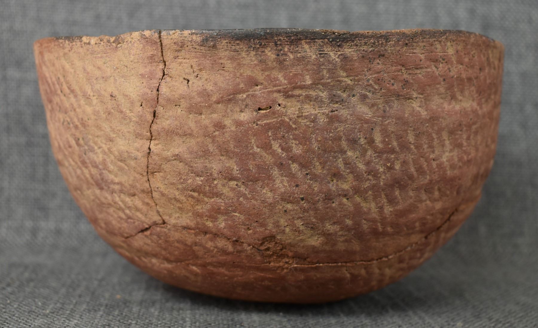 prehistoric . Salado. Hand coiled corrugated design pottery bowl. 4'' x 7.5'' has been broken and glued.