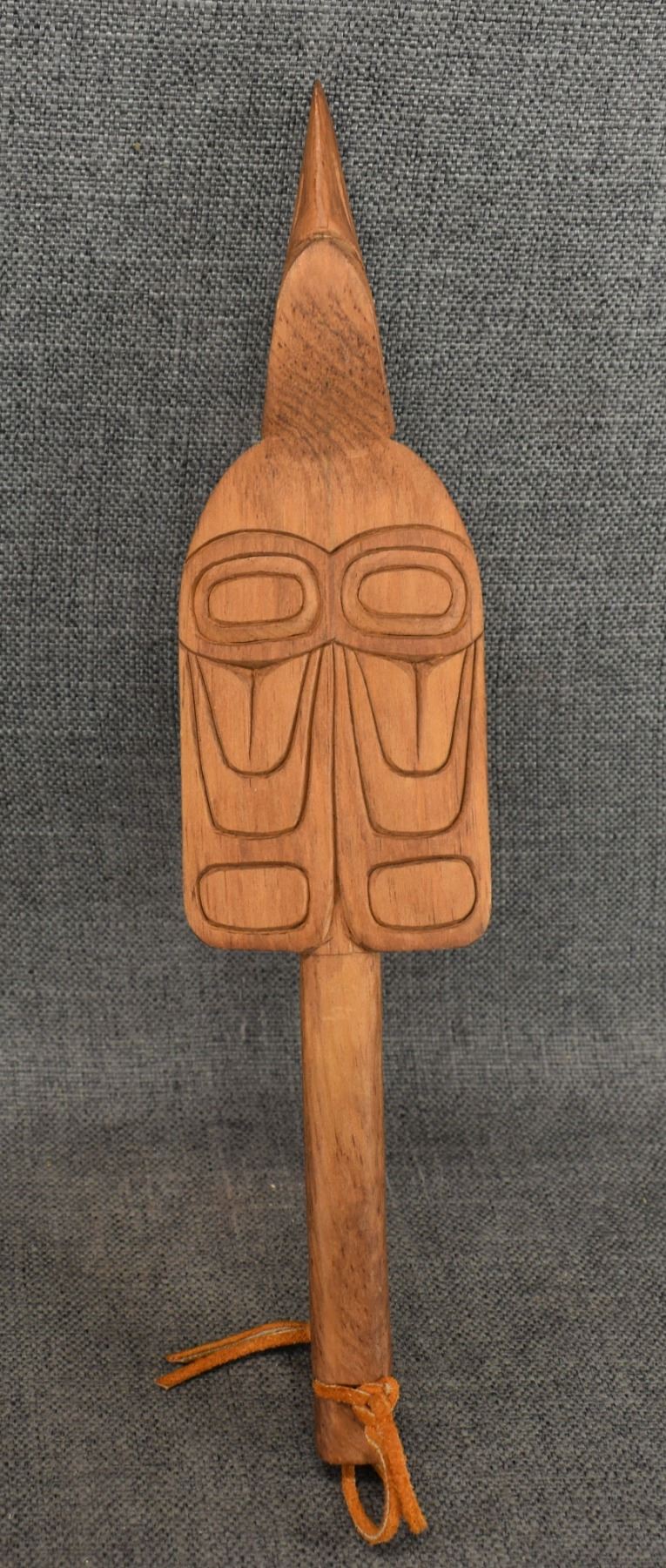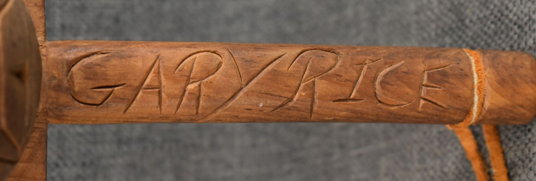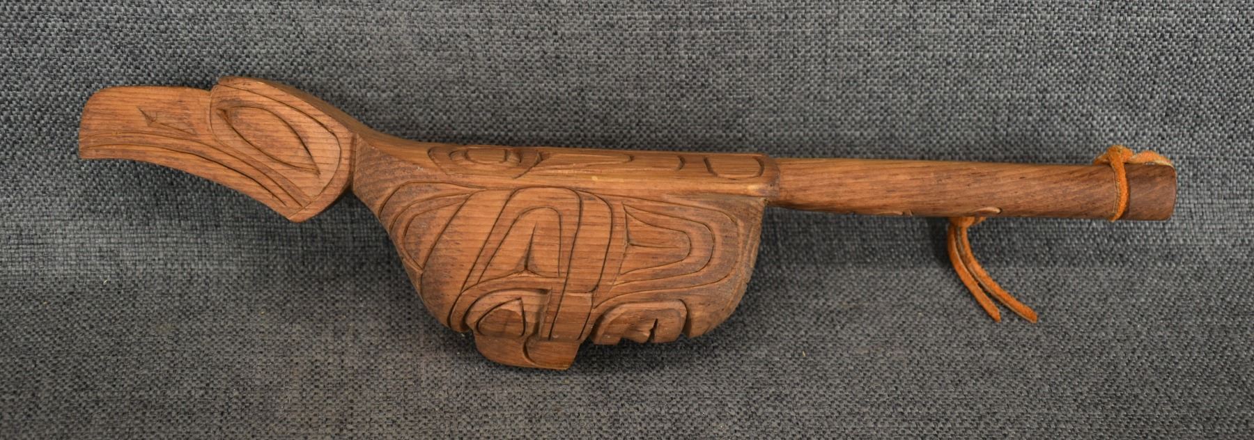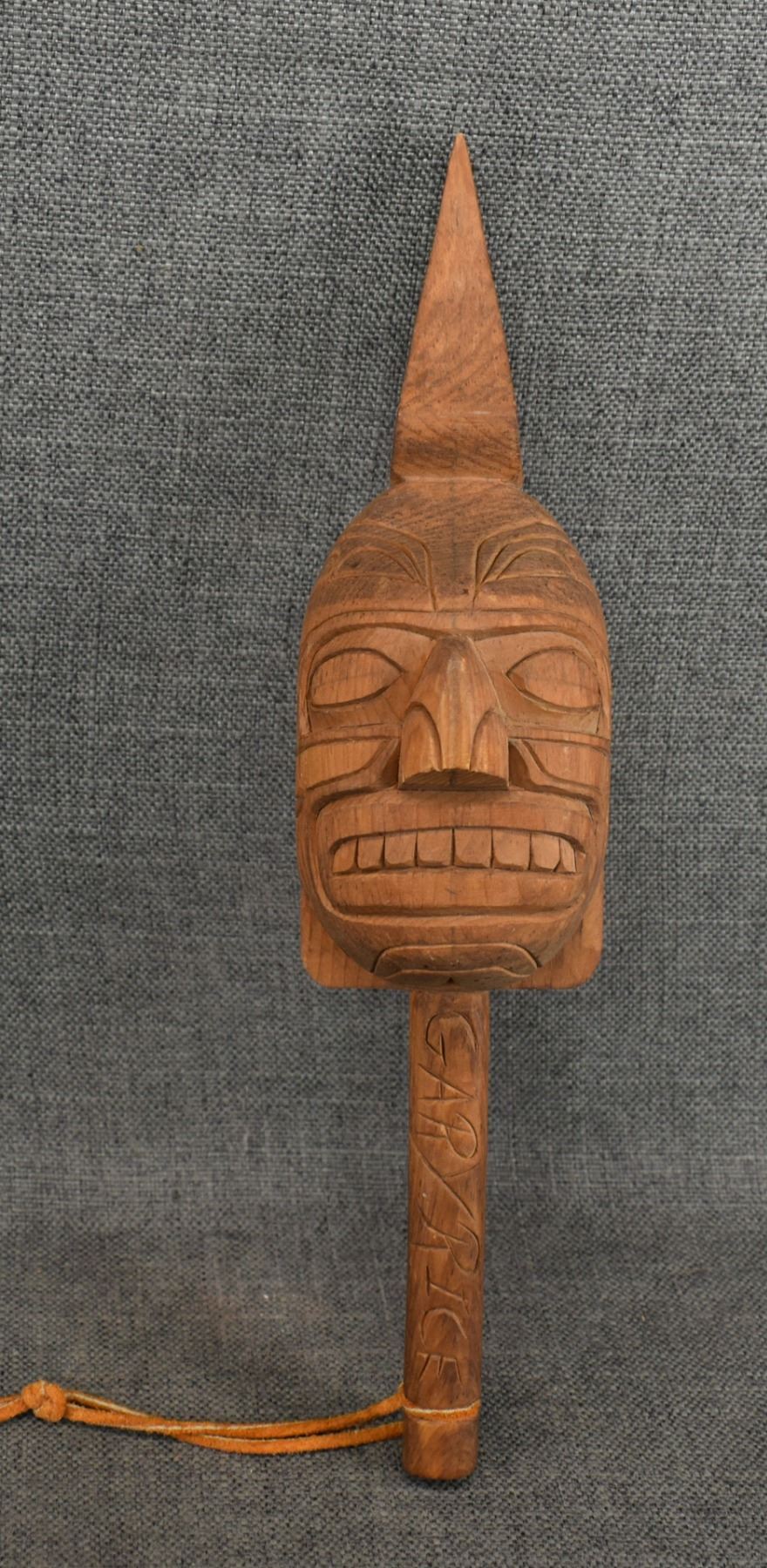 1980's Salish . Hand carved wooden rattle, signed Gary Rice. 15'' x 4'' x 3.5''