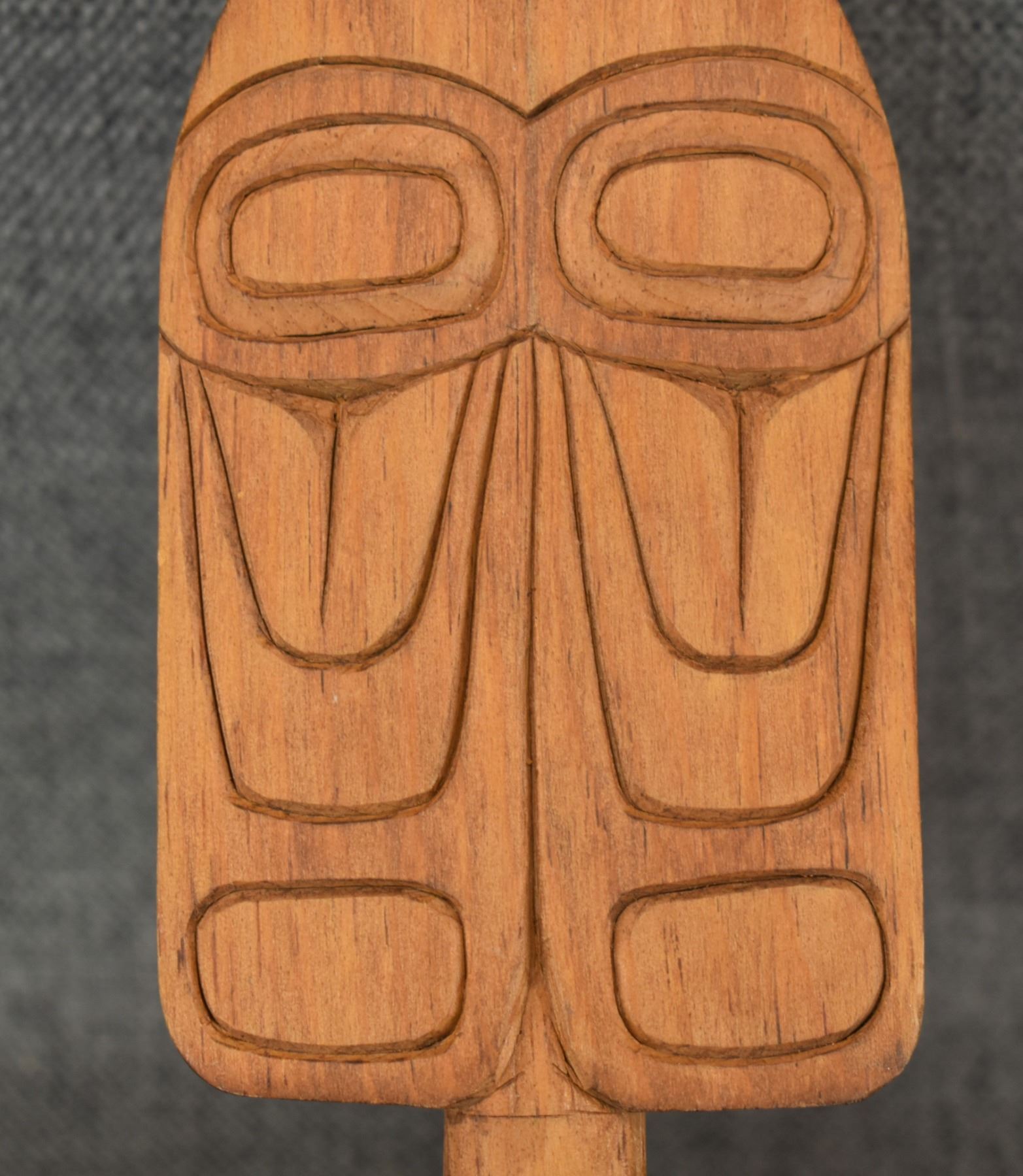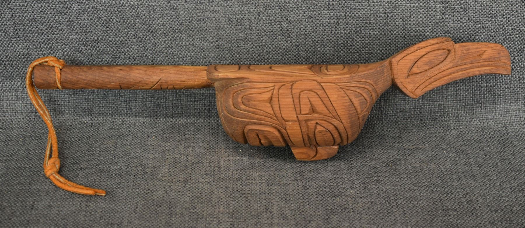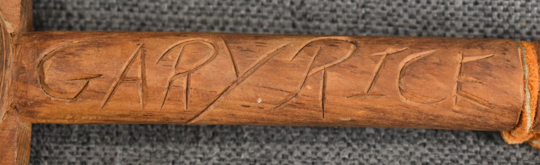 1980's Salish . Hand carved wooden rattle, signed Gary Rice. 15'' x 4'' x 3.5''