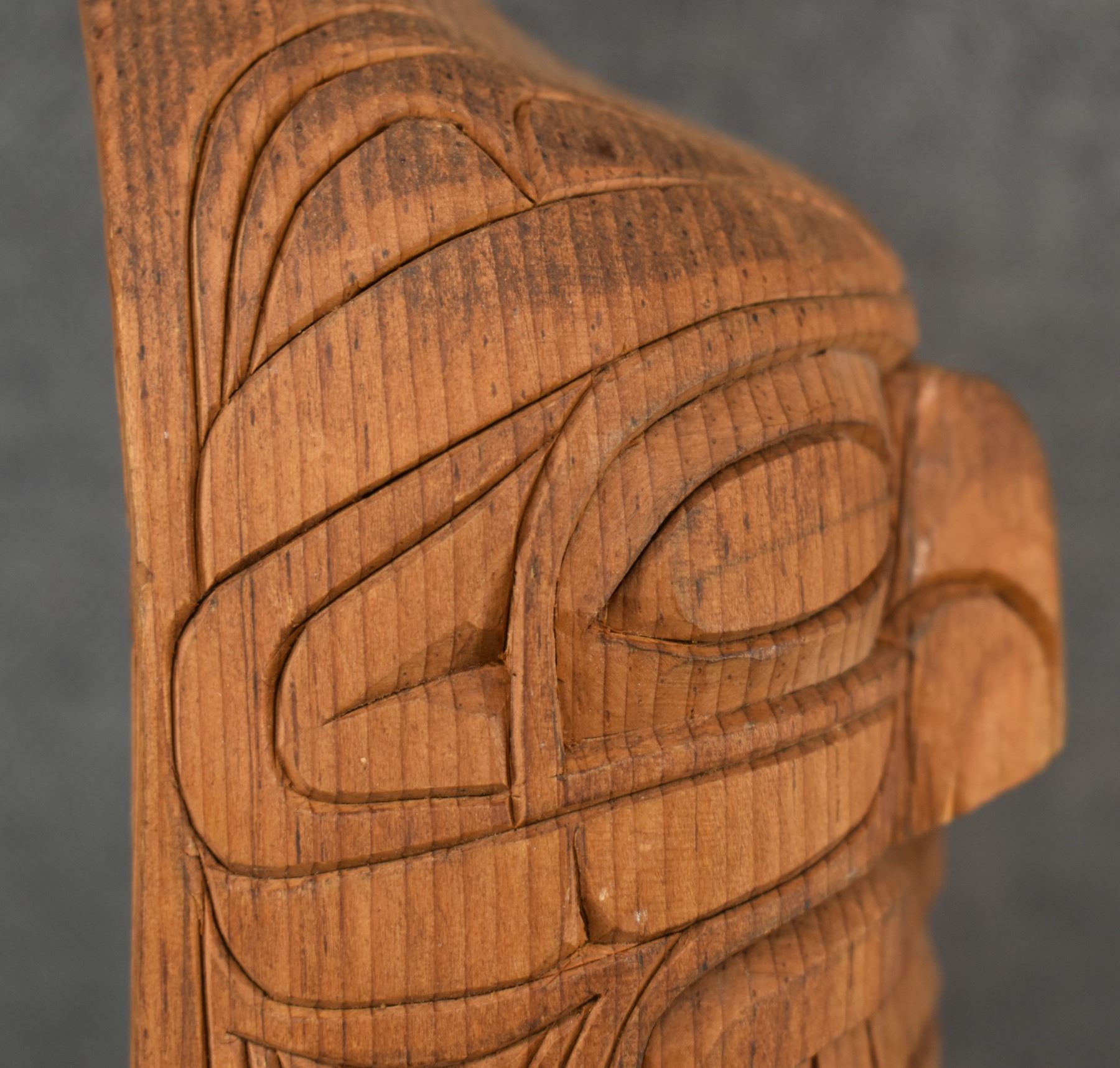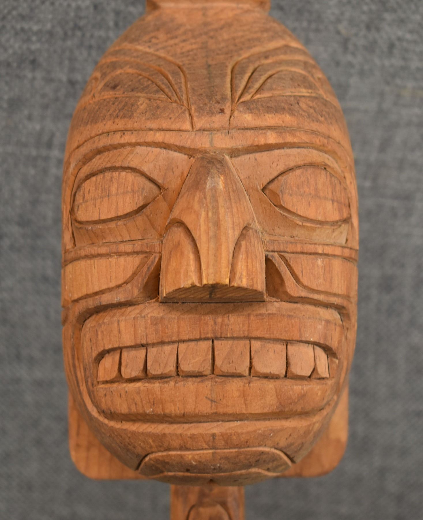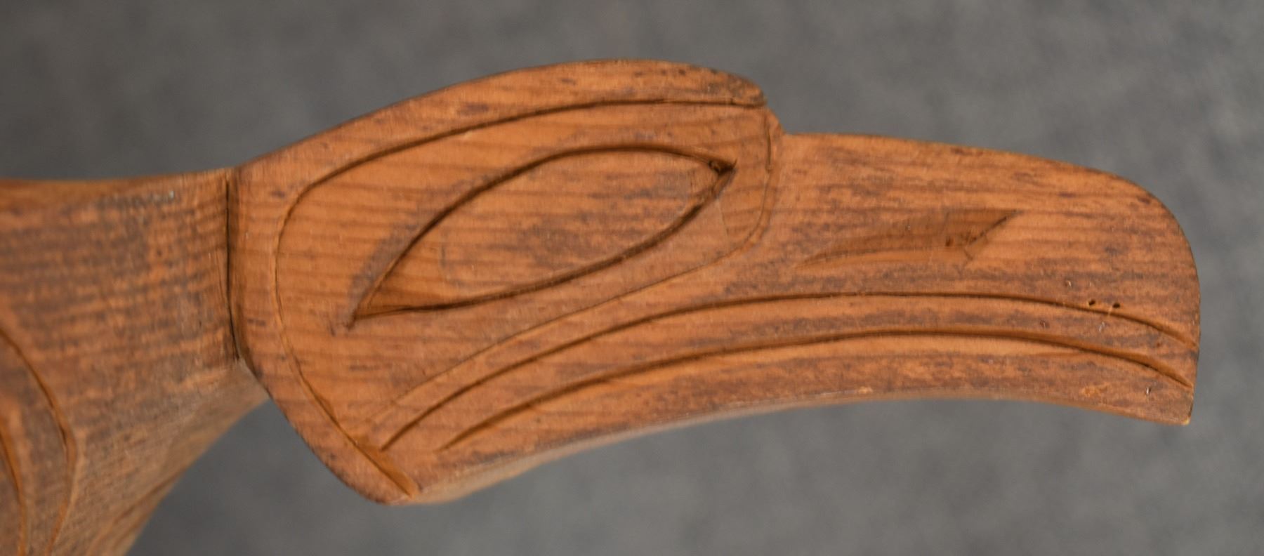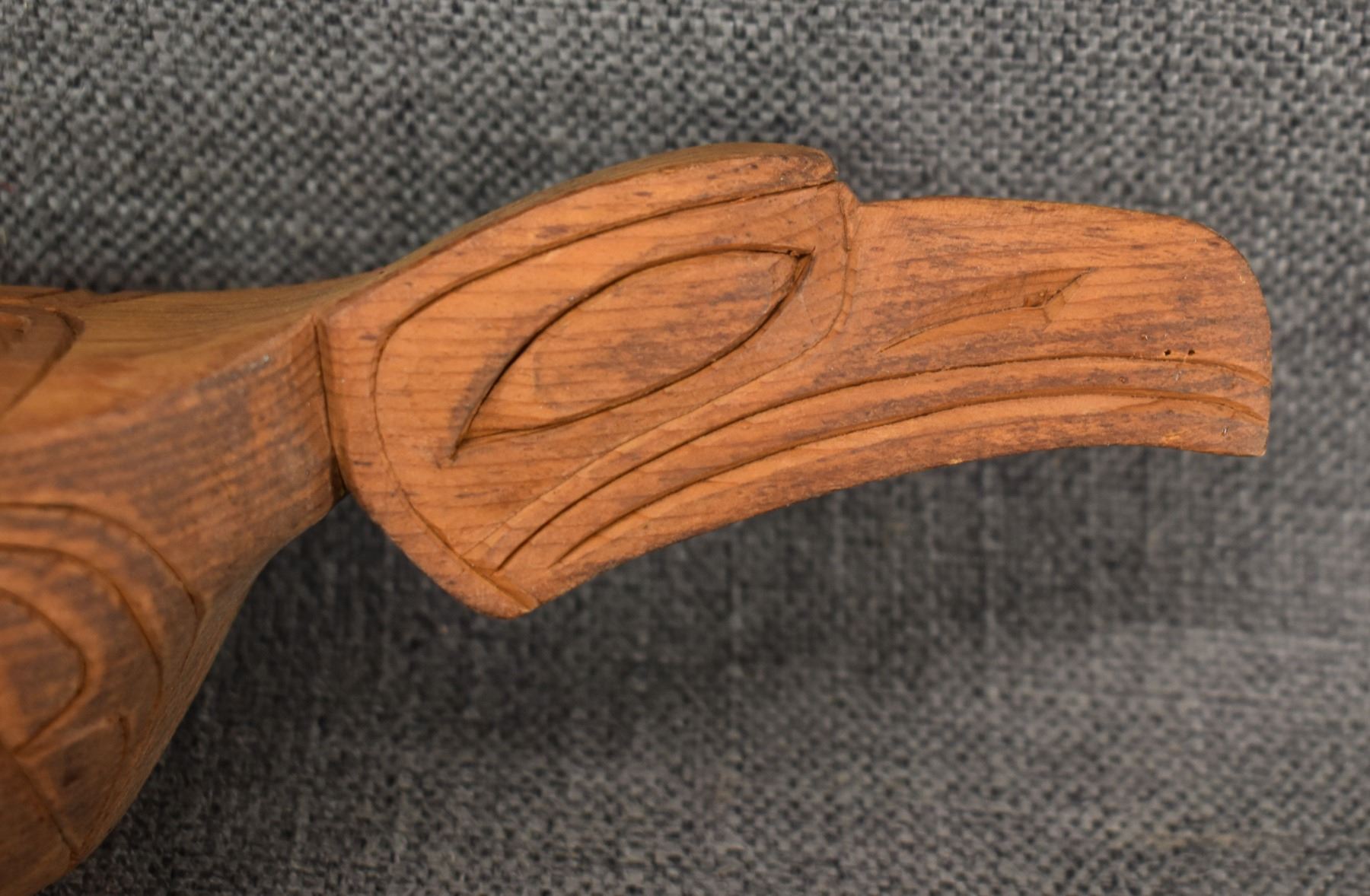 1980's Salish . Hand carved wooden rattle, signed Gary Rice. 15'' x 4'' x 3.5''