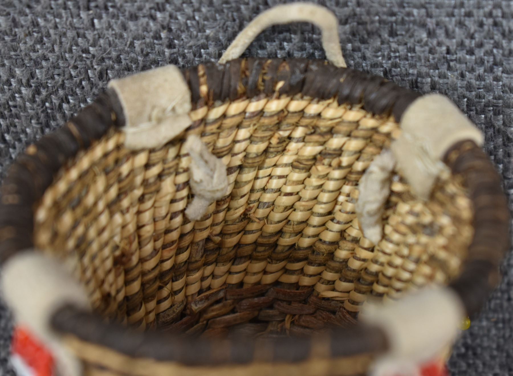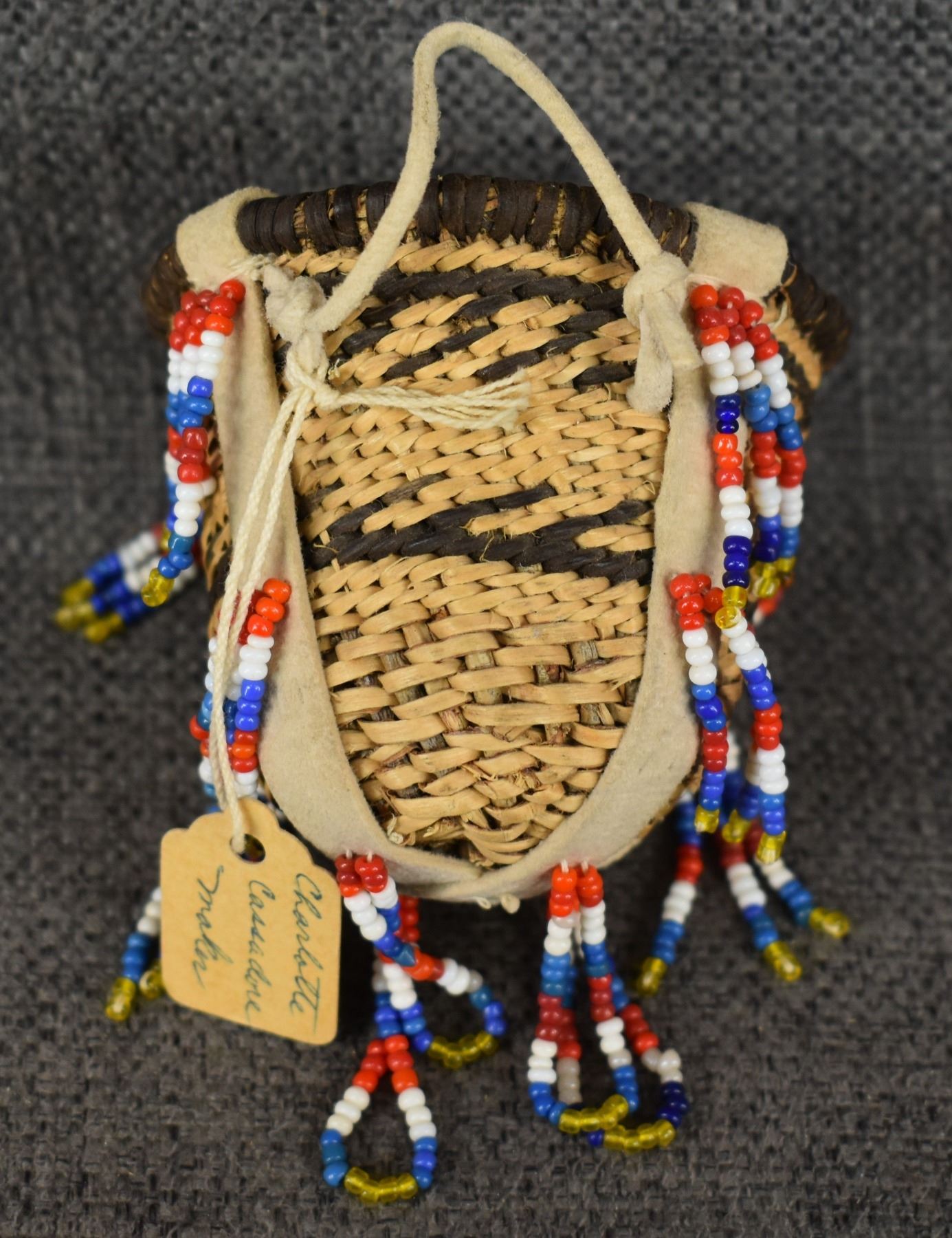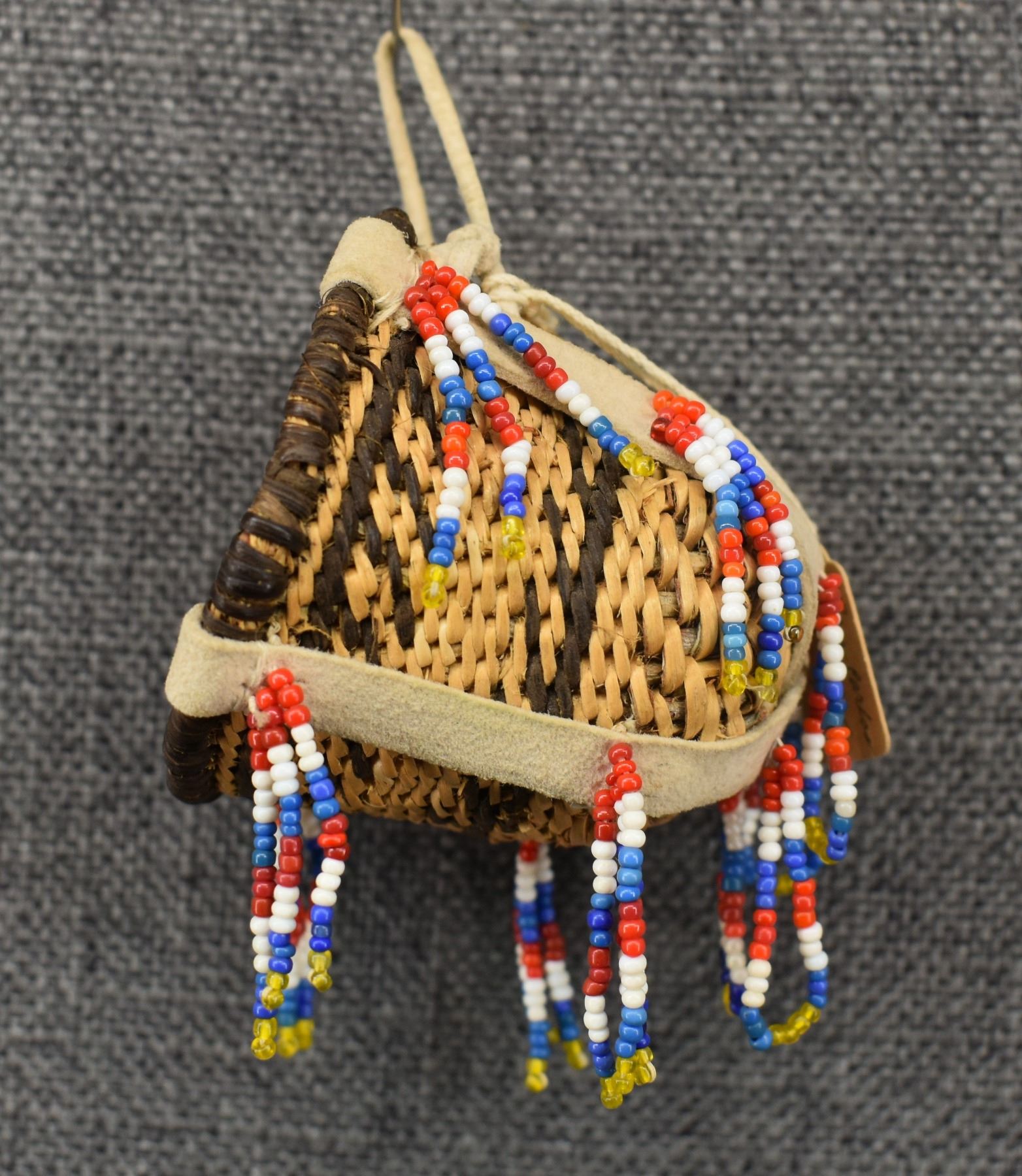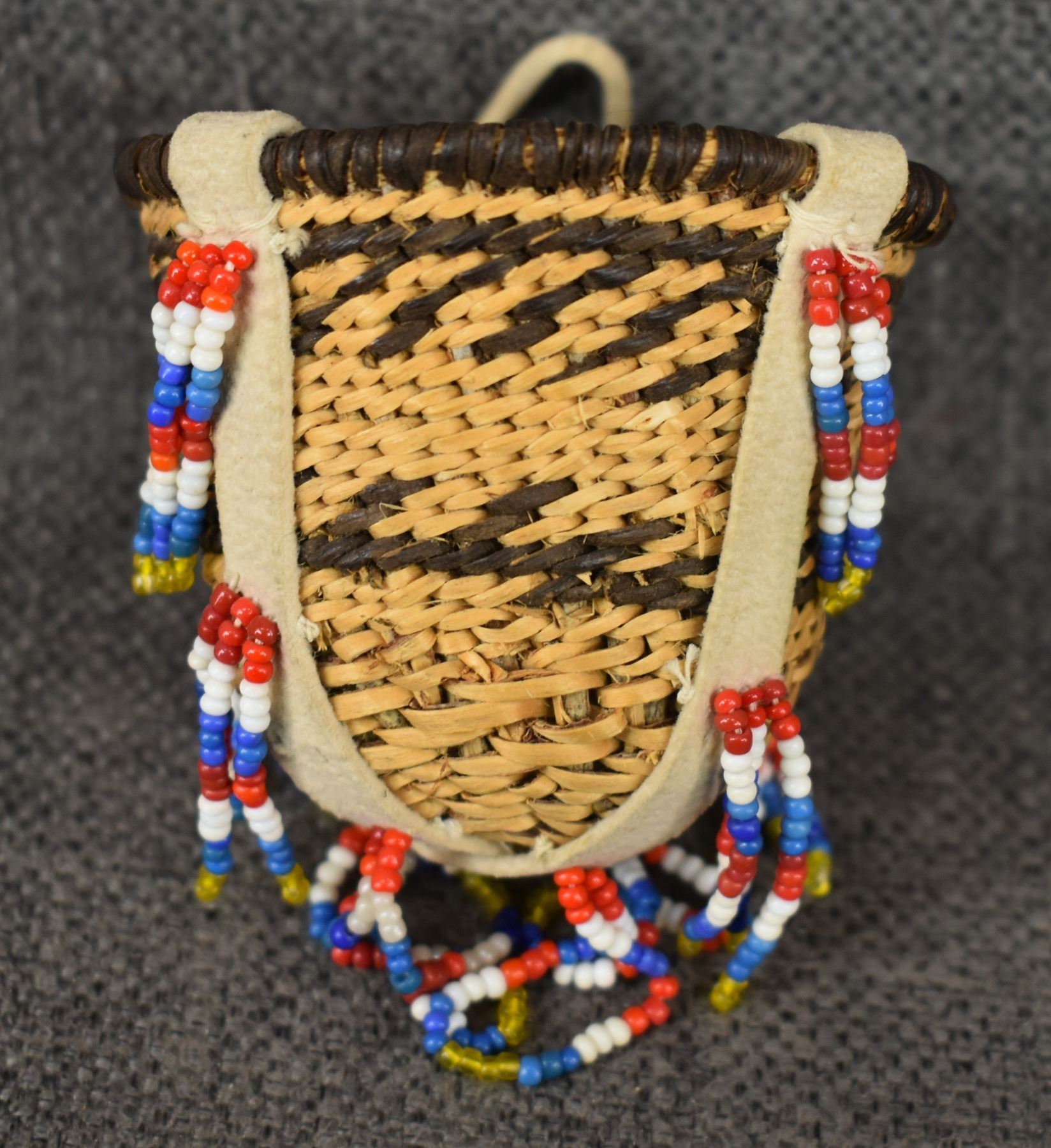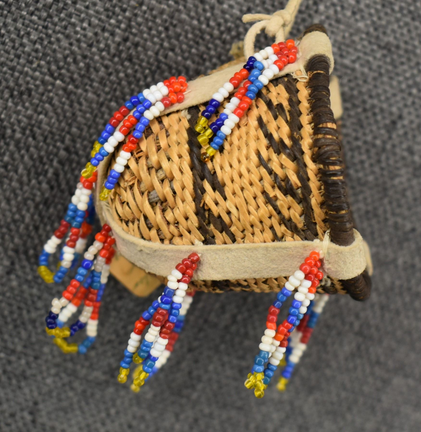 1960's San Carlos Apache. Hand woven banded and bead design miniature burden basket by Charlotte Cassadore. 3.5'' x 2.5''