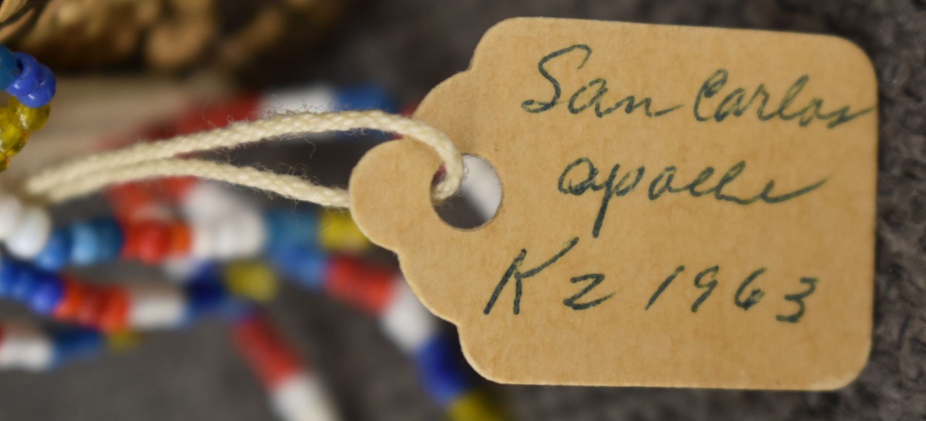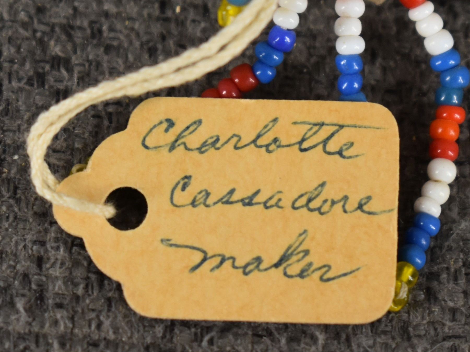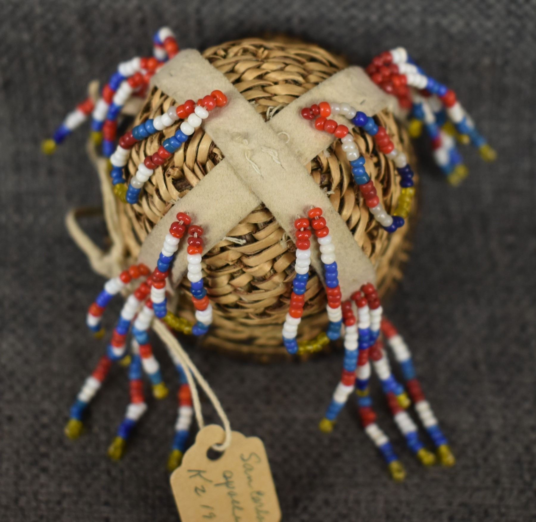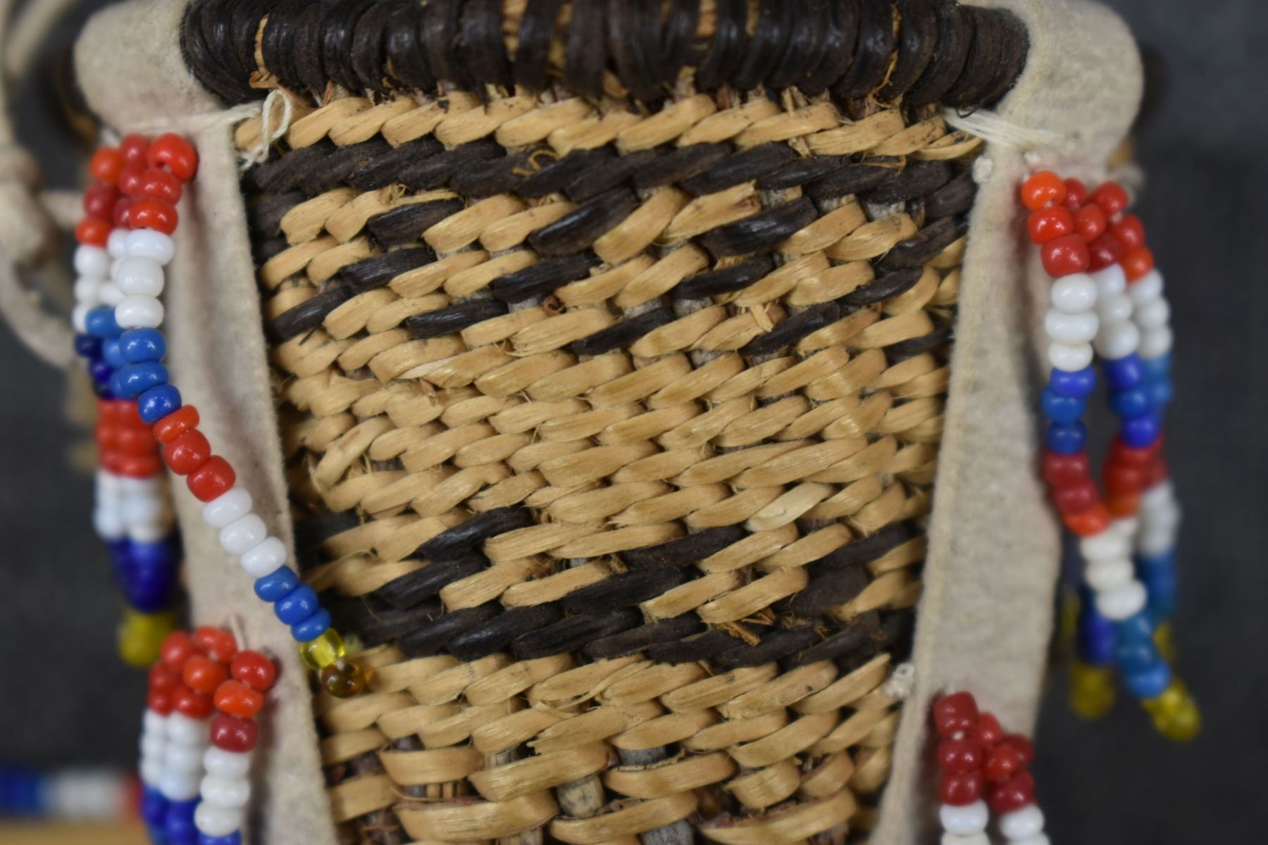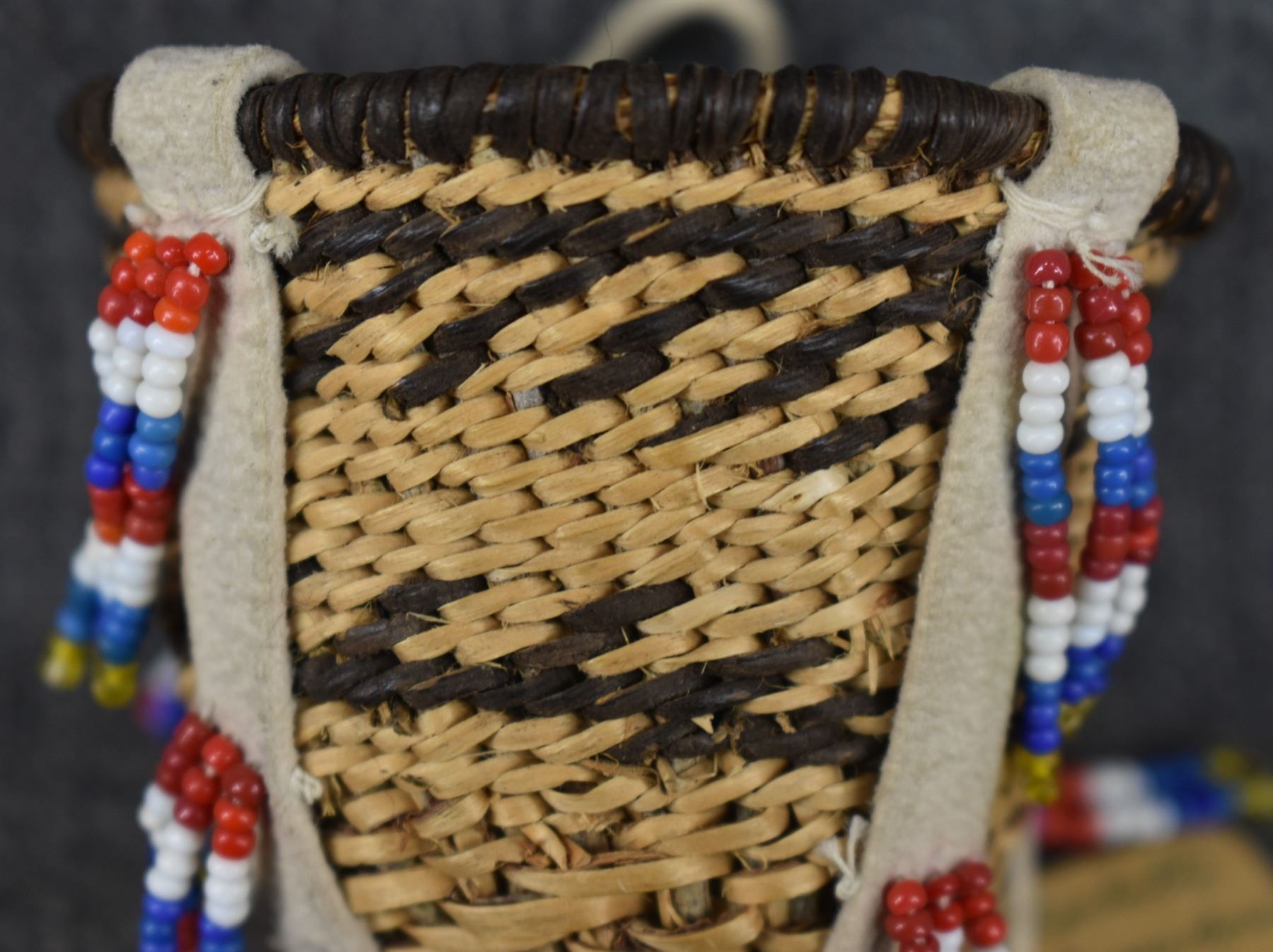 1960's San Carlos Apache. Hand woven banded and bead design miniature burden basket by Charlotte Cassadore. 3.5'' x 2.5''