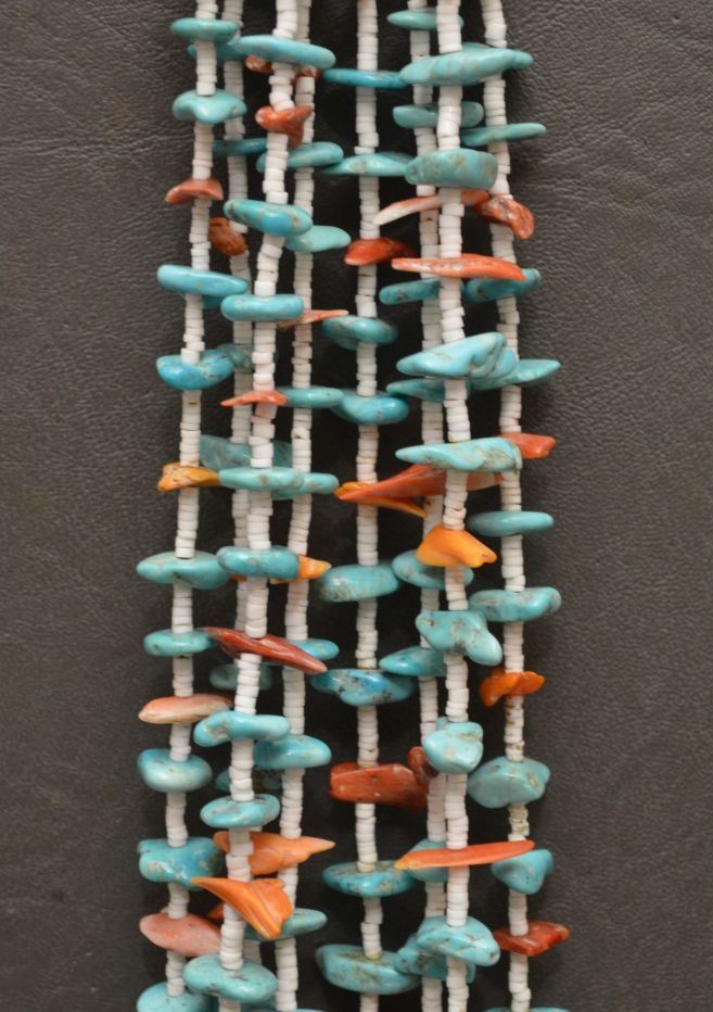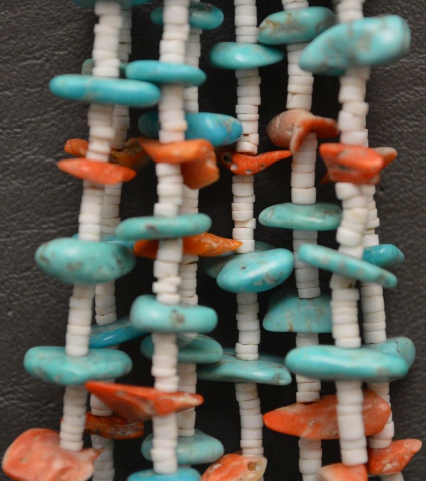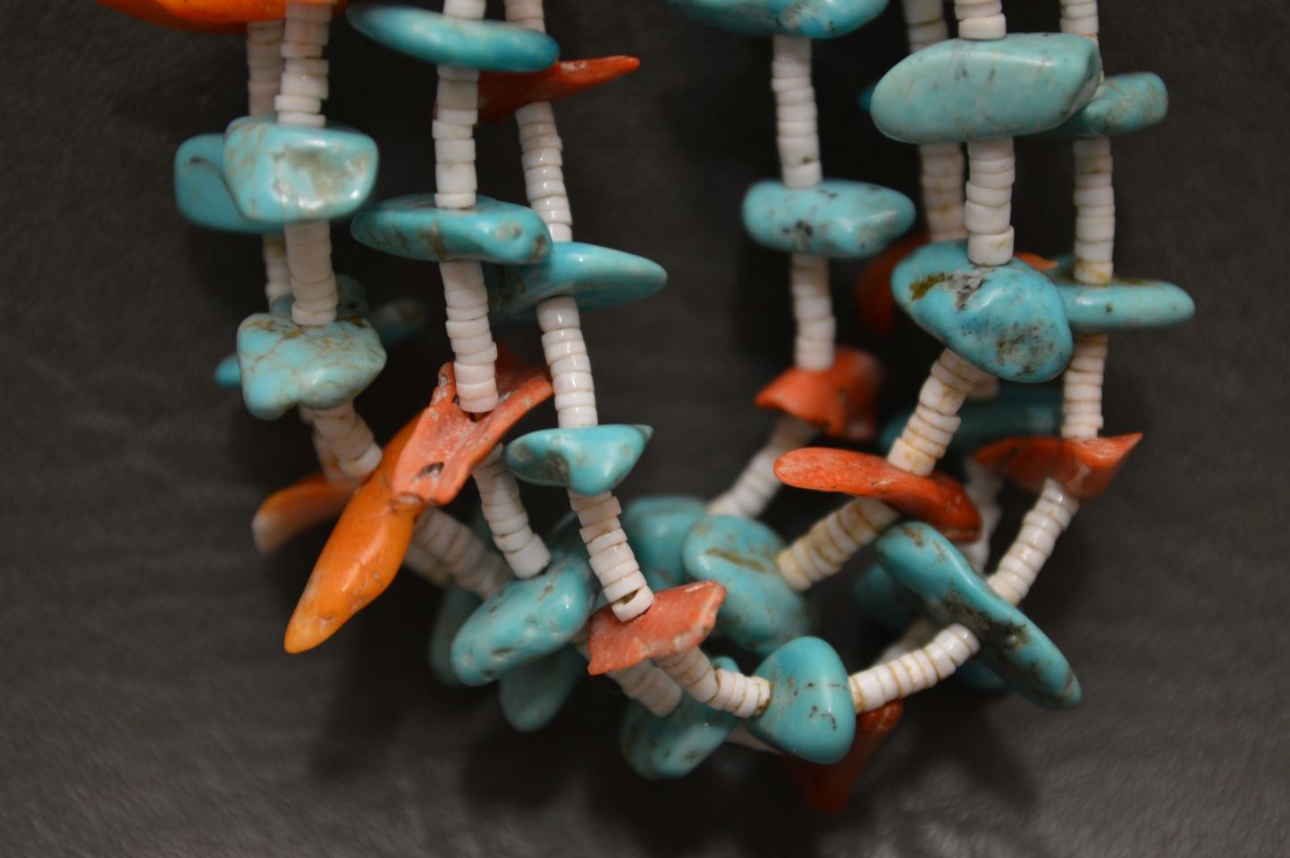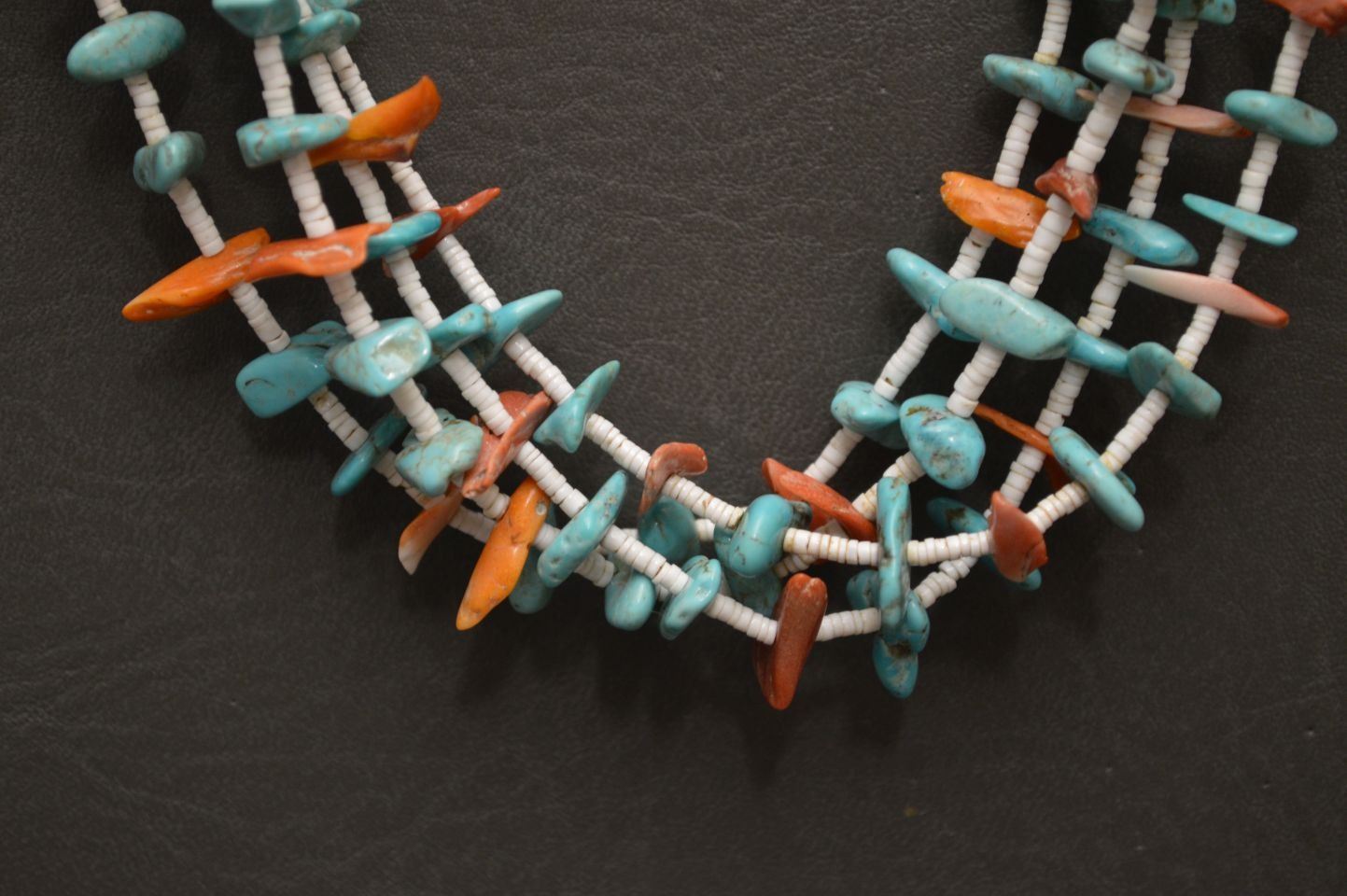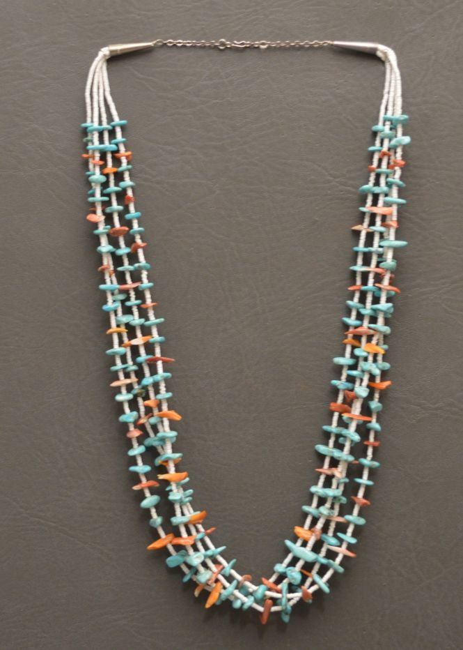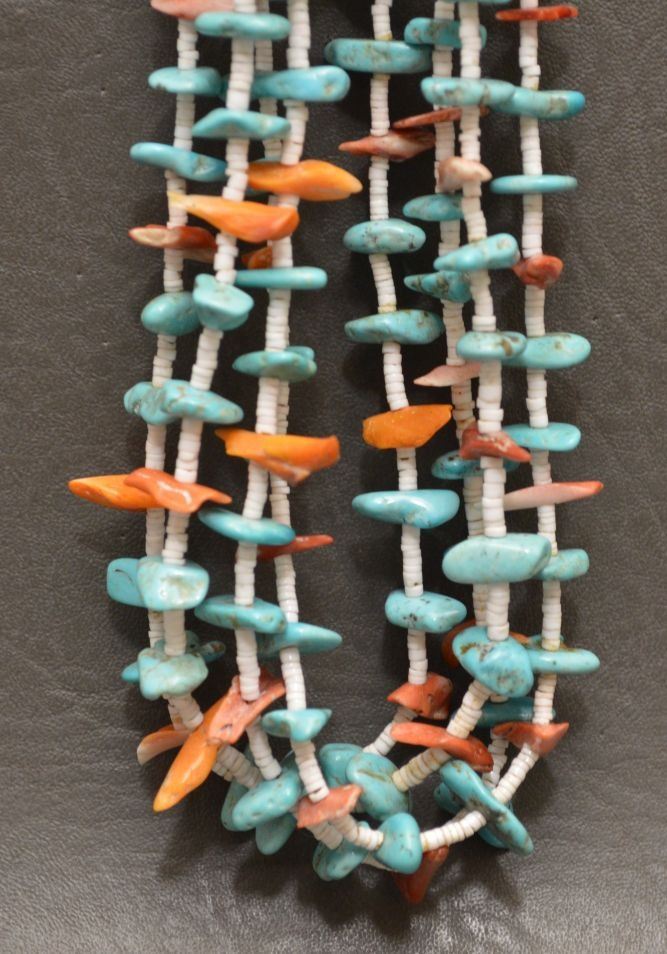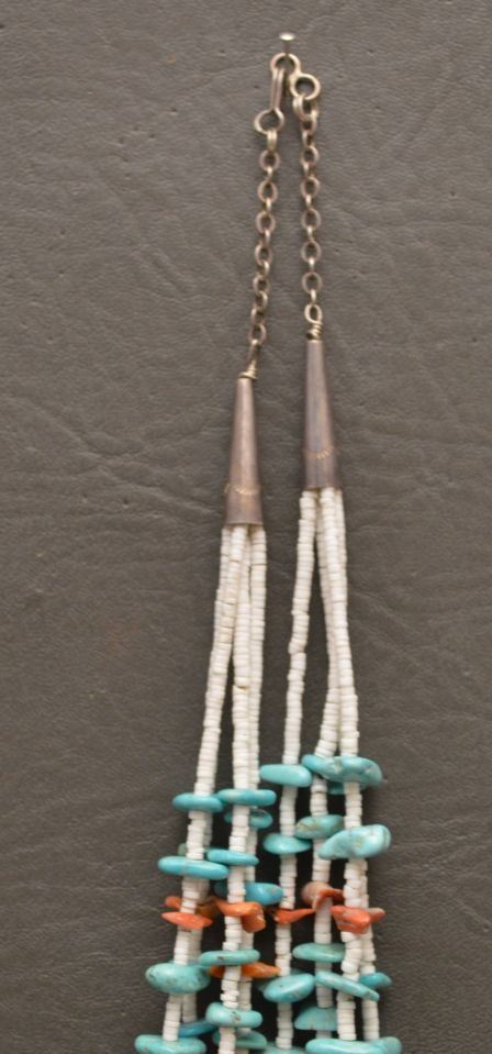 1980's san Domingo Indian. Four strand shell heshie turquoise and shell necklace,28'' long