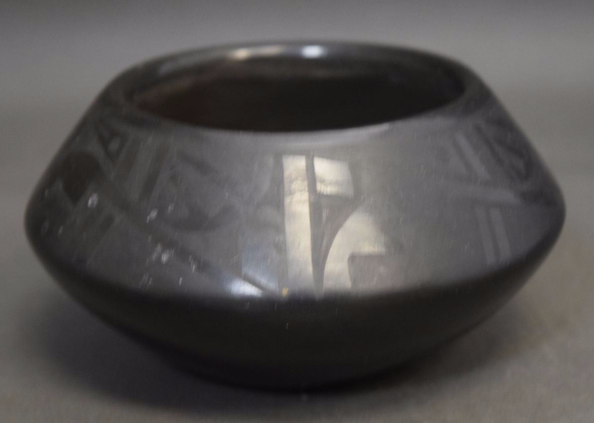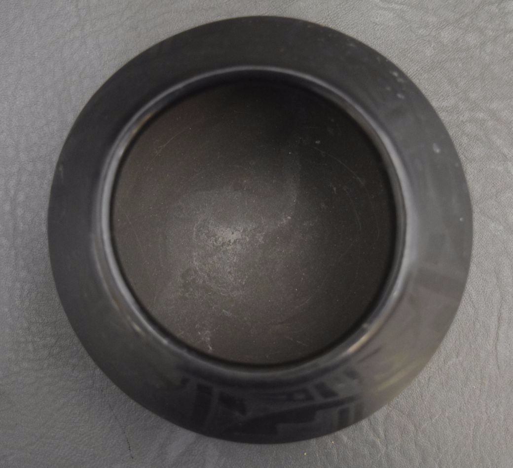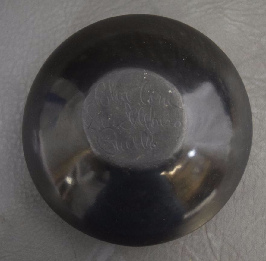 1970's matt on black geometric design pottery bowl signed Blue corn. 2.5'' x 5''
