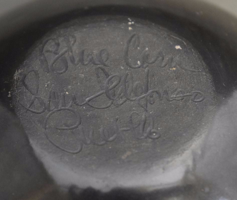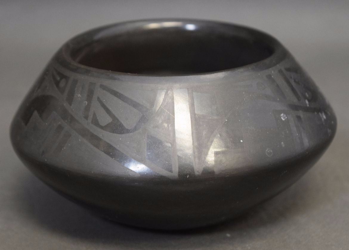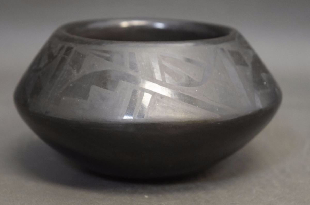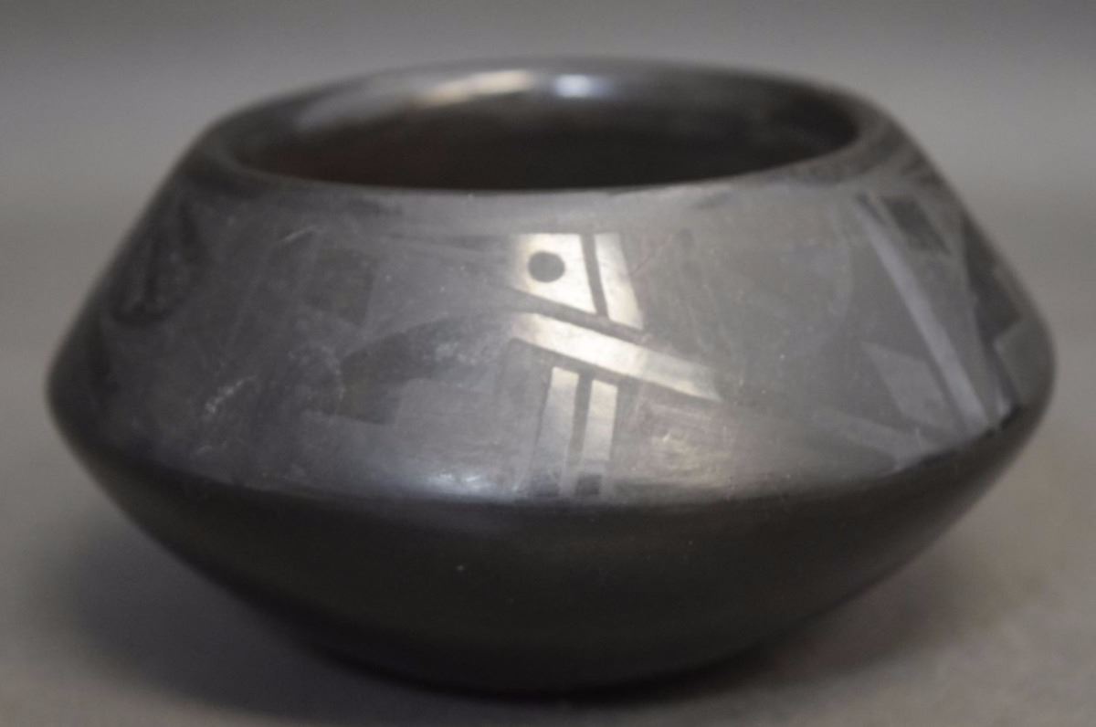 1970's matt on black geometric design pottery bowl signed Blue corn. 2.5'' x 5''
