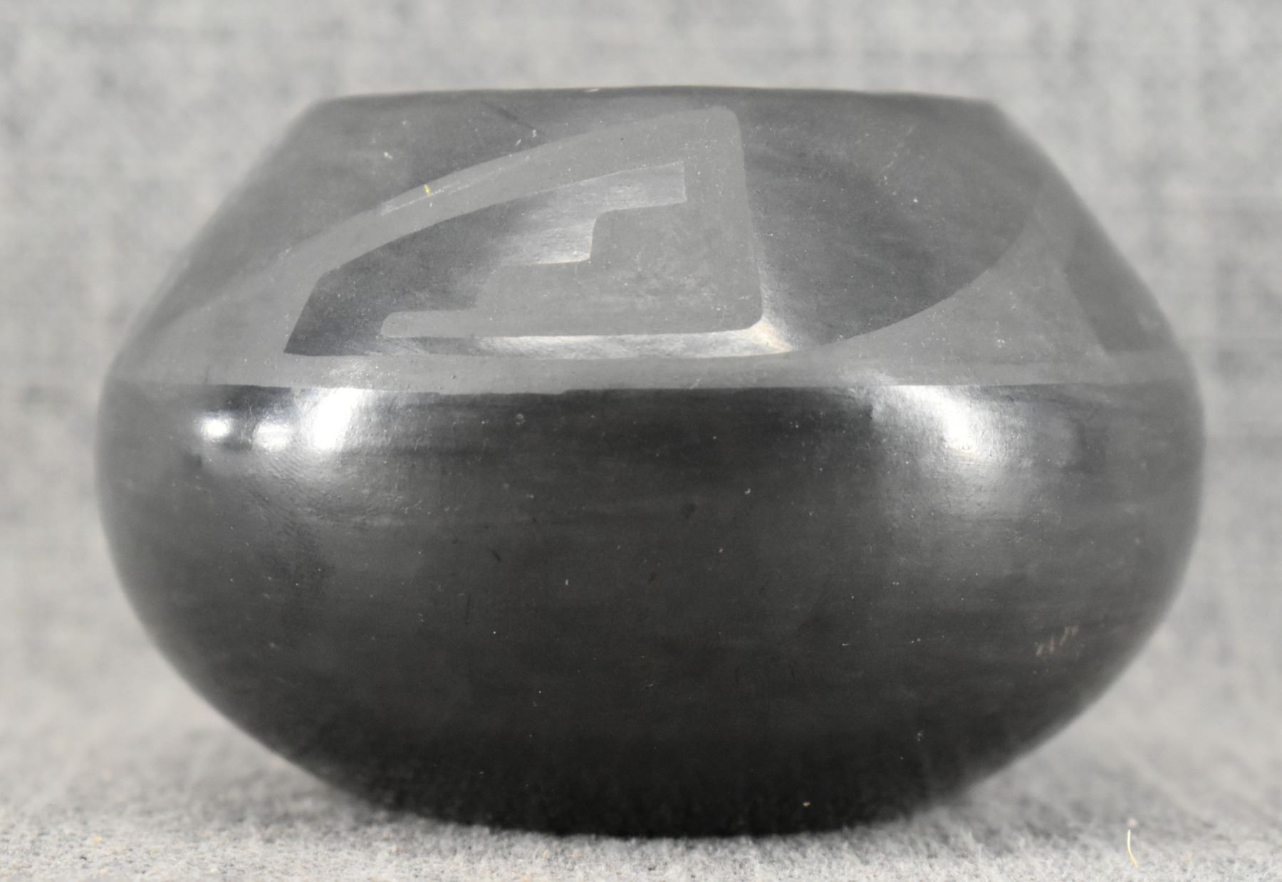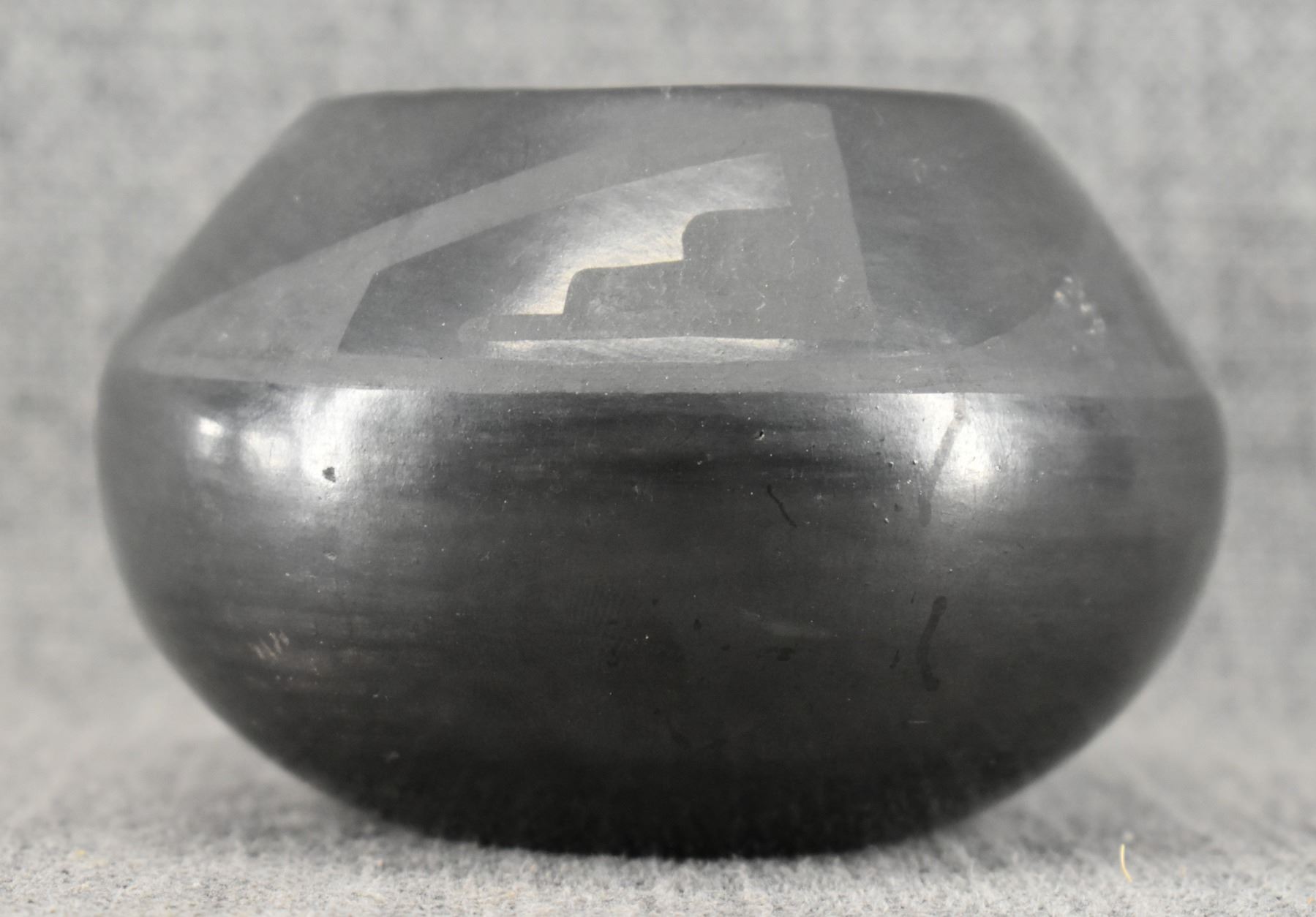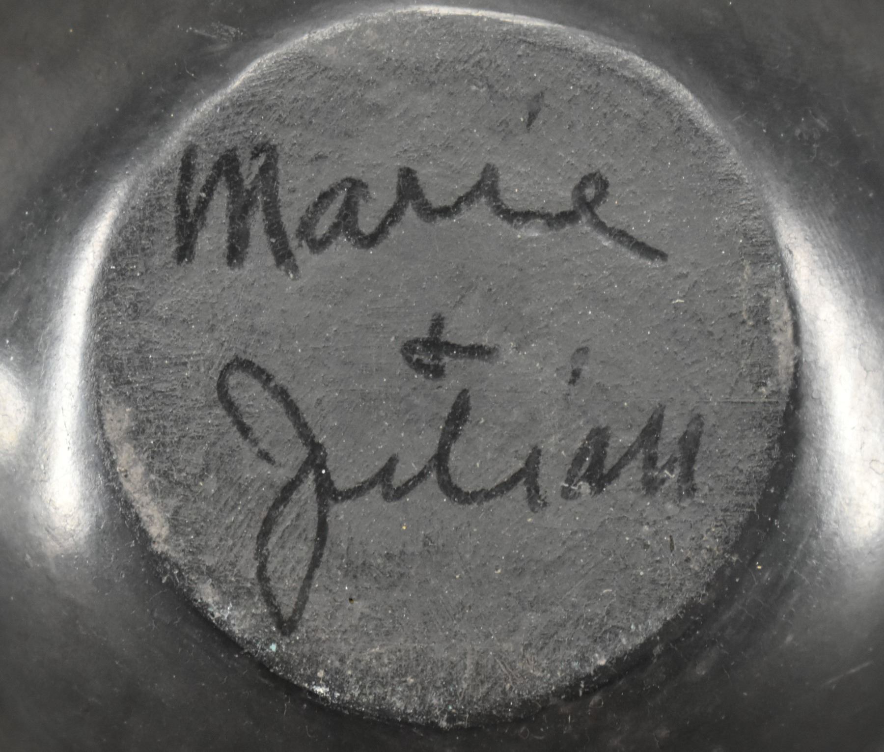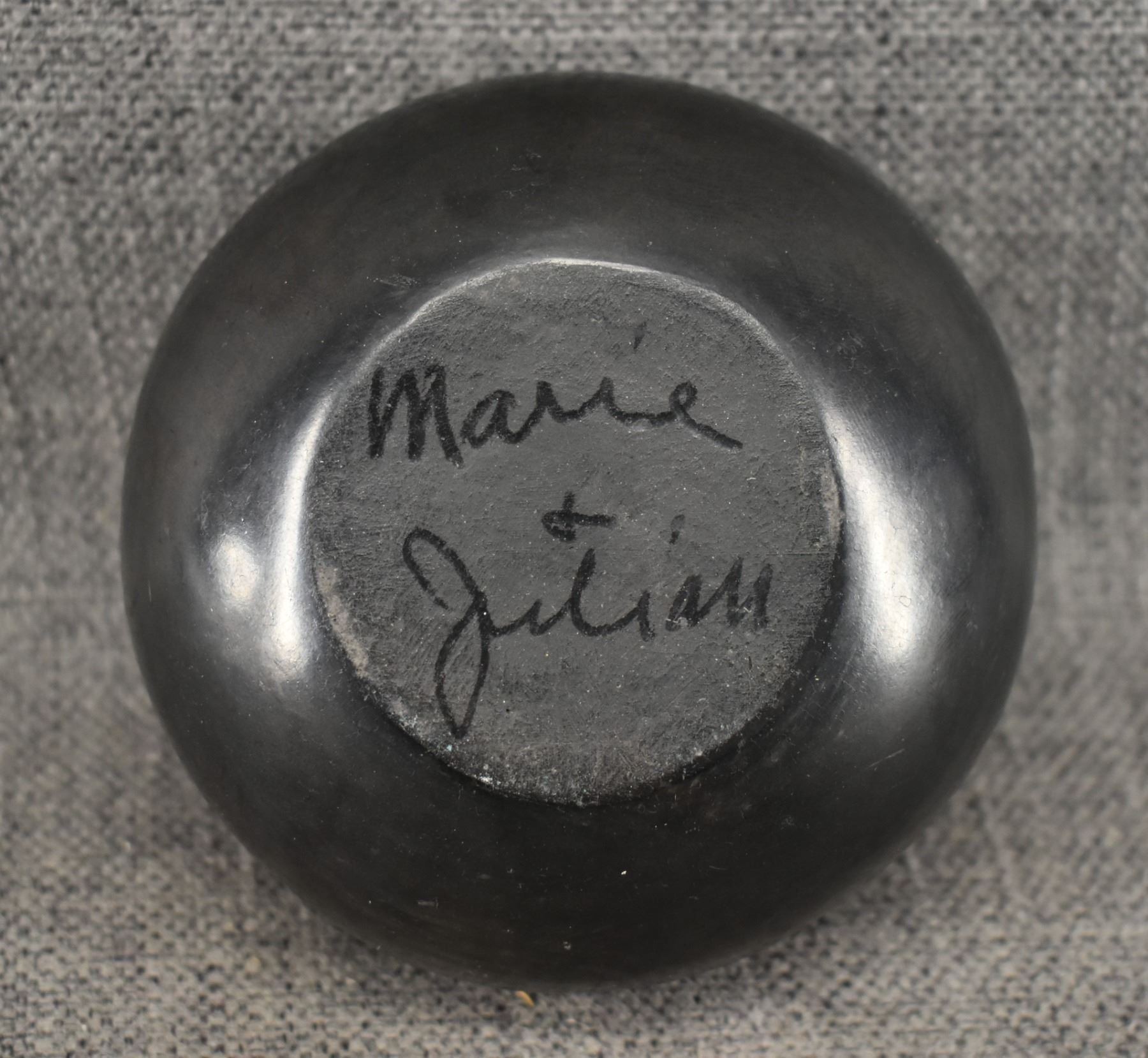1940's San Ildefonso. Hand coiled and painted matt on black design pottery bowl. Signed Marie & Julian. 2.75'' x 4.5''