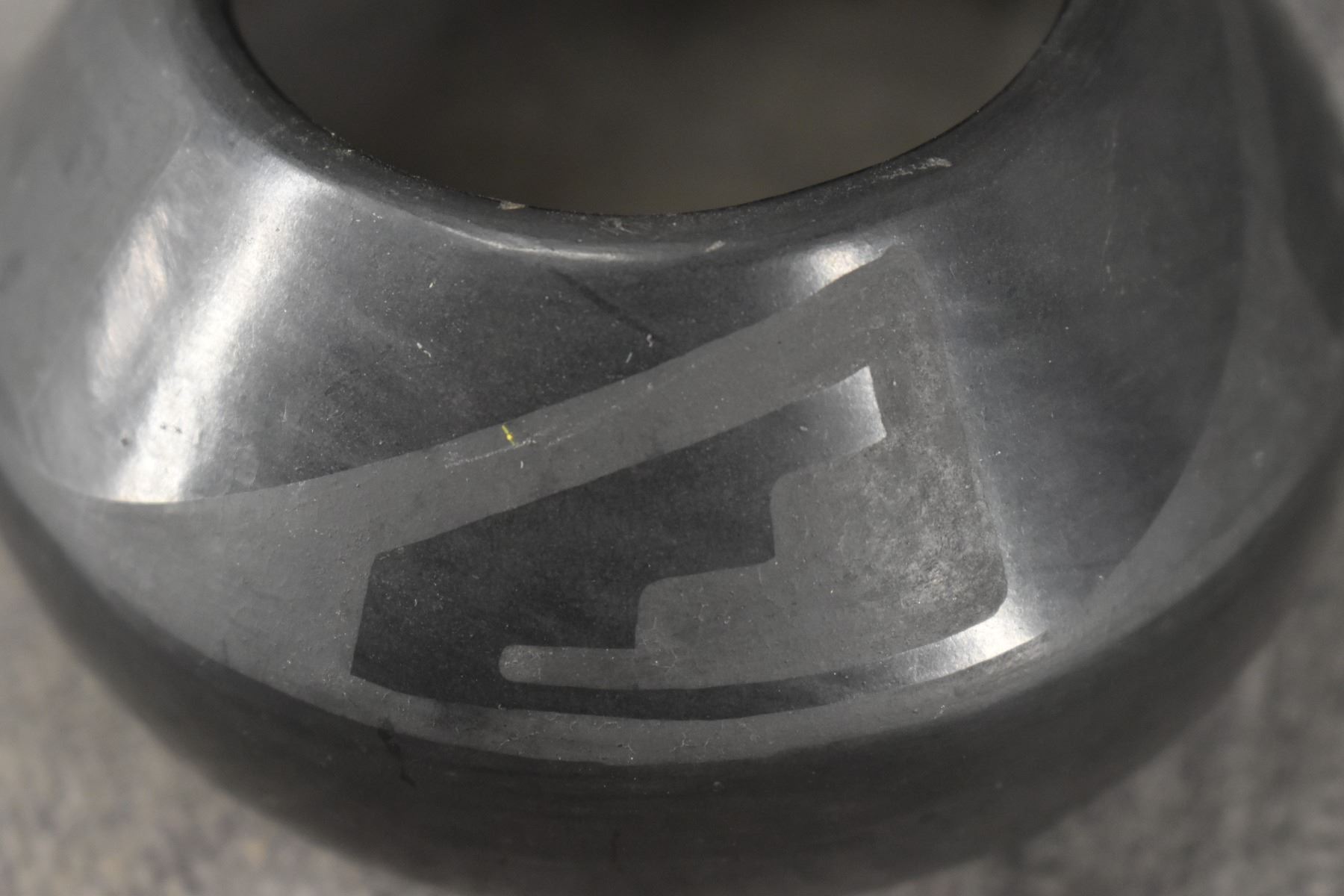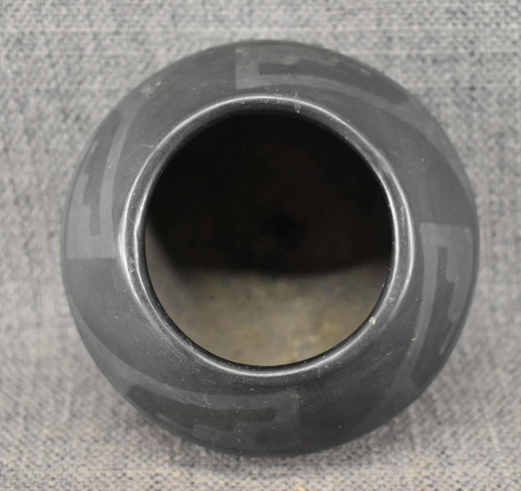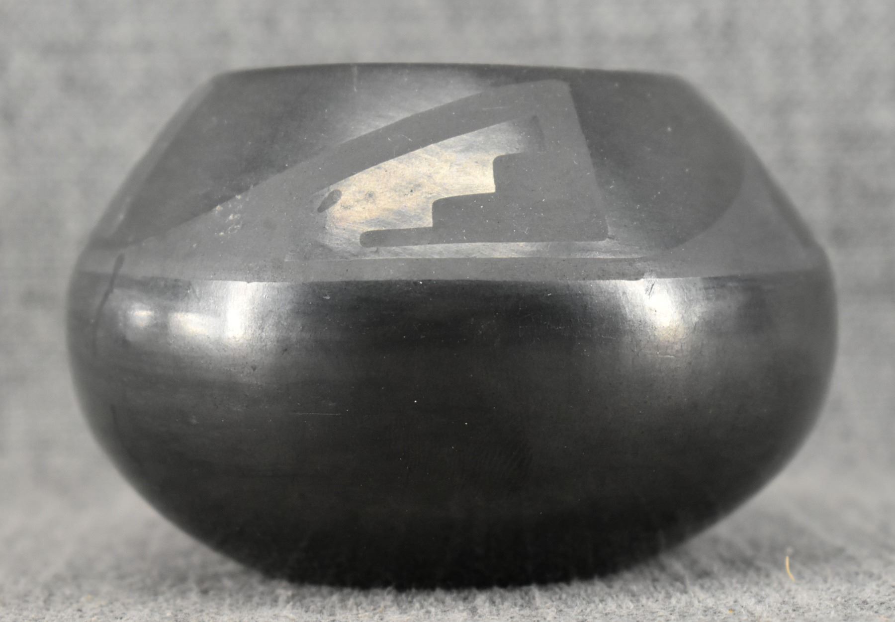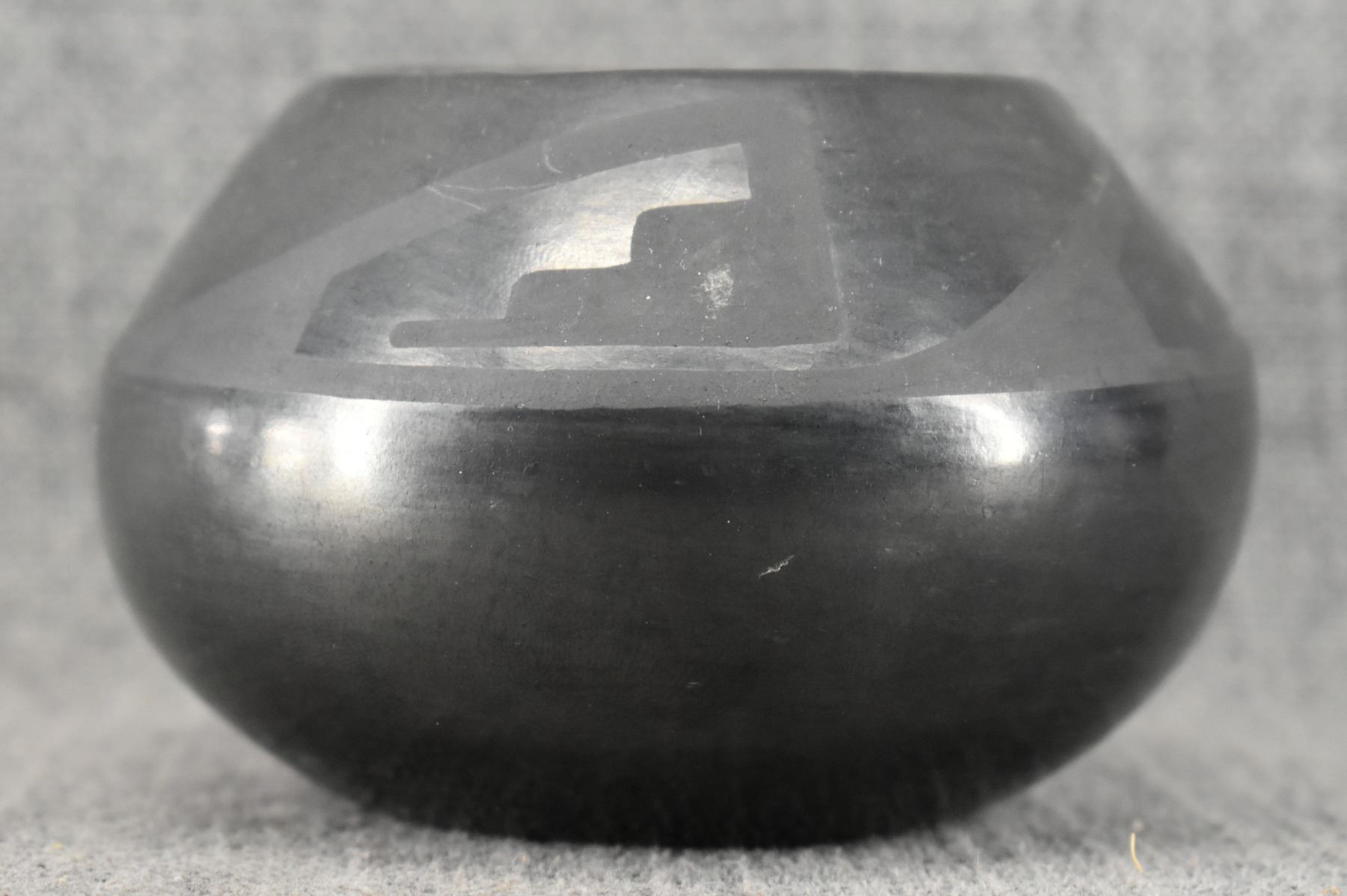 1940's San Ildefonso. Hand coiled and painted matt on black design pottery bowl. Signed Marie & Julian. 2.75'' x 4.5''