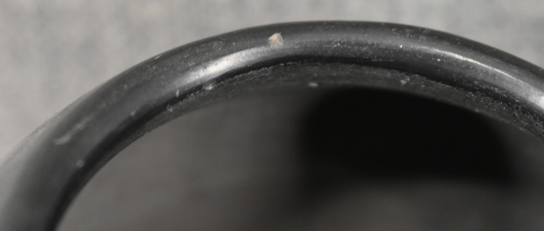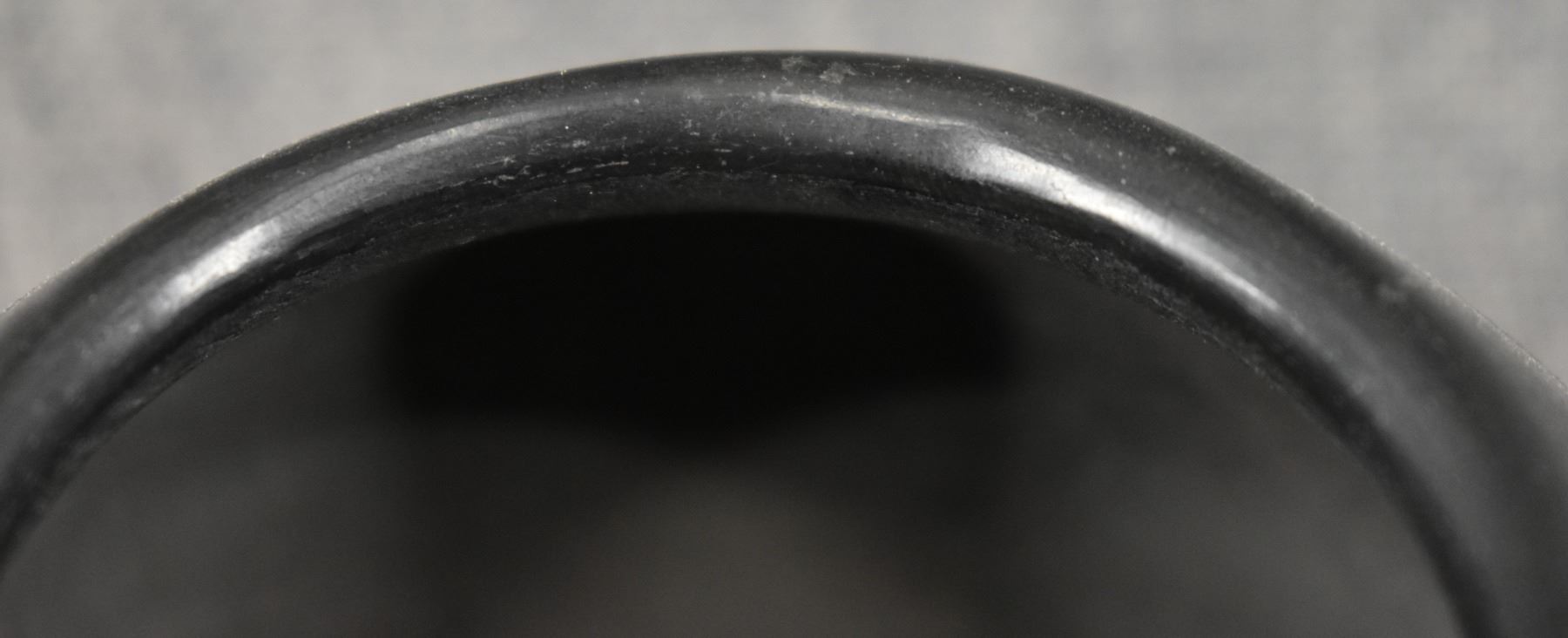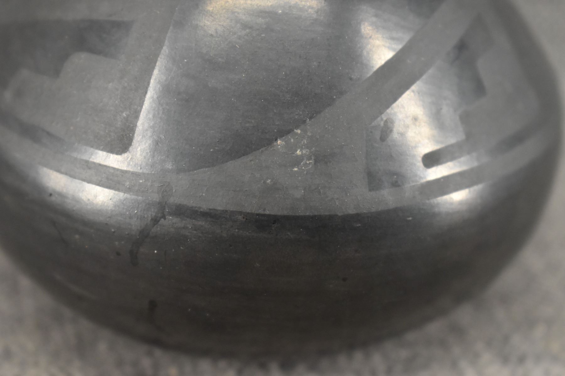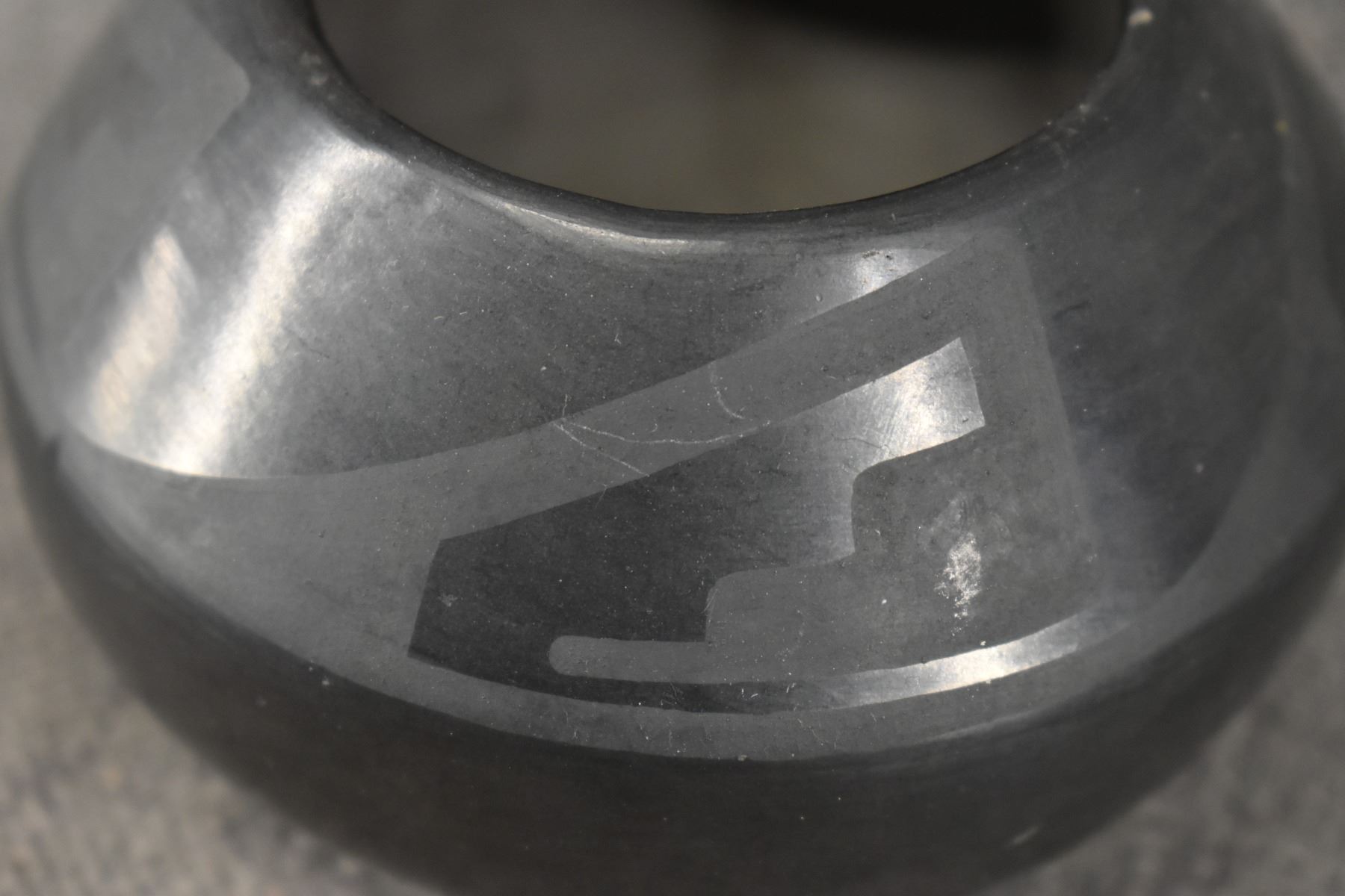 1940's San Ildefonso. Hand coiled and painted matt on black design pottery bowl. Signed Marie & Julian. 2.75'' x 4.5''