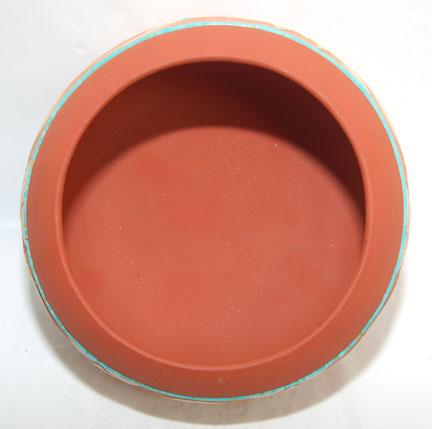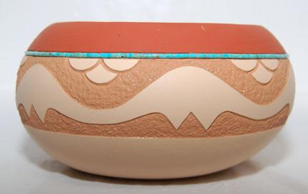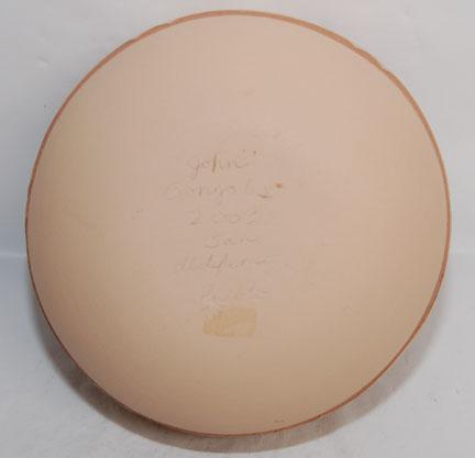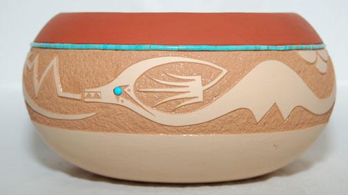 sgraffito design, avanyu with turquoise heshi, signed John Gonzales, 3” x 5.57”, 2005