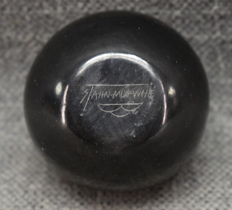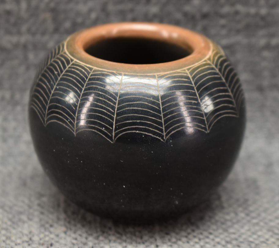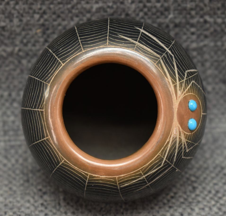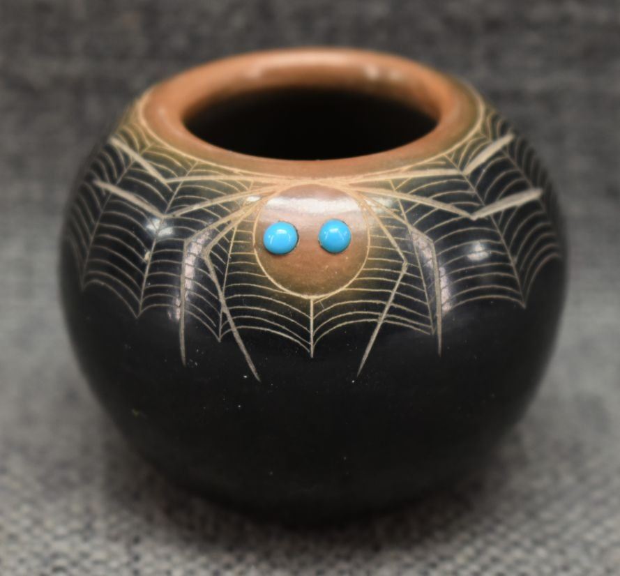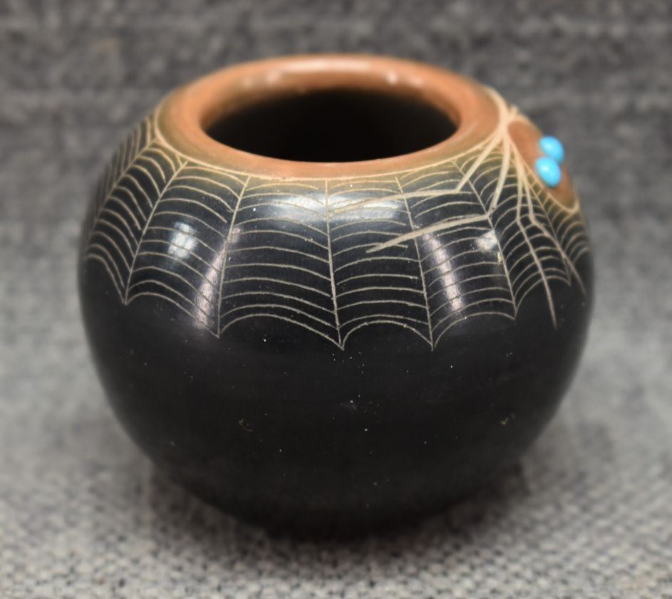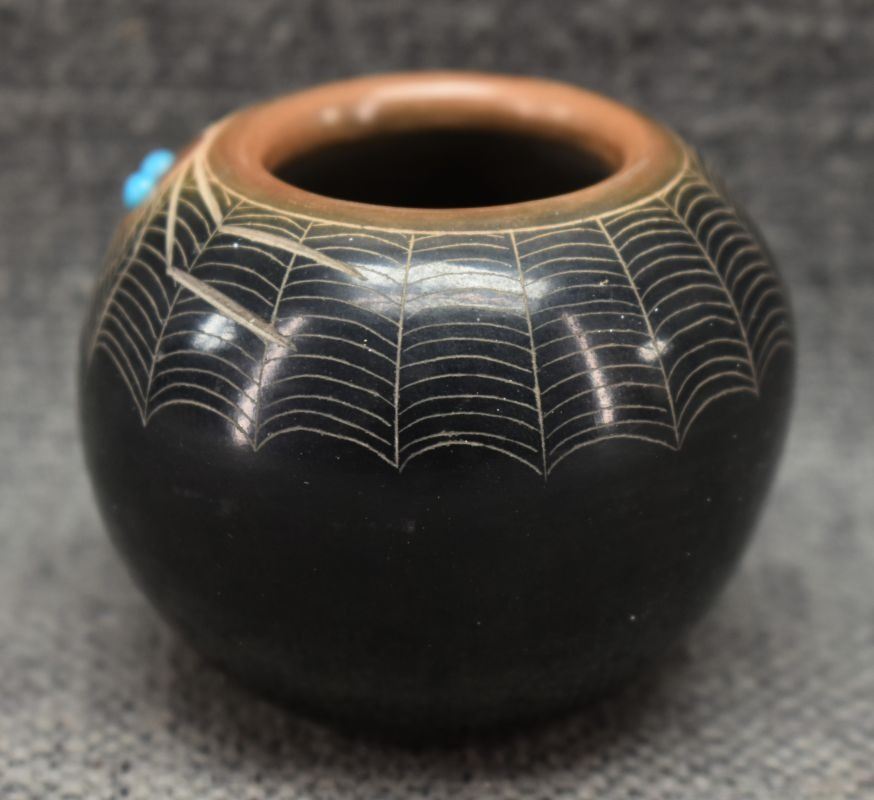 1970's/80's San Ildefonso, hand coiled with sgraffito design depicting spider in web with inlay turquoise with eyes signed Than-Moo-Whe for Barbara Gonzales. 1.75" x 2.25"