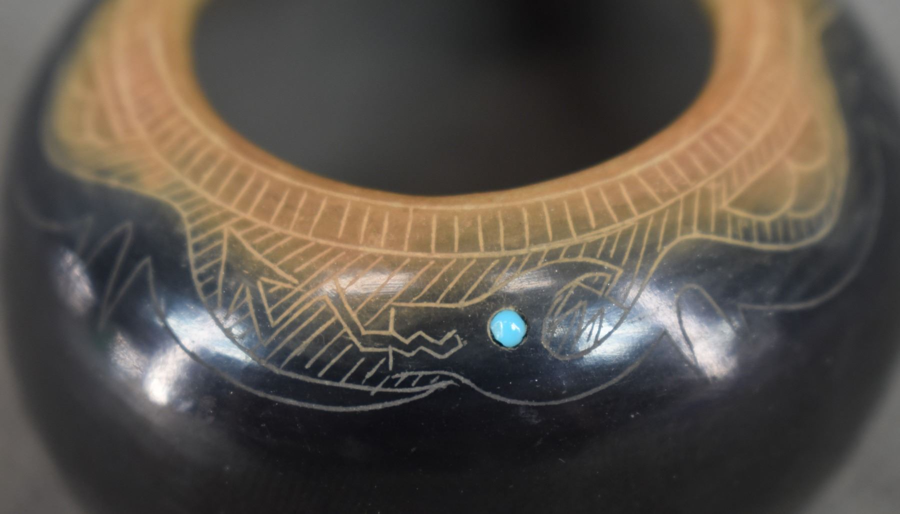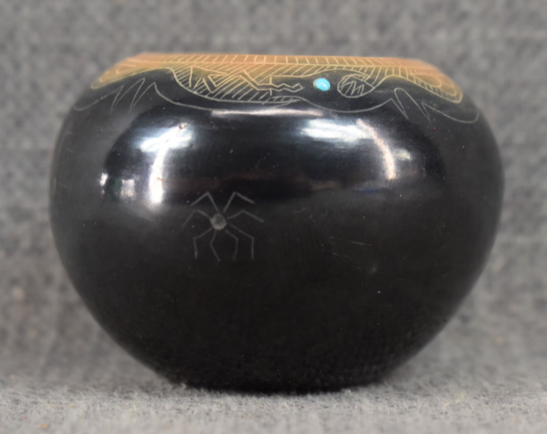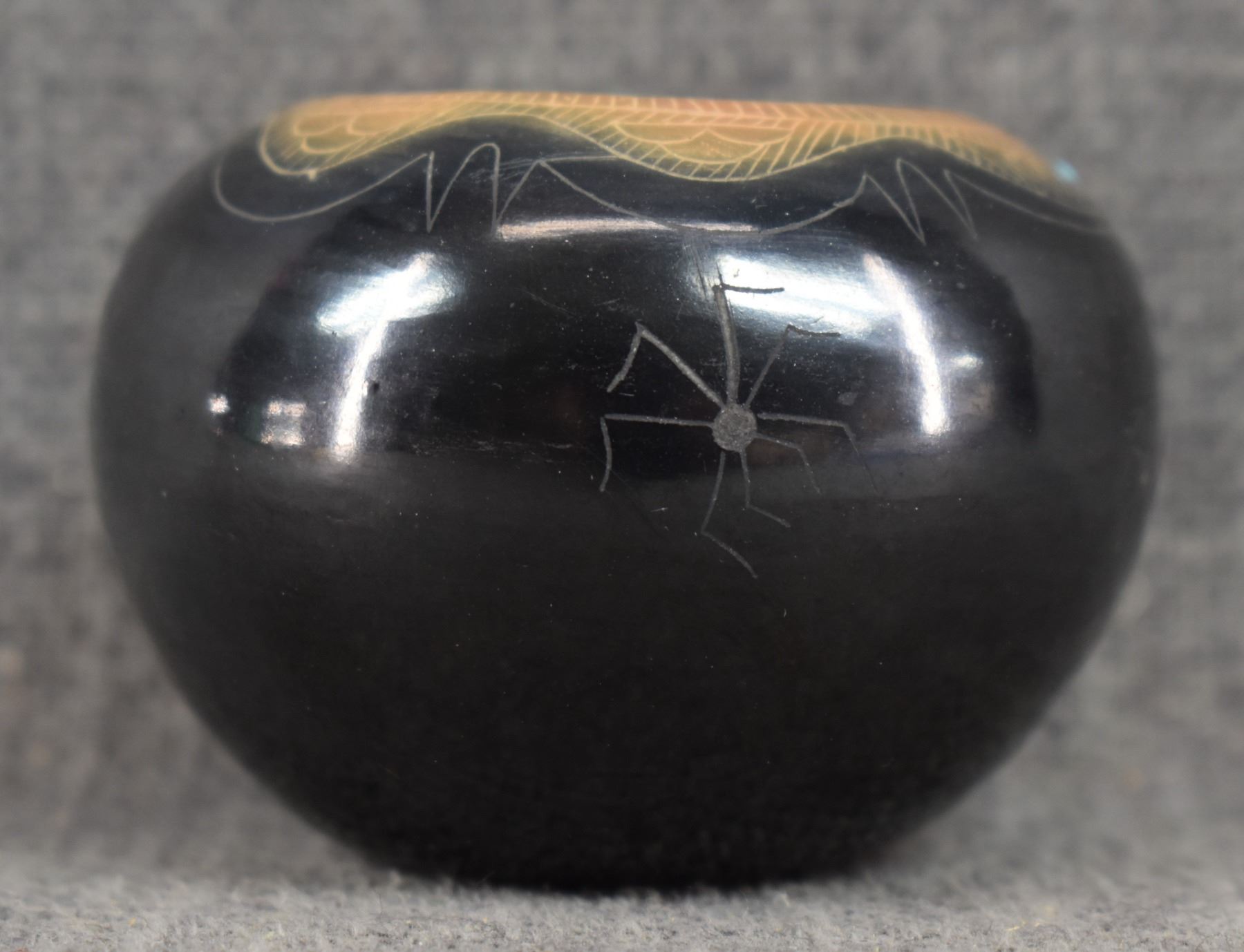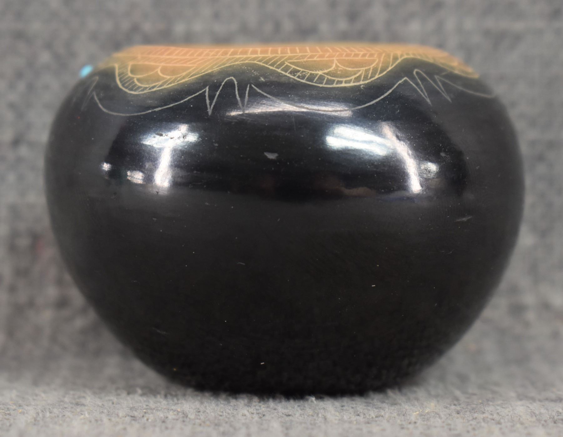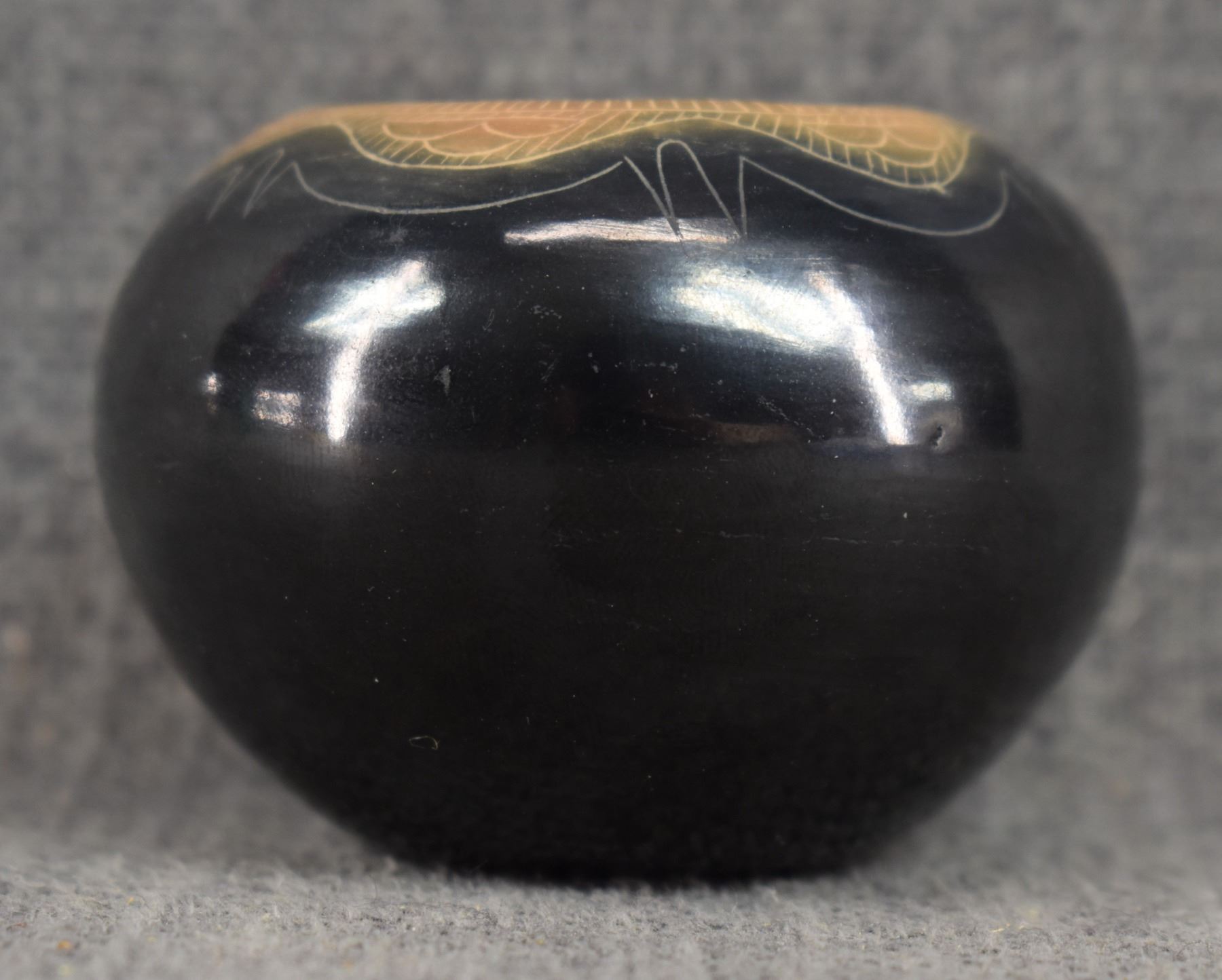 1980's black ware with sgraffito Avanyu design pottery jar signed Stan-moo- when for Barbara Gonzales. 2'' x 2.75''