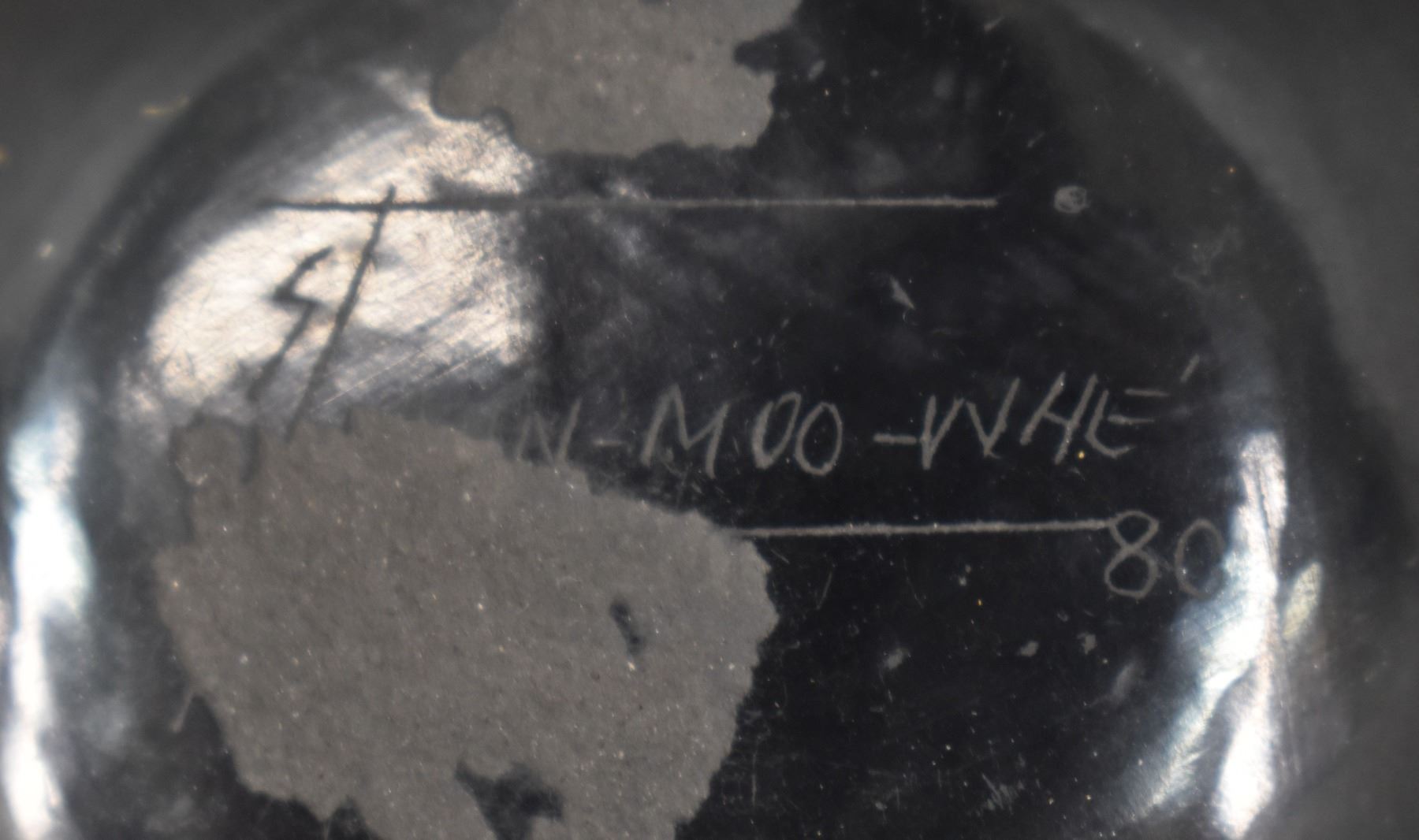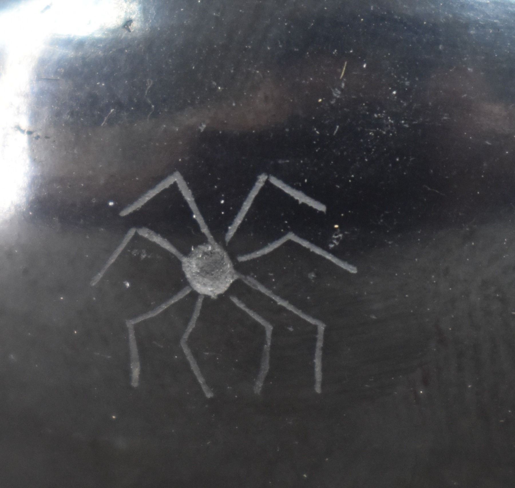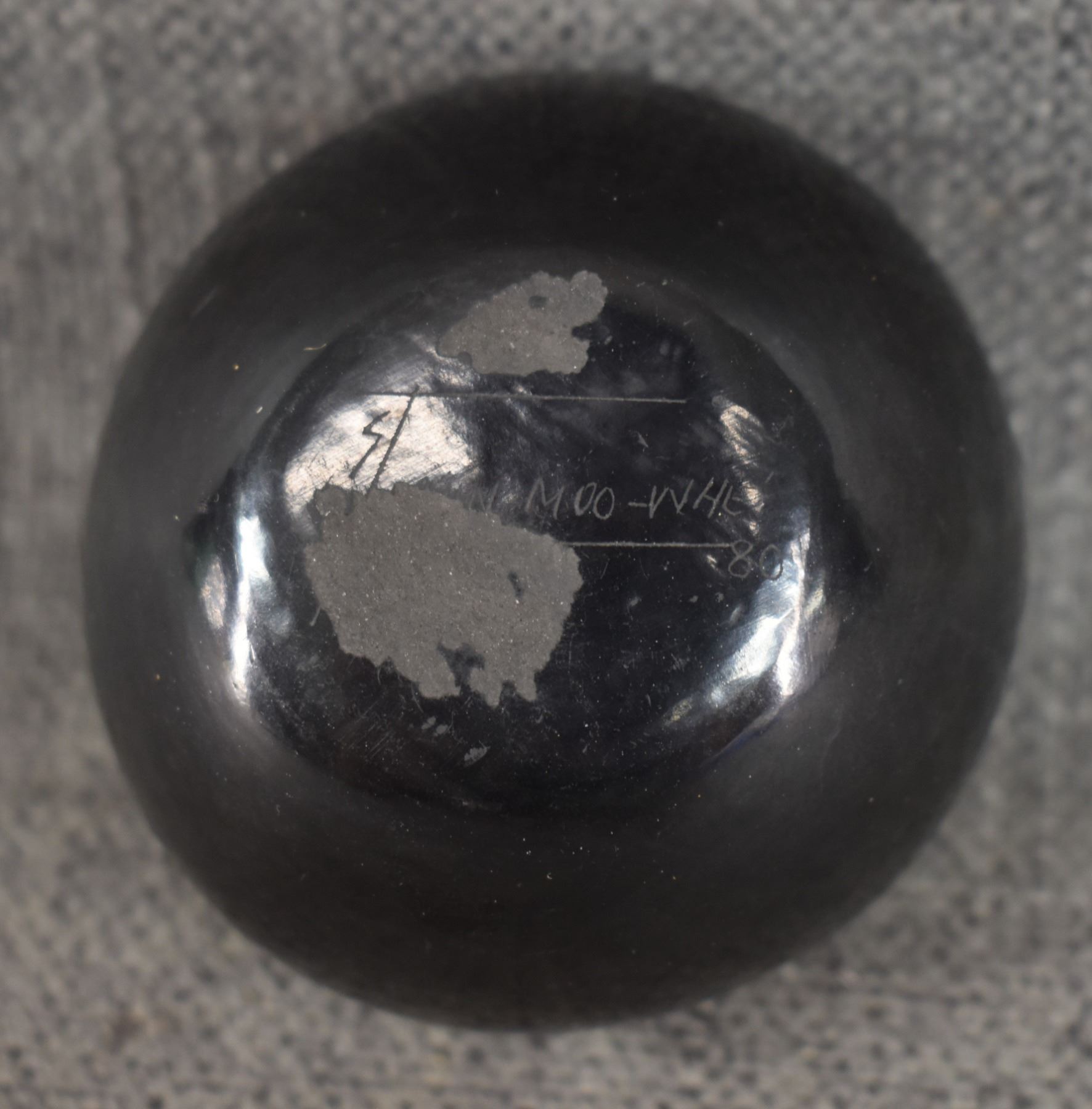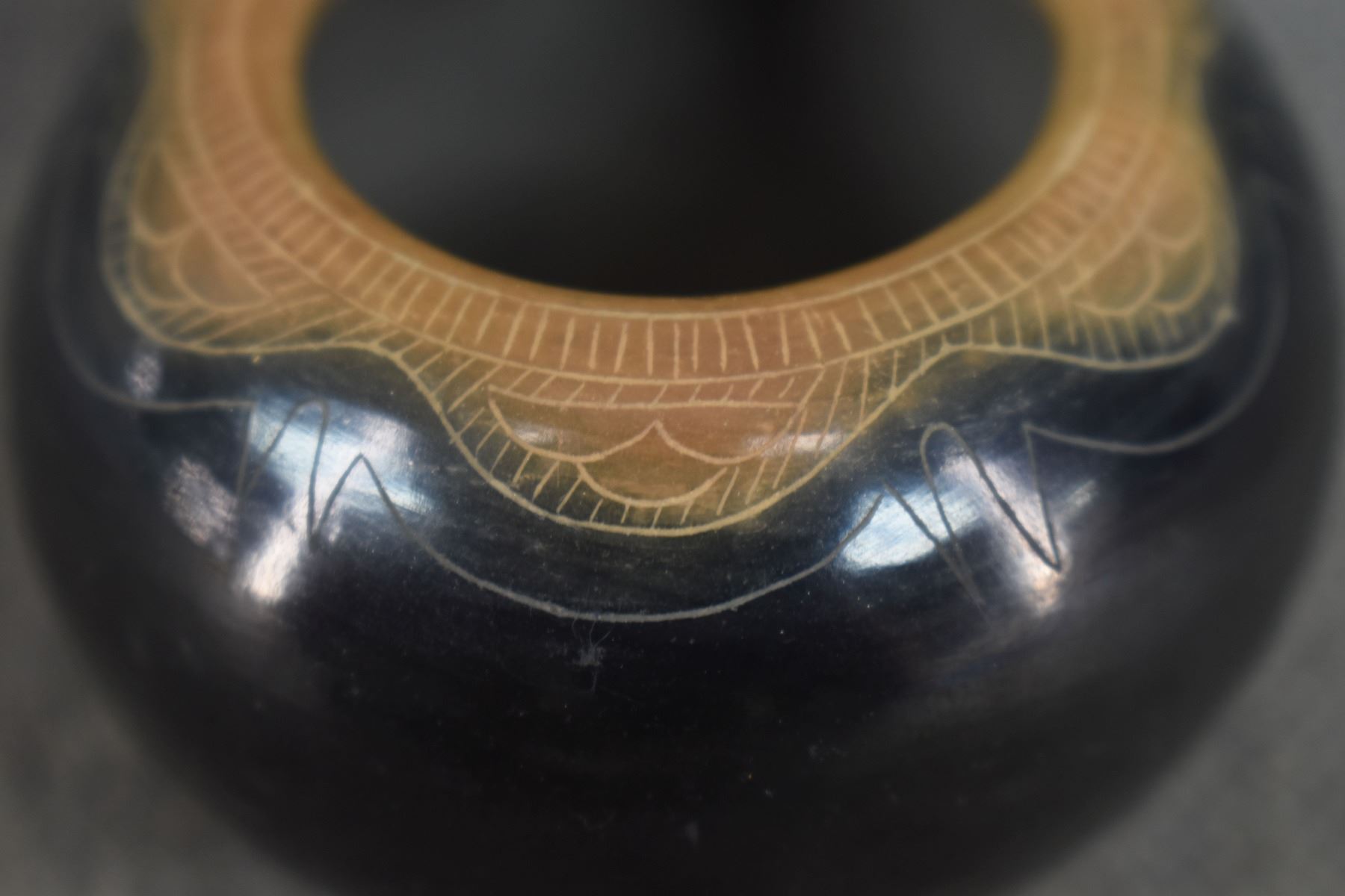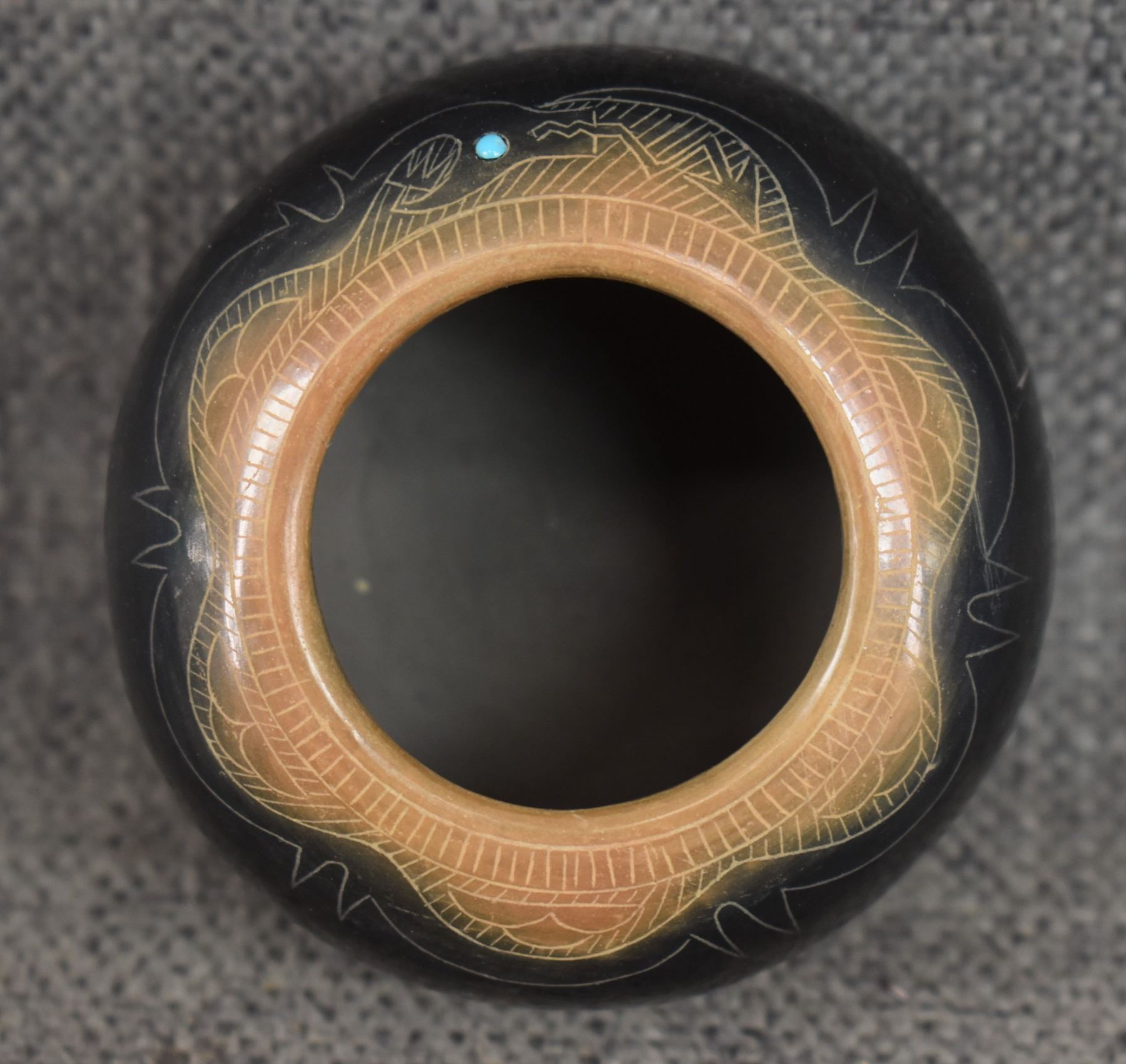 1980's black ware with sgraffito Avanyu design pottery jar signed Stan-moo- when for Barbara Gonzales. 2'' x 2.75''