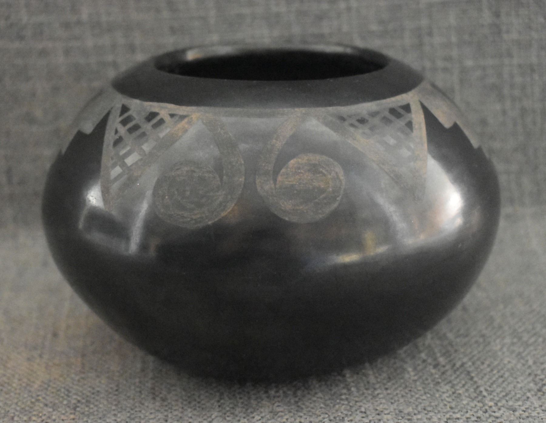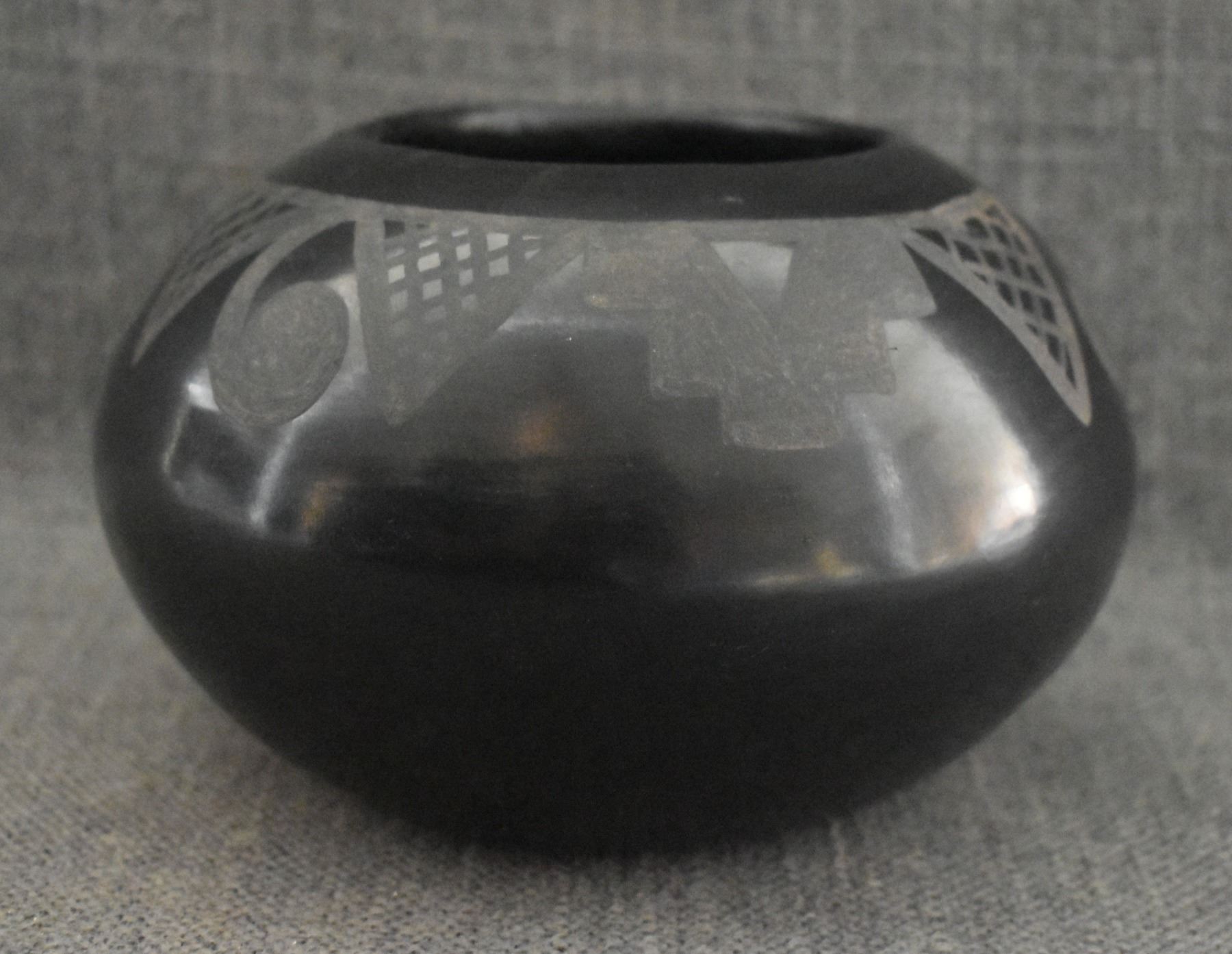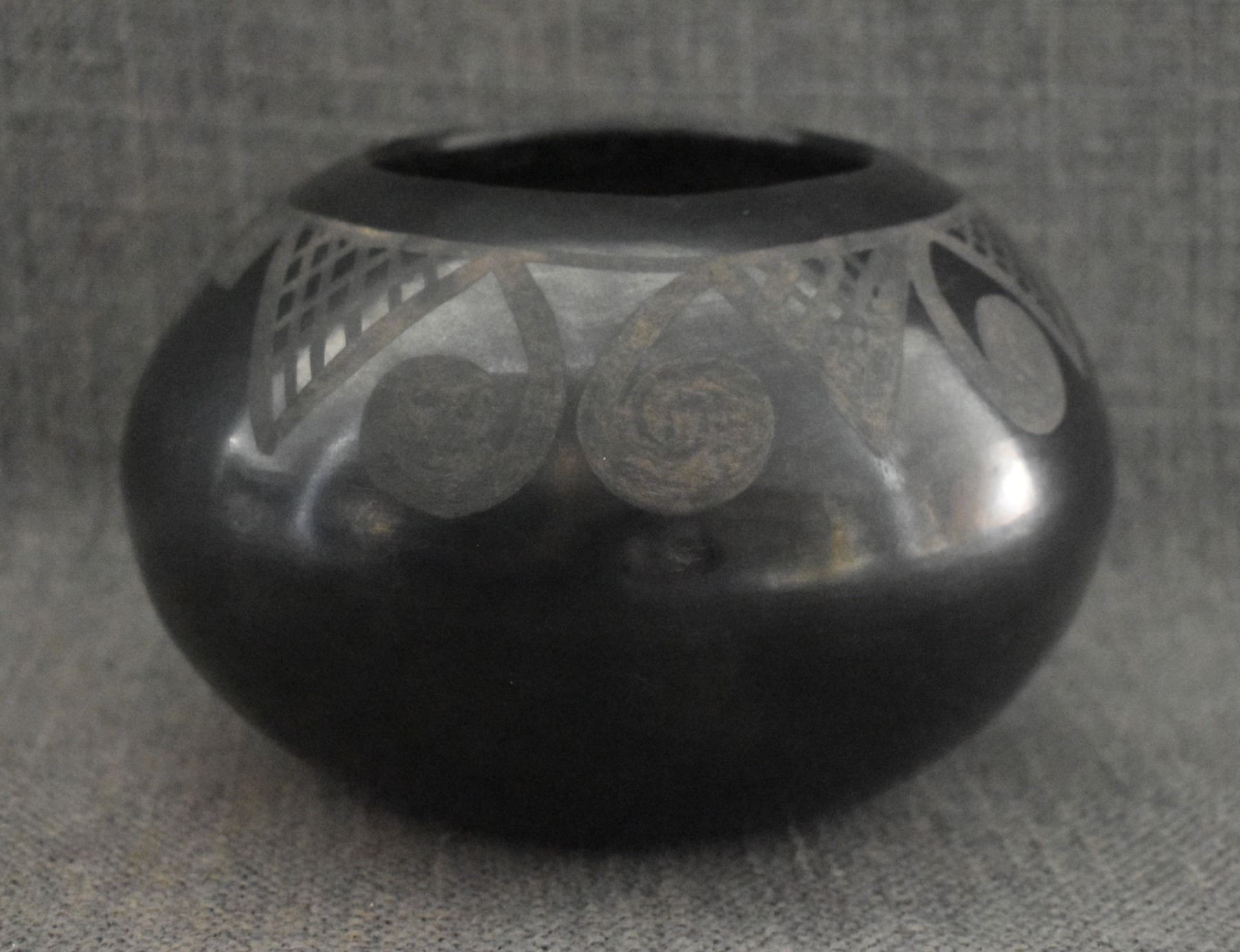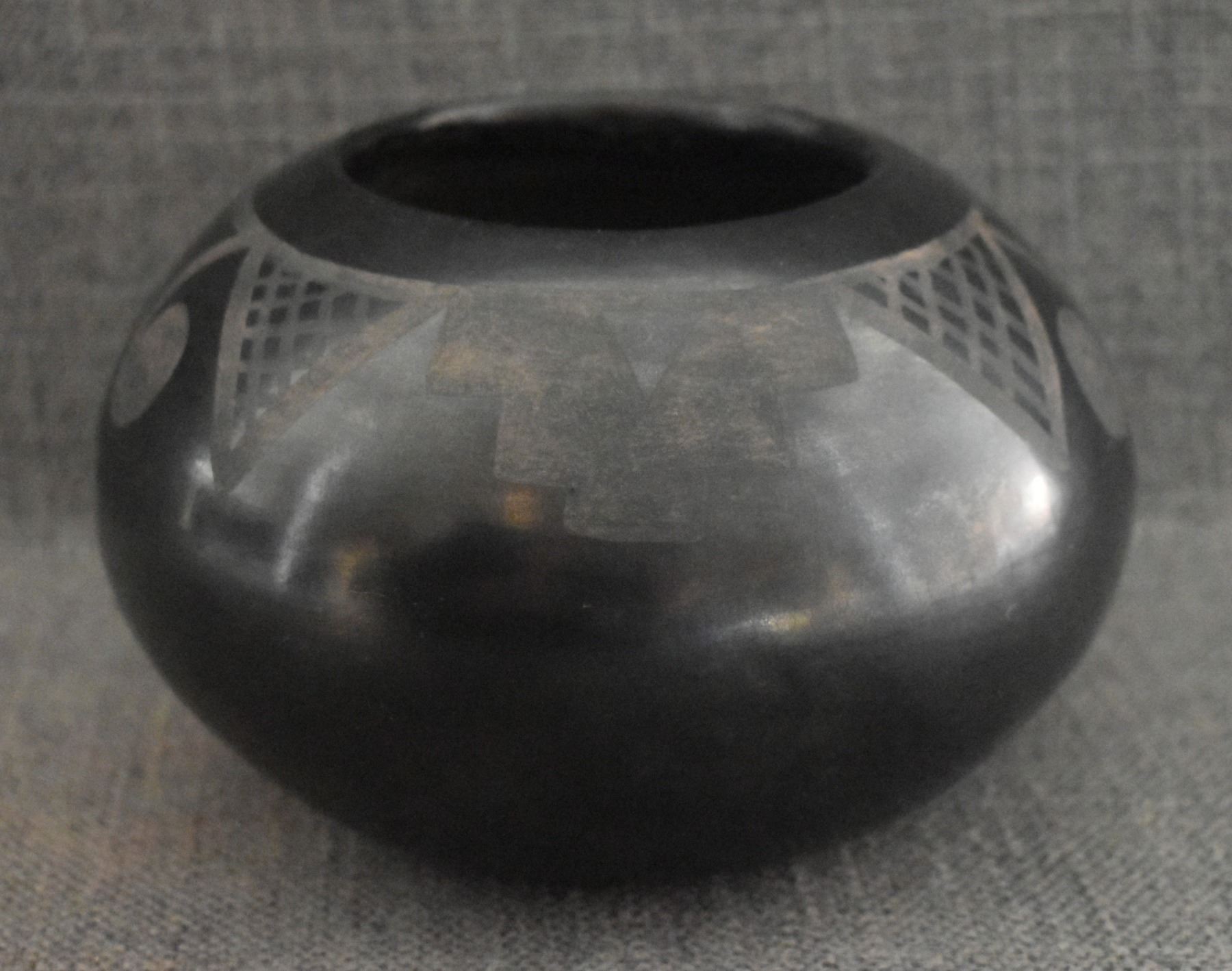 1970's San Ildefonso, hand coiled with matte on black painted geometric design by Carmelita Dunlap, 3.75" x 6".