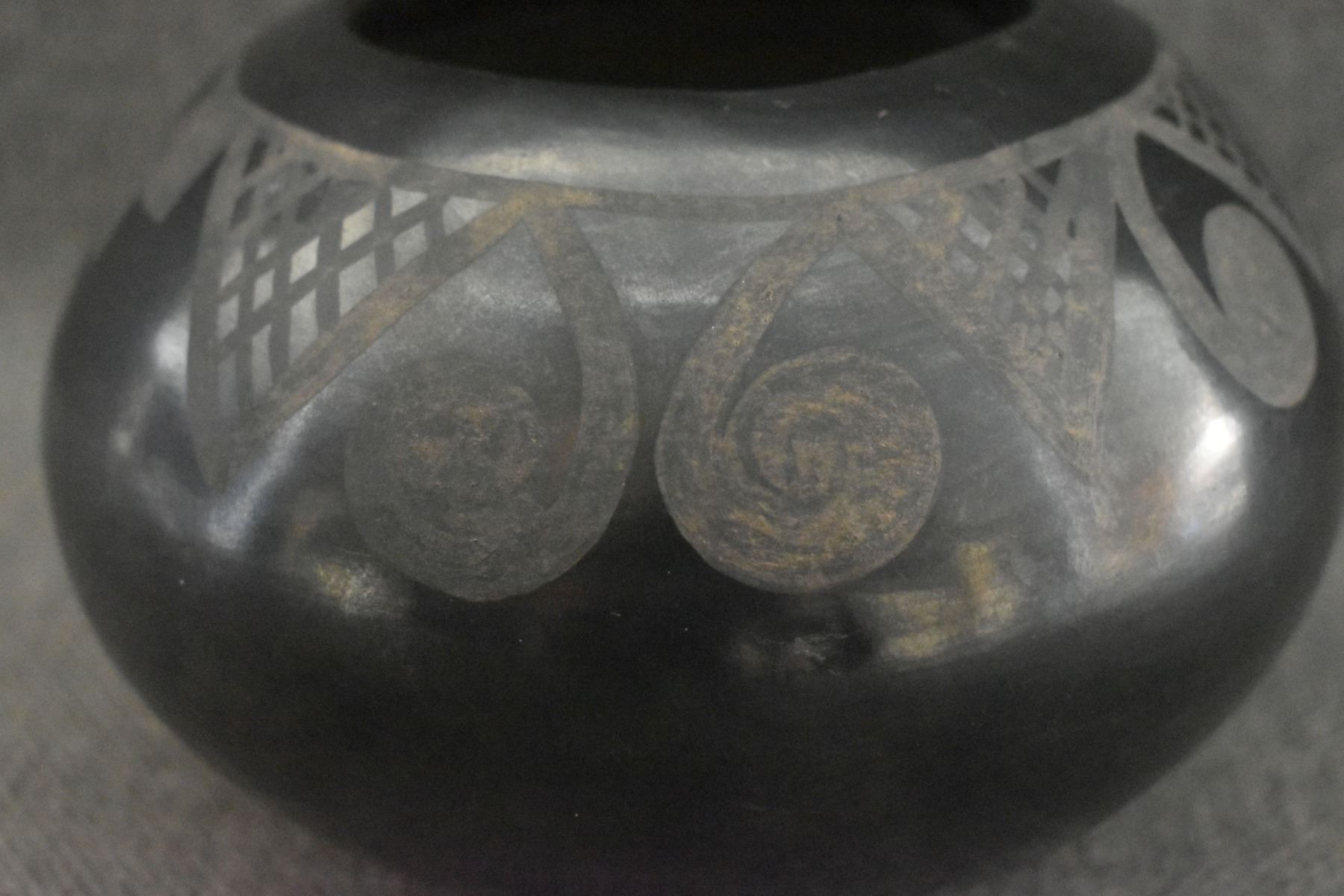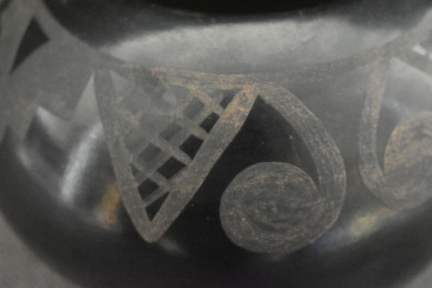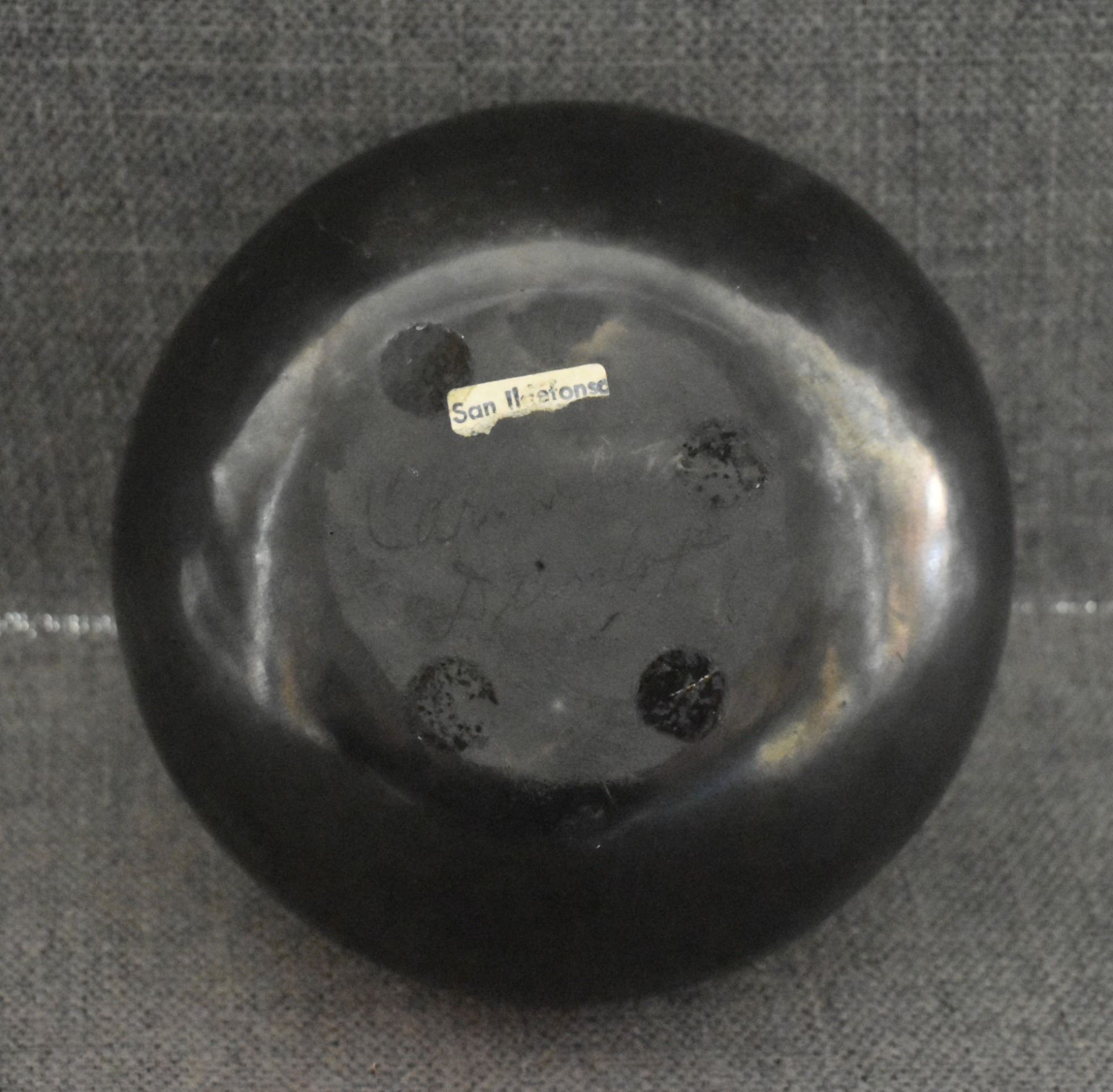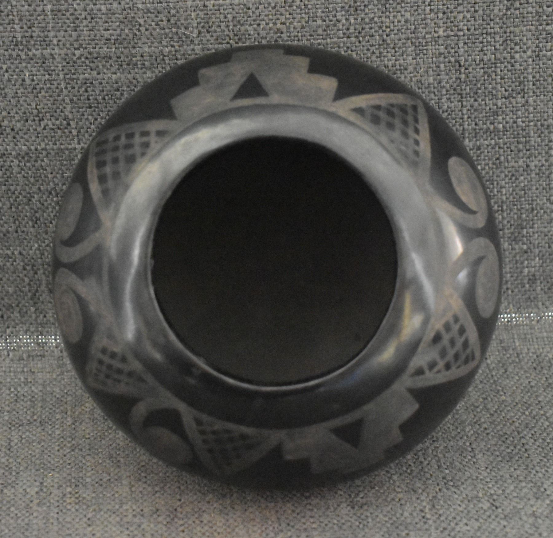 1970's San Ildefonso, hand coiled with matte on black painted geometric design by Carmelita Dunlap, 3.75" x 6".