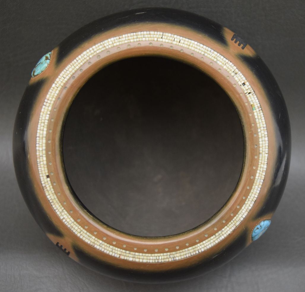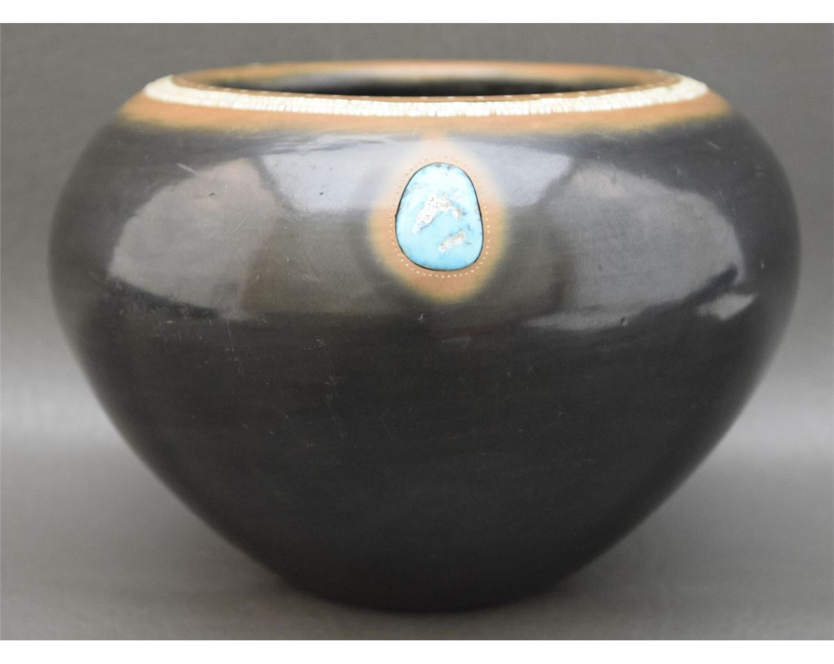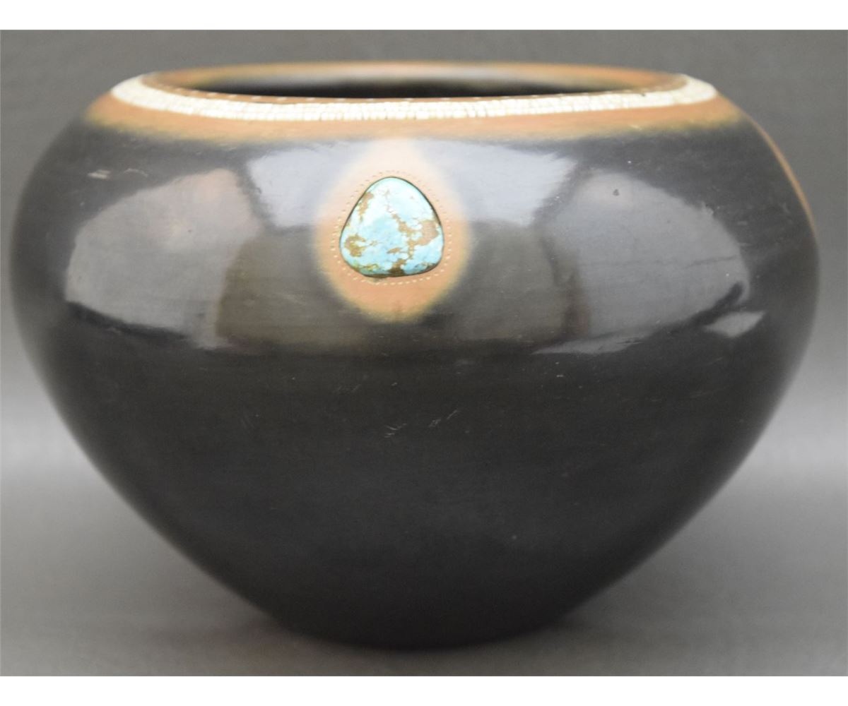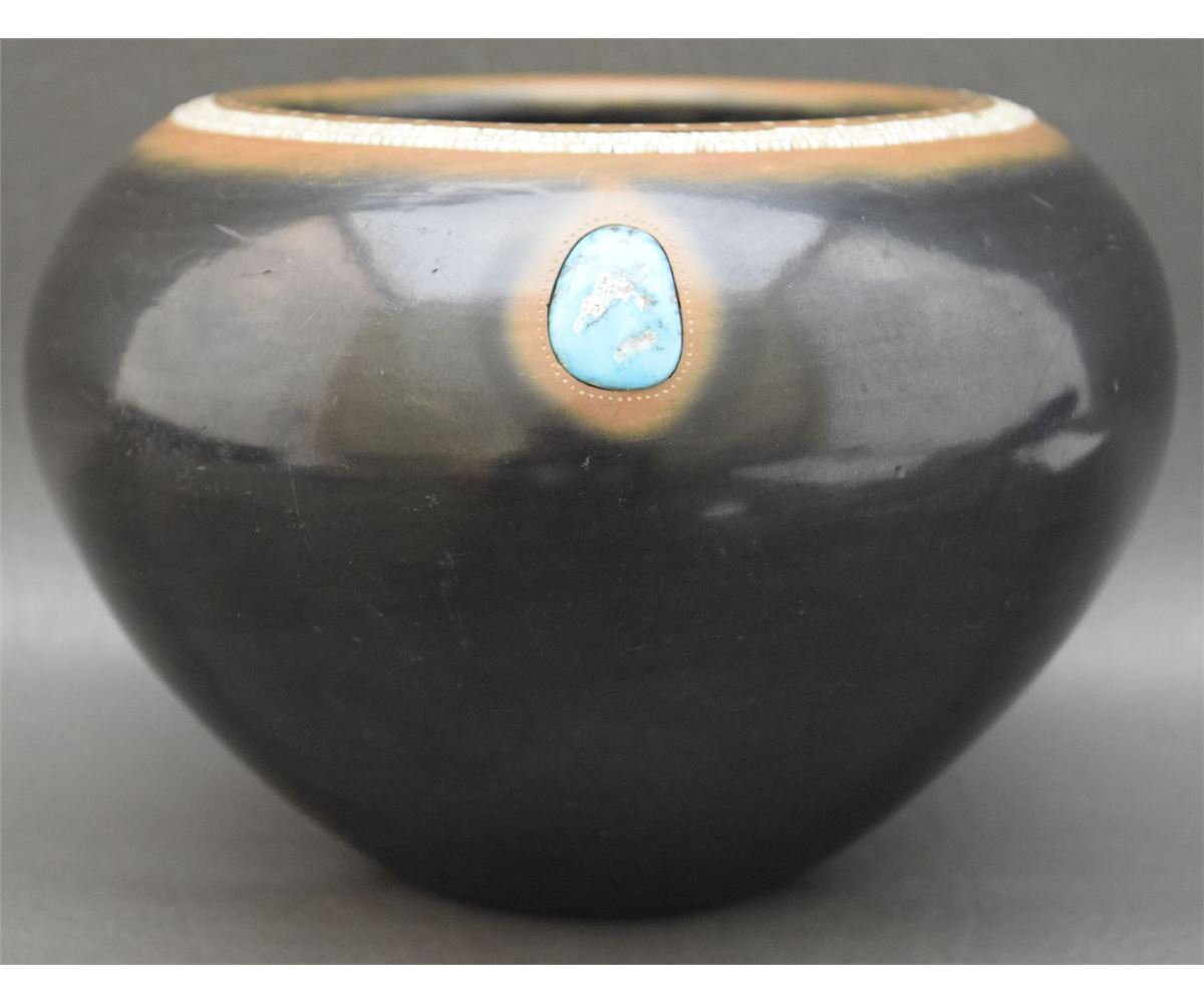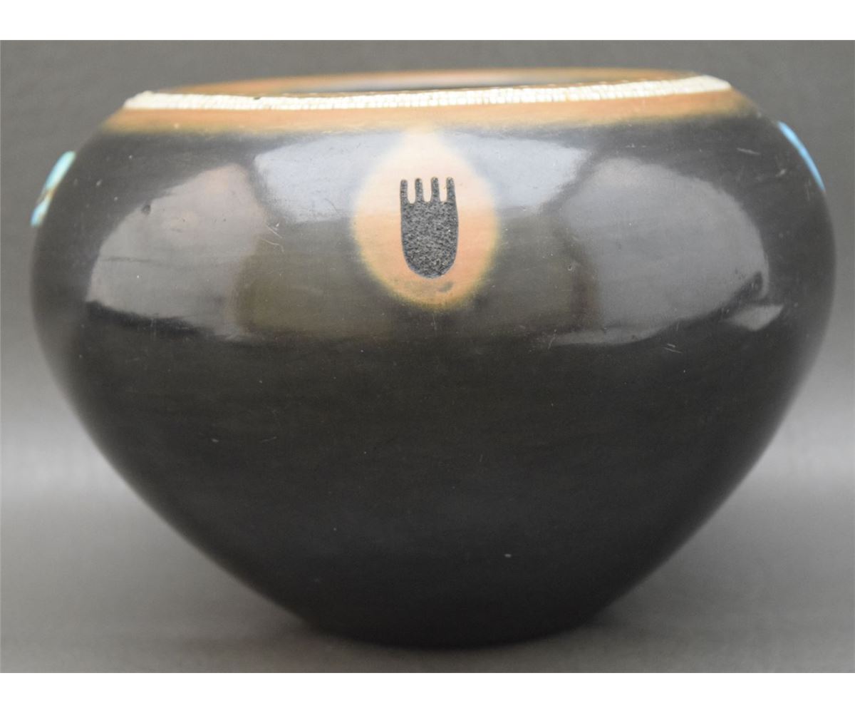 1970's traditional black wear pottery with turquoise and sgraffito bear paw design shell heshie around rim signed Da for Tony Da has minor surface scratches and missing heshie and minor frost cracks 4.75'' x 6.5''