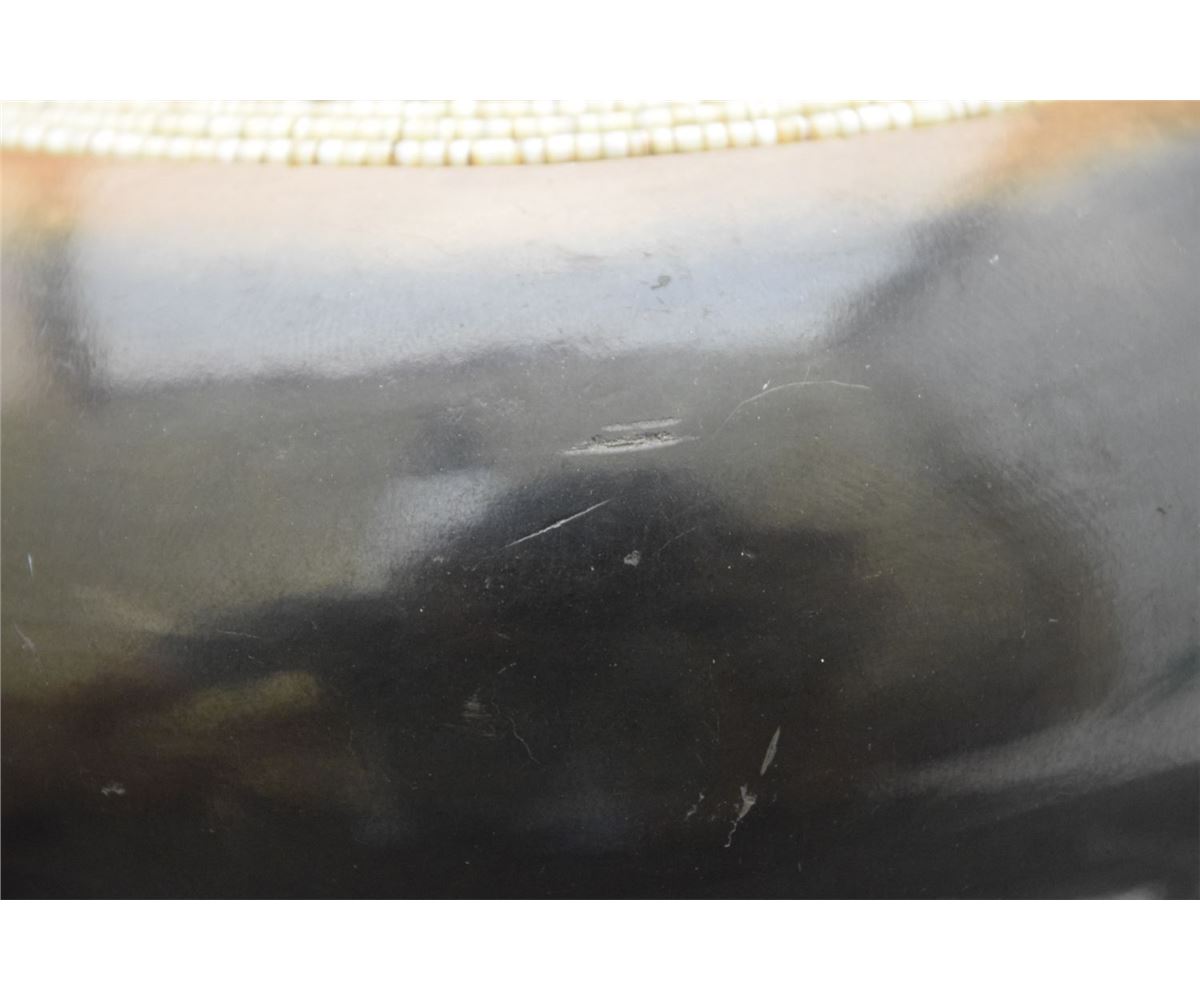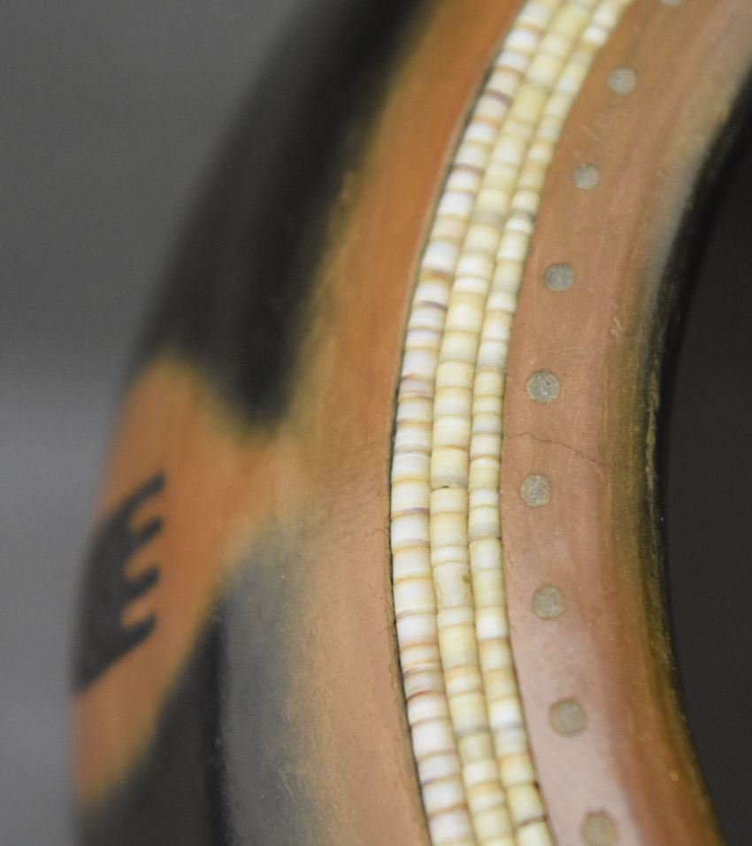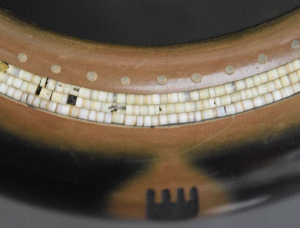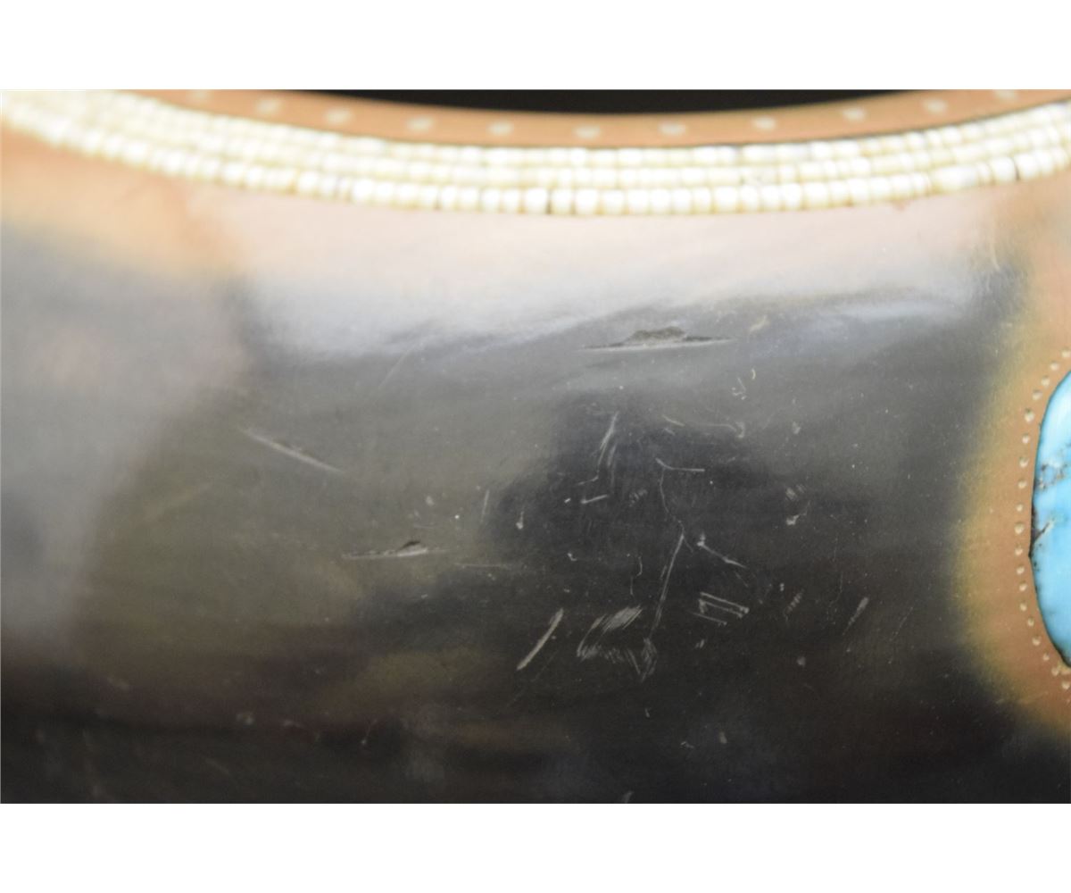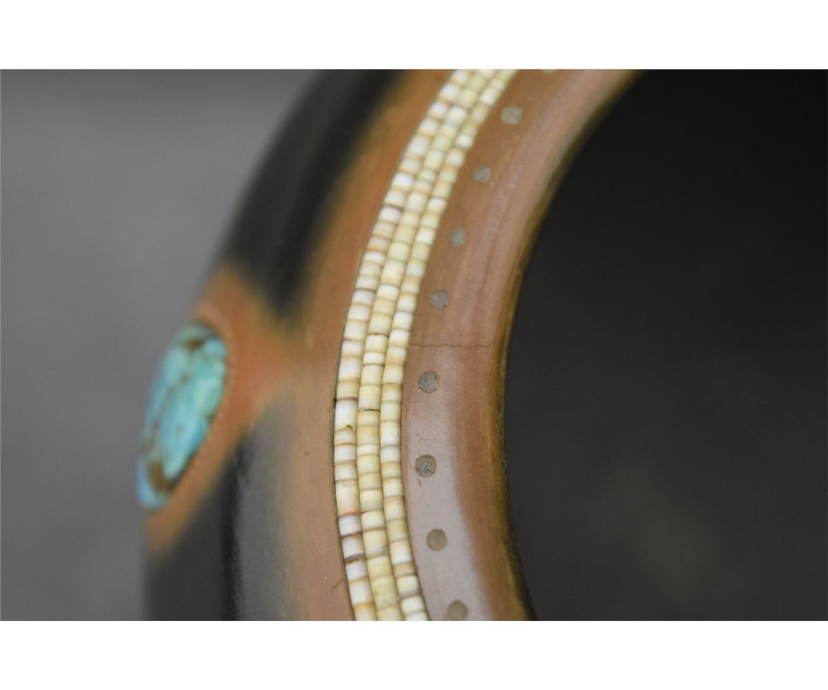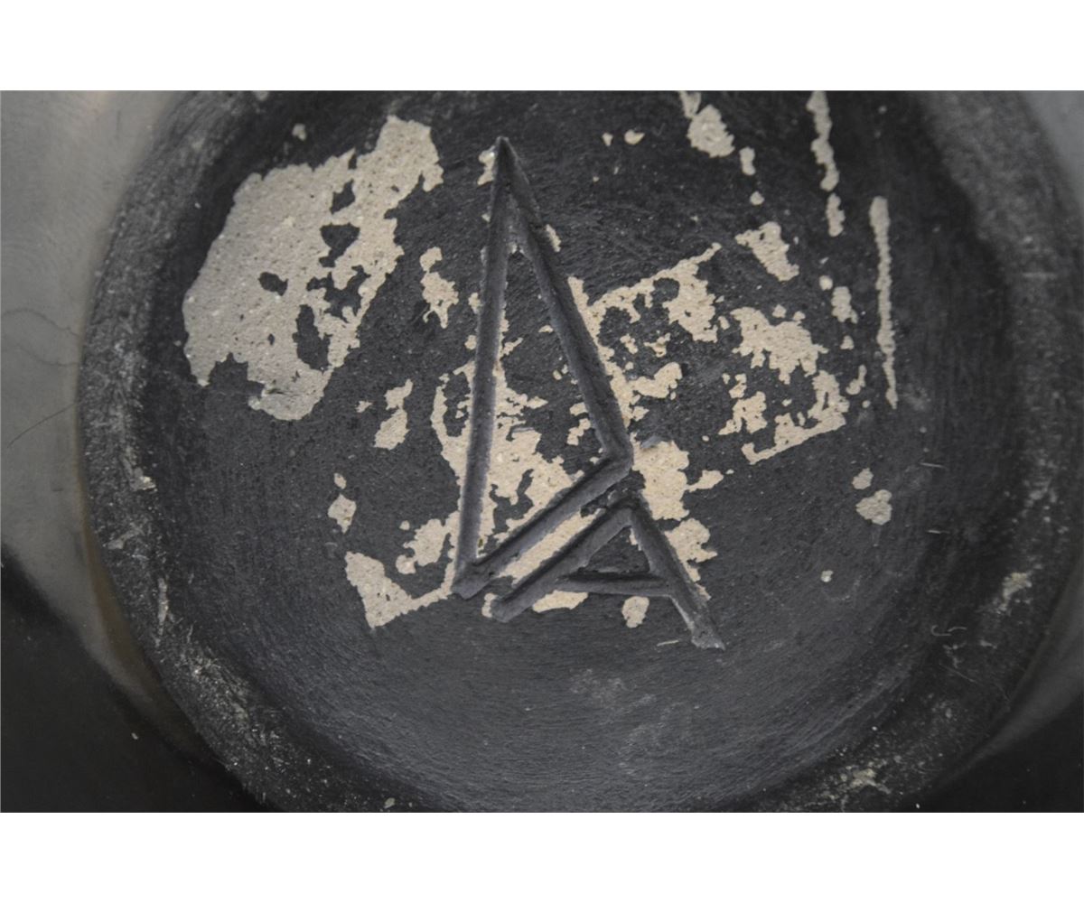 1970's traditional black wear pottery with turquoise and sgraffito bear paw design shell heshie around rim signed Da for Tony Da has minor surface scratches and missing heshie and minor frost cracks 4.75'' x 6.5''