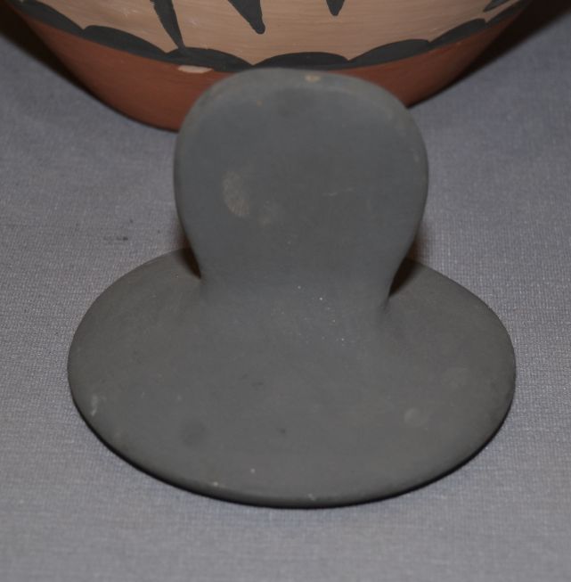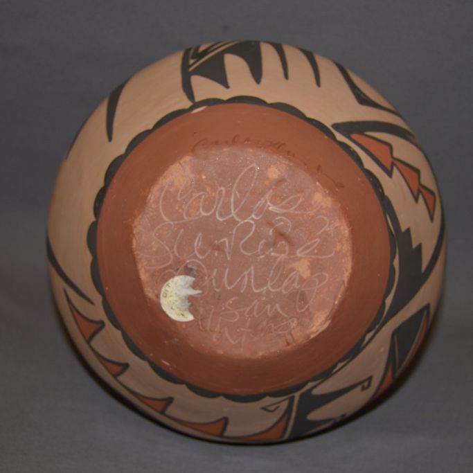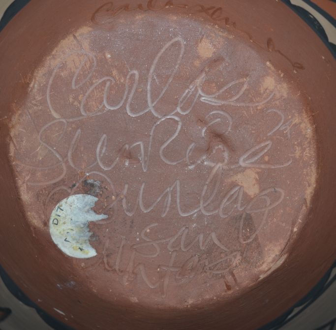 1970' s polychrome painted design has surface rubs signed Carlos Sunrise Dunlop. 13" x 11"