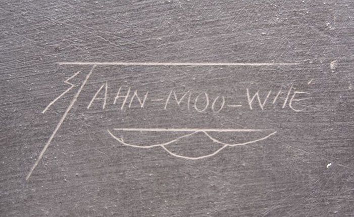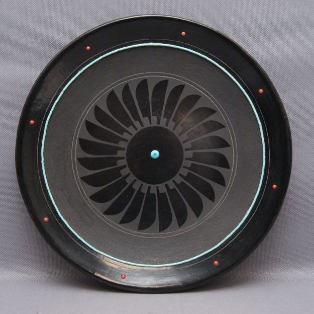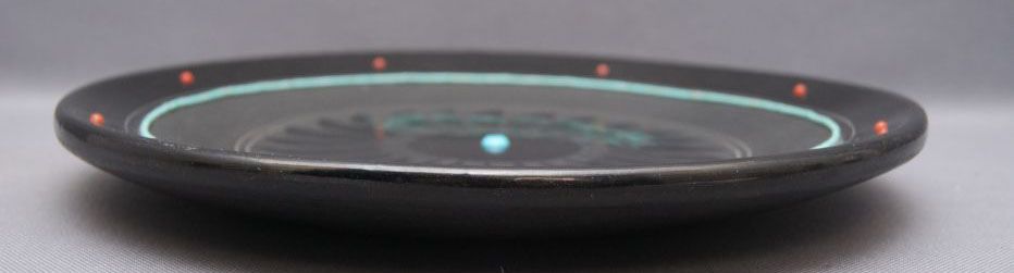 1970s, 80s feathered design with inlaid turquoise and coral, signed Stahn-Moo-Whe, Barbara Gonzalez, 10" diameter