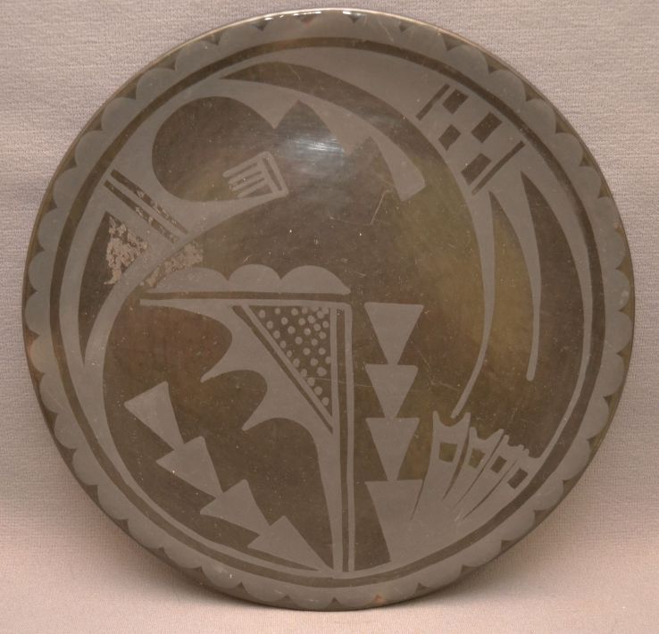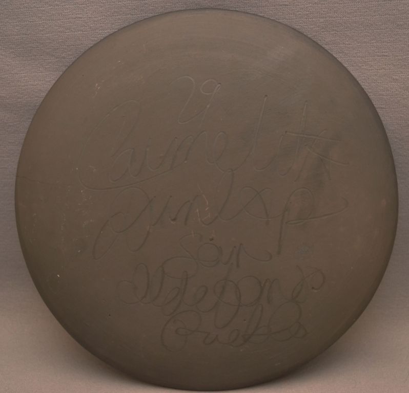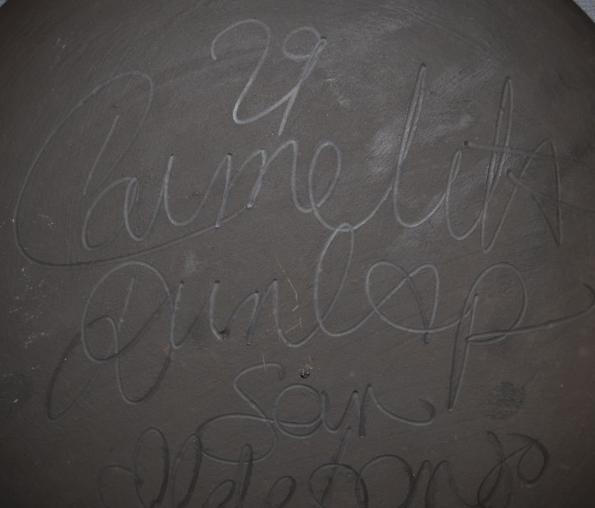 1960s 70s matte on black design has surface scratches pits and slip damage signed Carmalita Dunlop 1"x12.25"