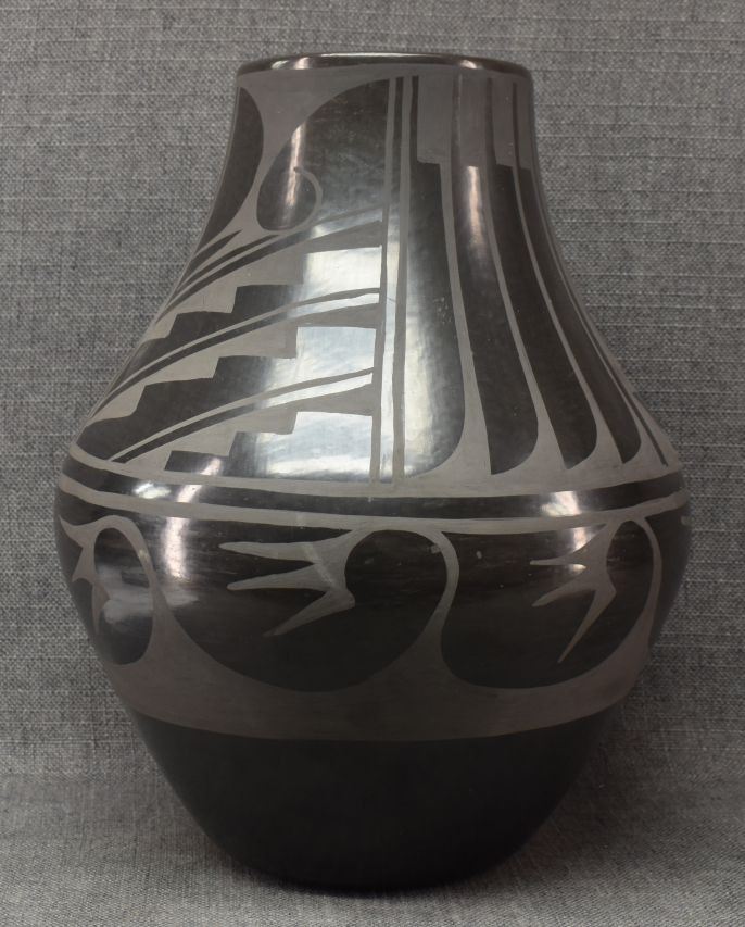 1970's Santo Domingo Indian. Hand coiled an painted matt on black geometric design pottery vase. Signed Carmelita Dunlap . 14'' x 11''