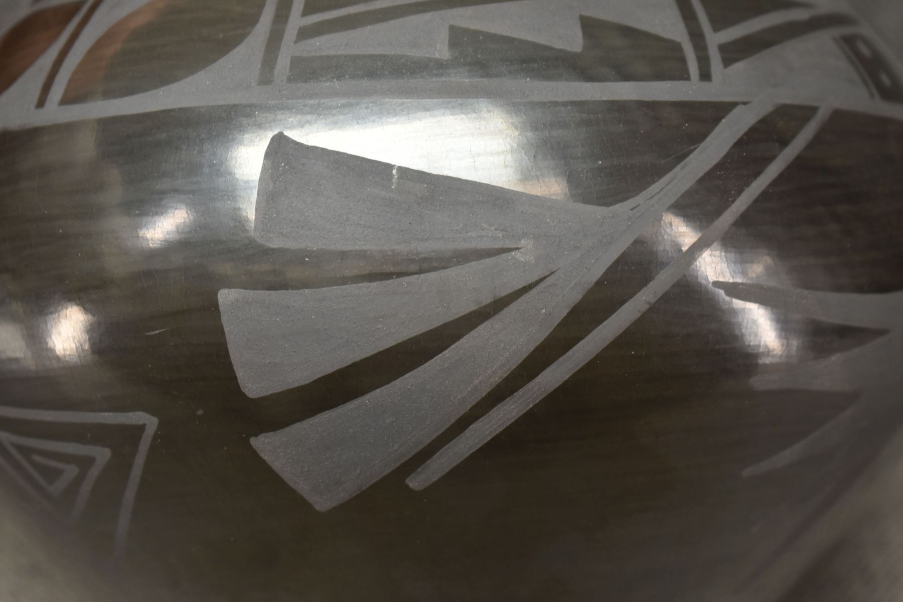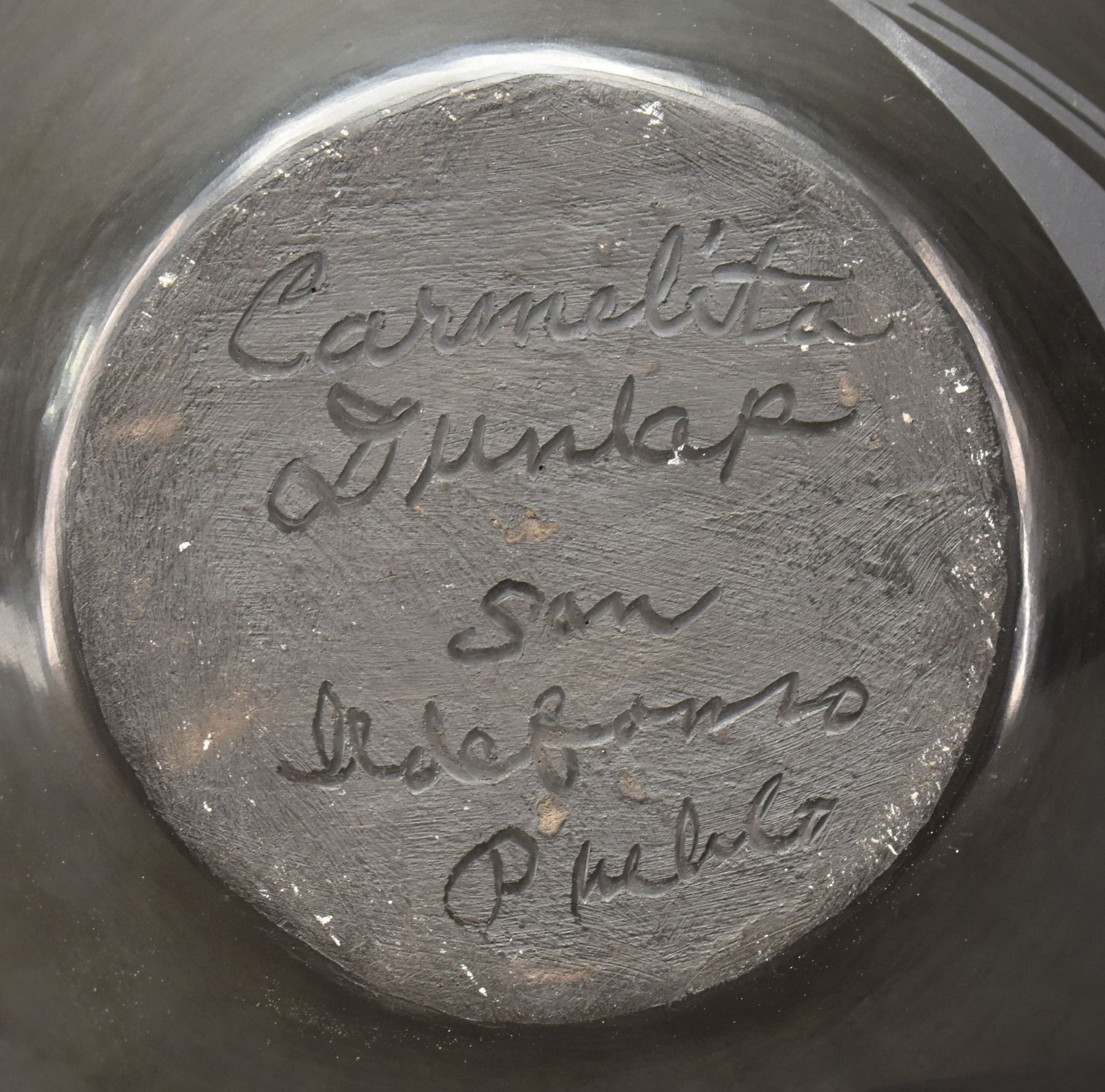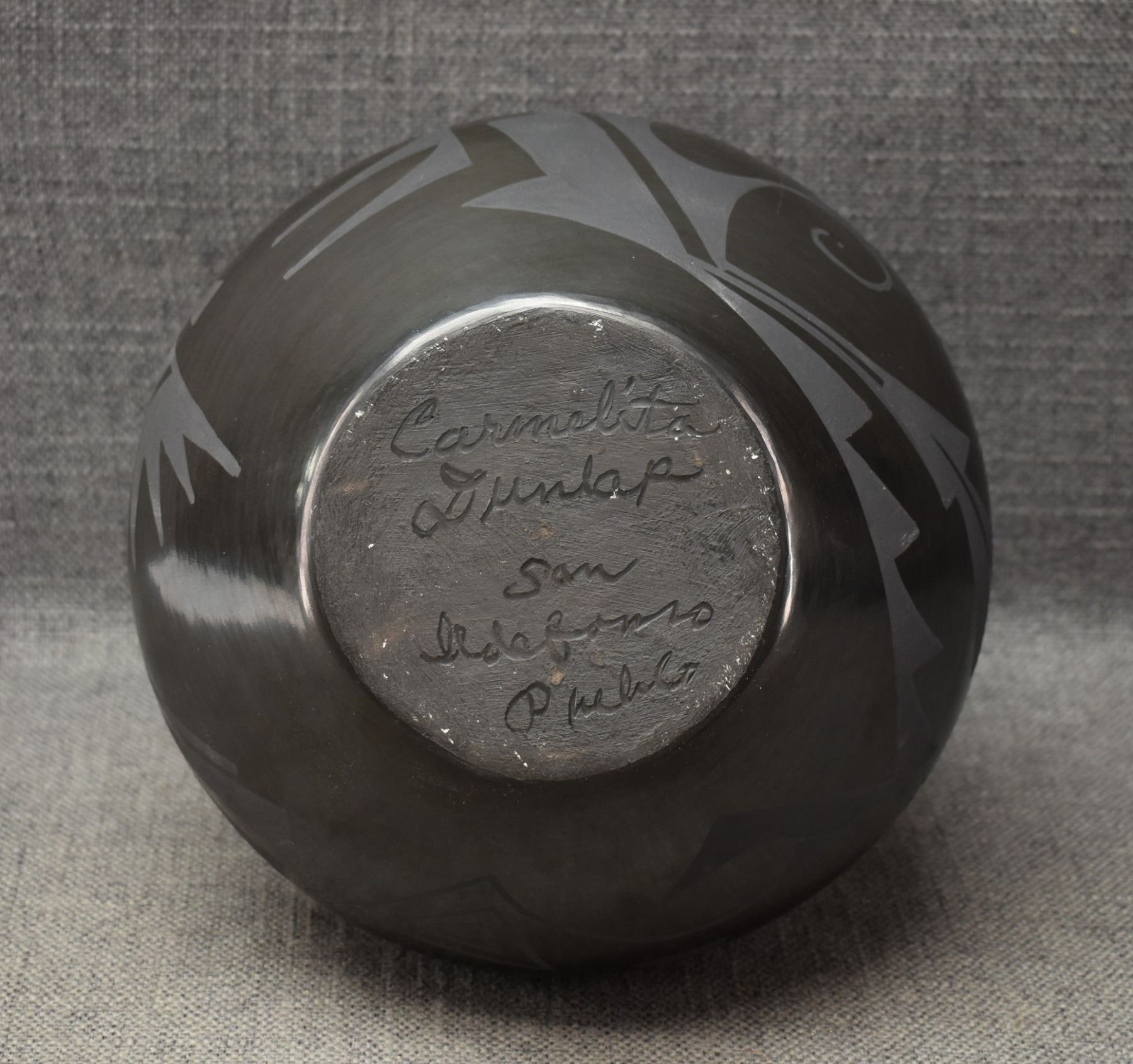 1970's San Ildefonso, hand coiled and painted Matt on black design signed Carmelita Dunlap, 9'' x 8'' has surface rubs