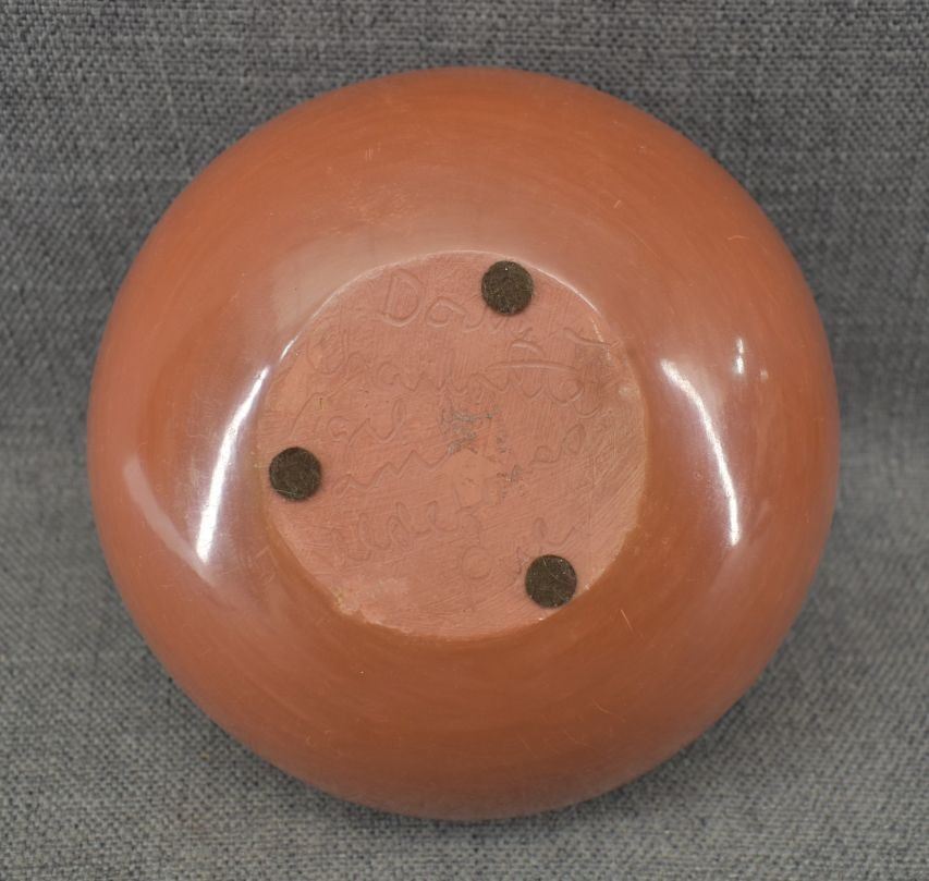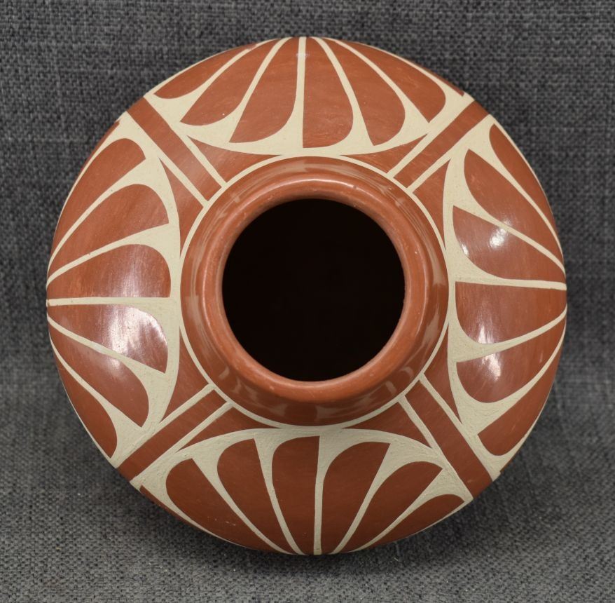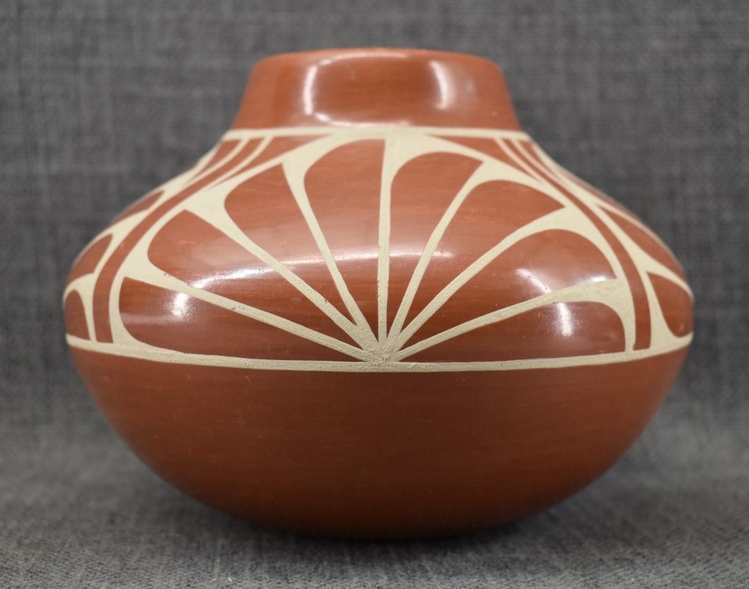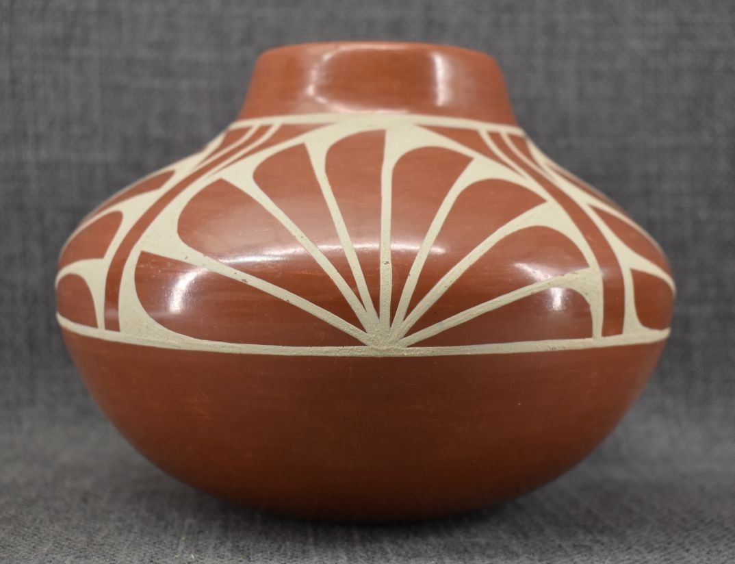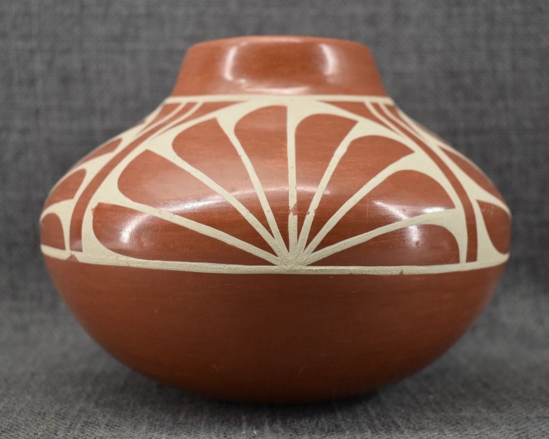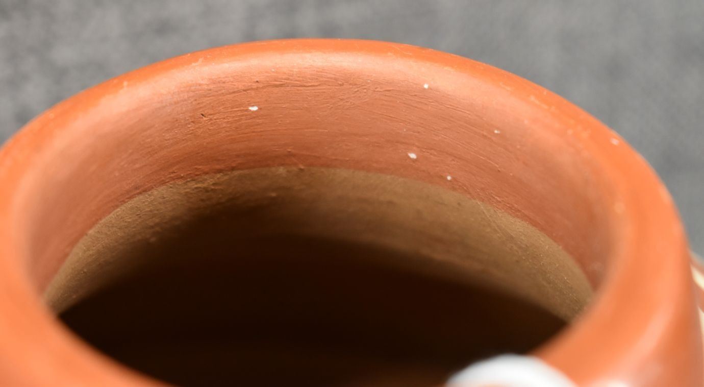 1980-90's San Ildefonso, hand coiled with painted cream on red design 5" x 6.5"