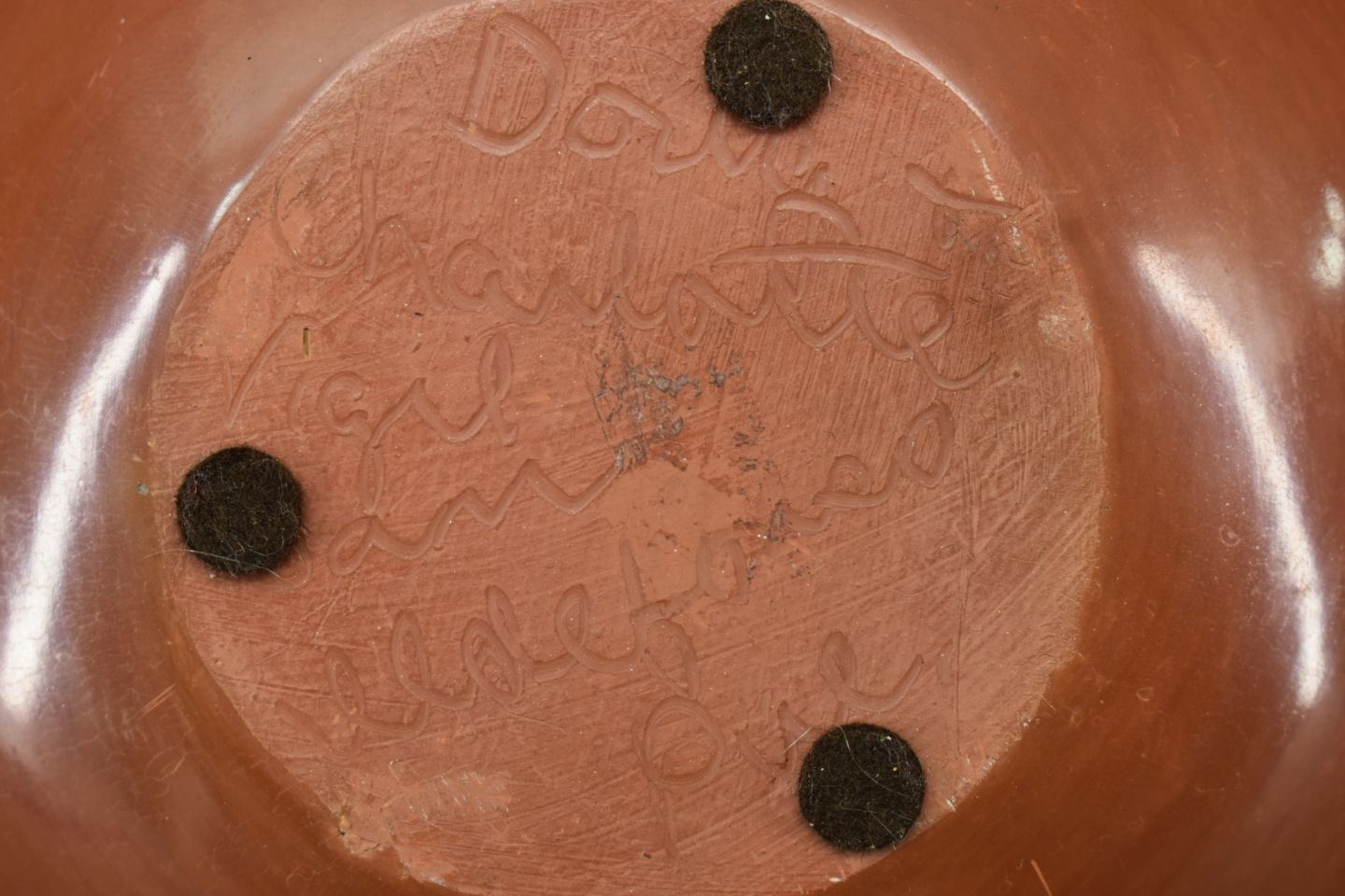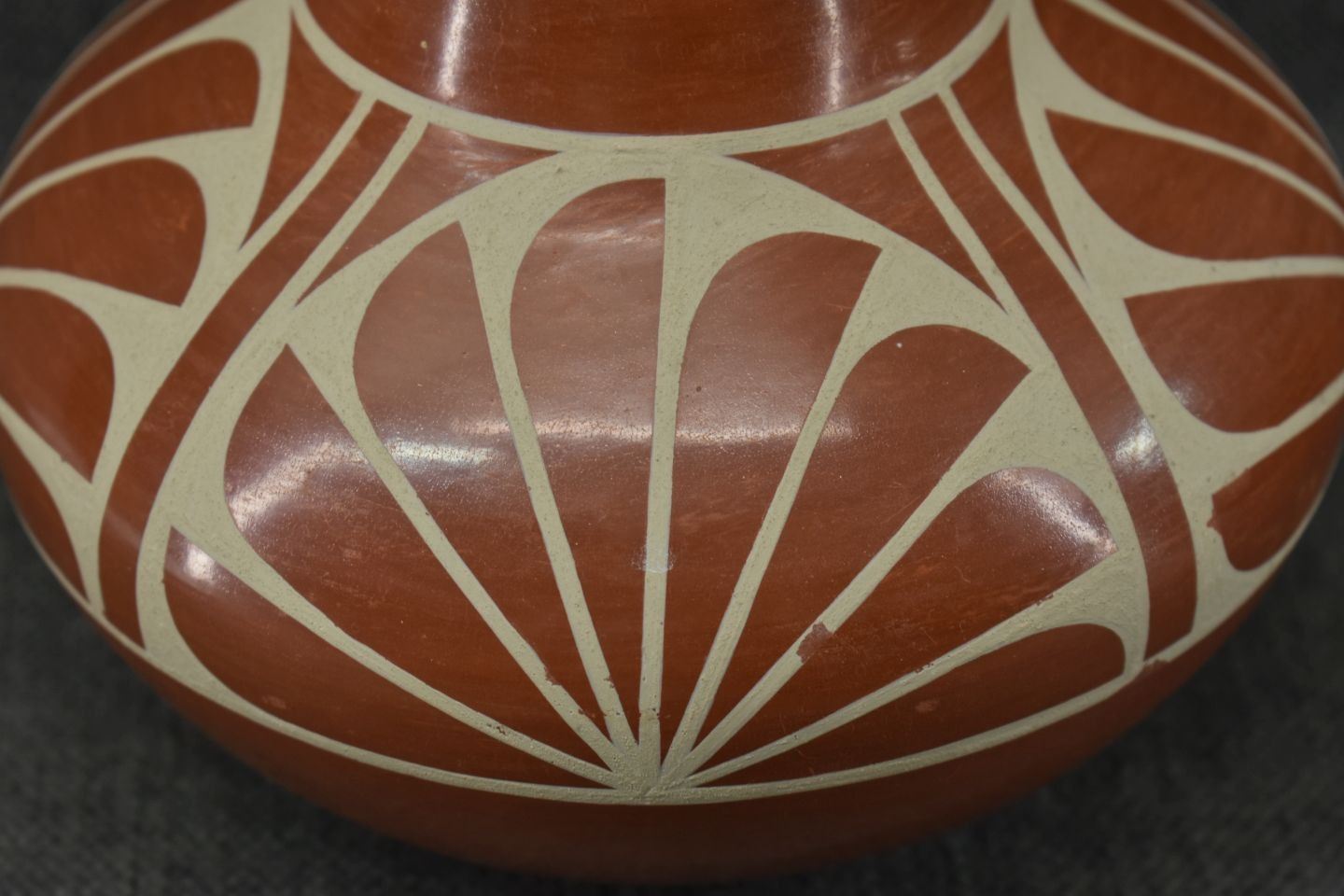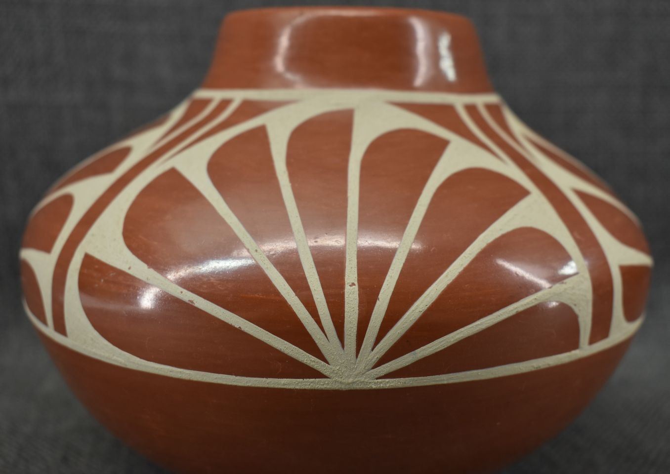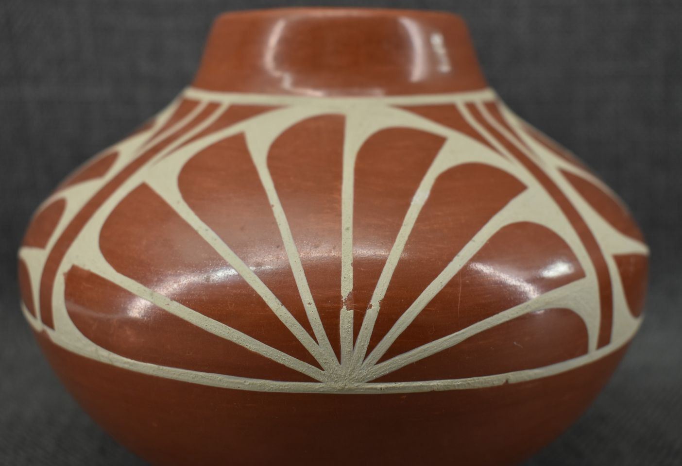 1980-90's San Ildefonso, hand coiled with painted cream on red design 5" x 6.5"