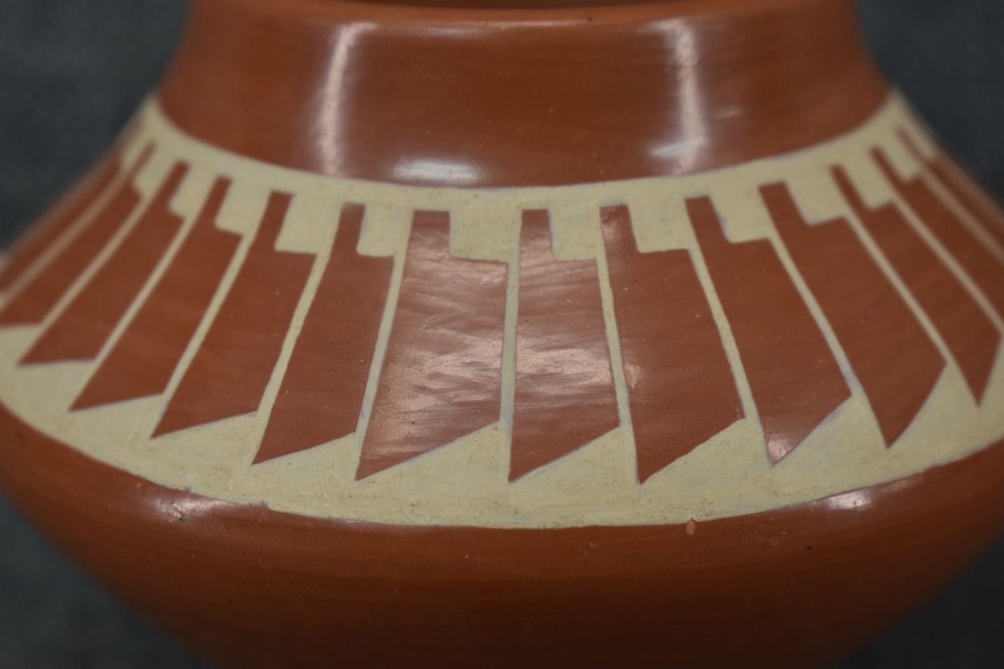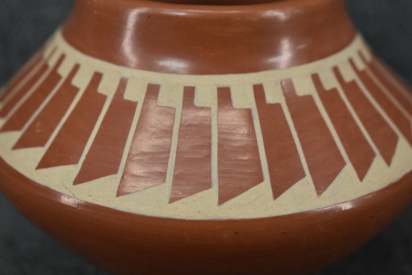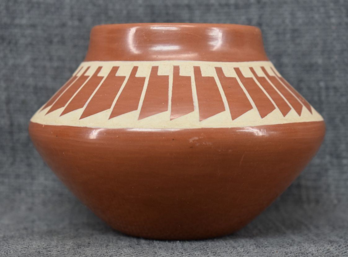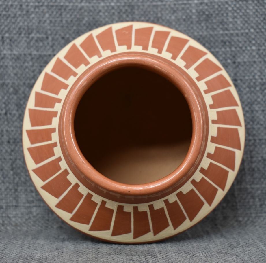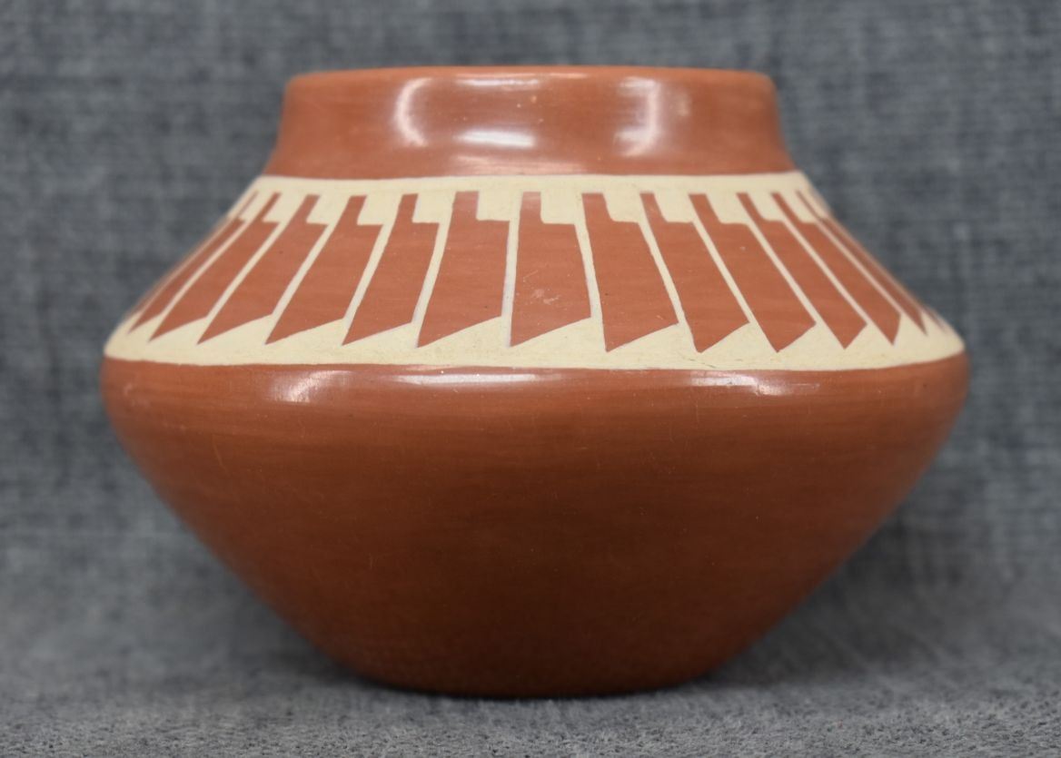 1980-90's San Ildefonso, hand coiled with cream on red painted feather design signed Kathy N Gutierrez 3" x 4.25"