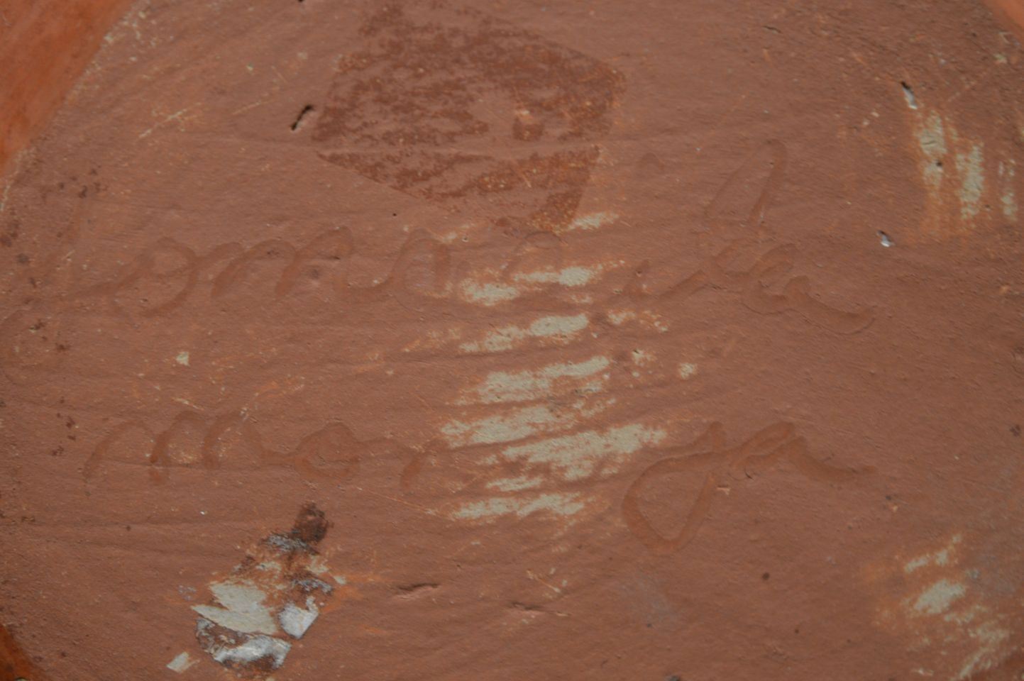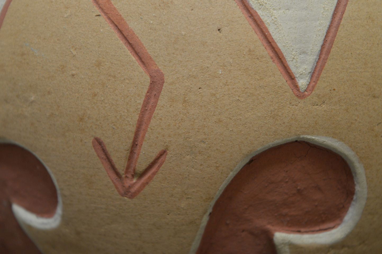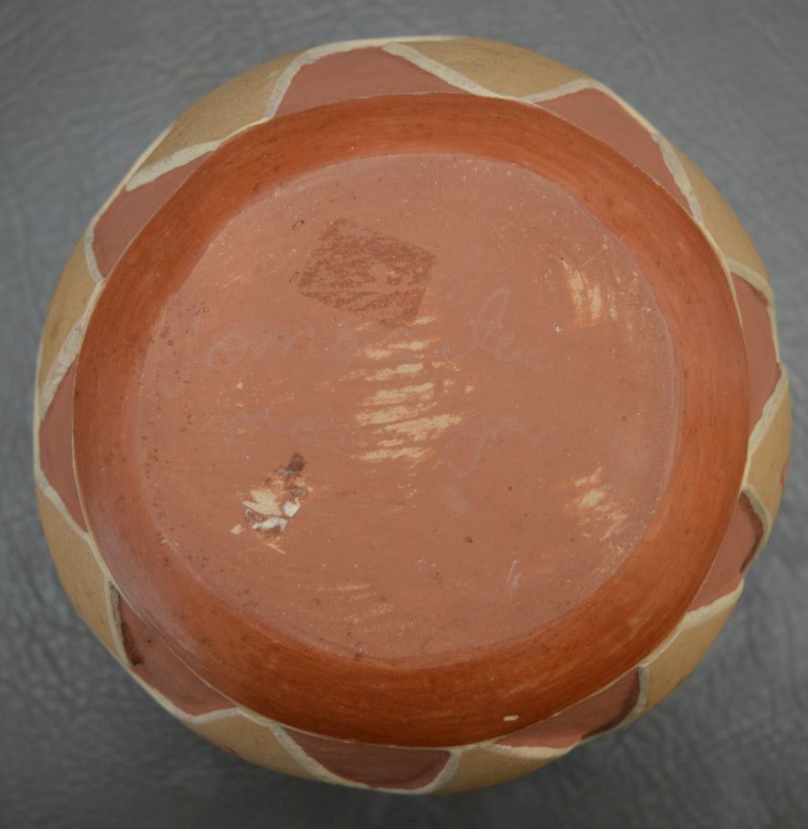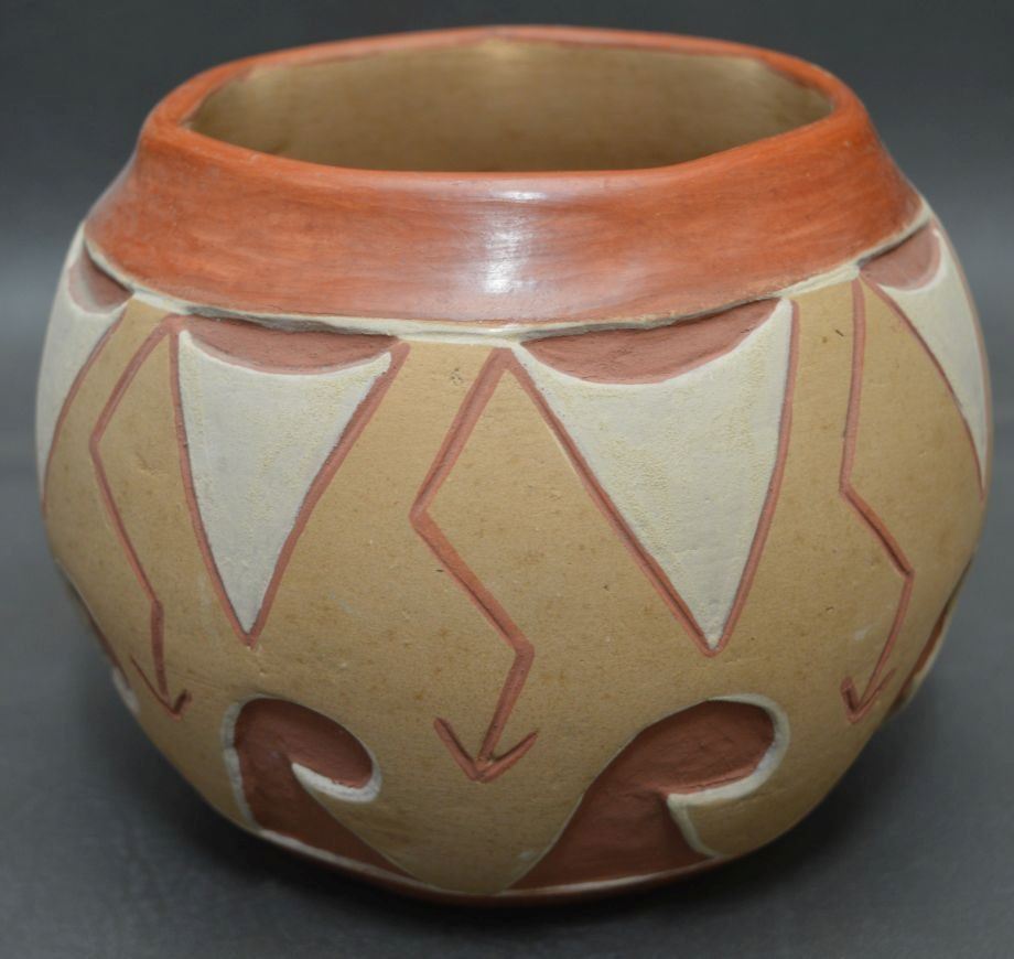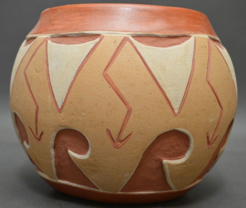 1970's san Juan Indian, hand carved and painted polychrome design pottery jar signed Tomasita Montoya. 5.5'' x 6.5''