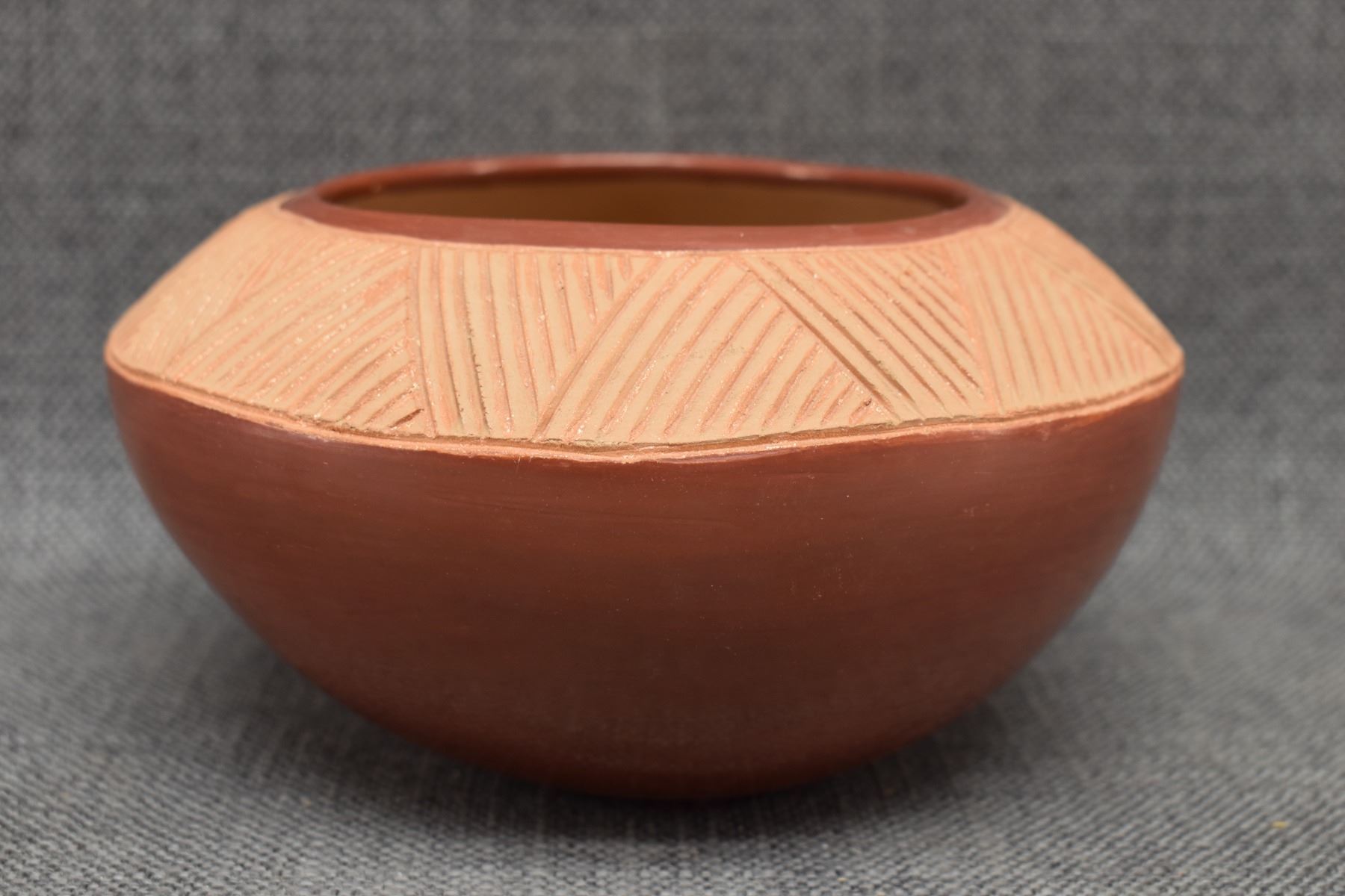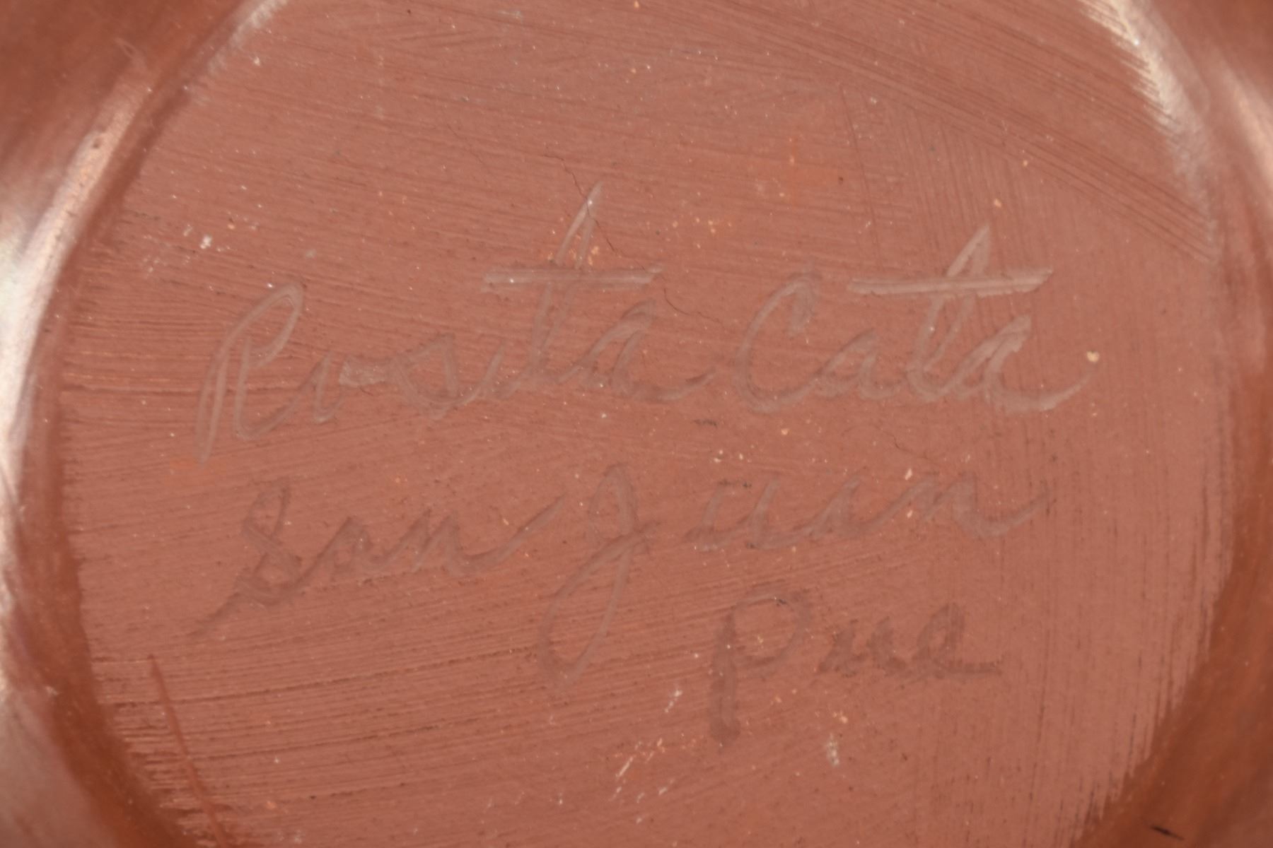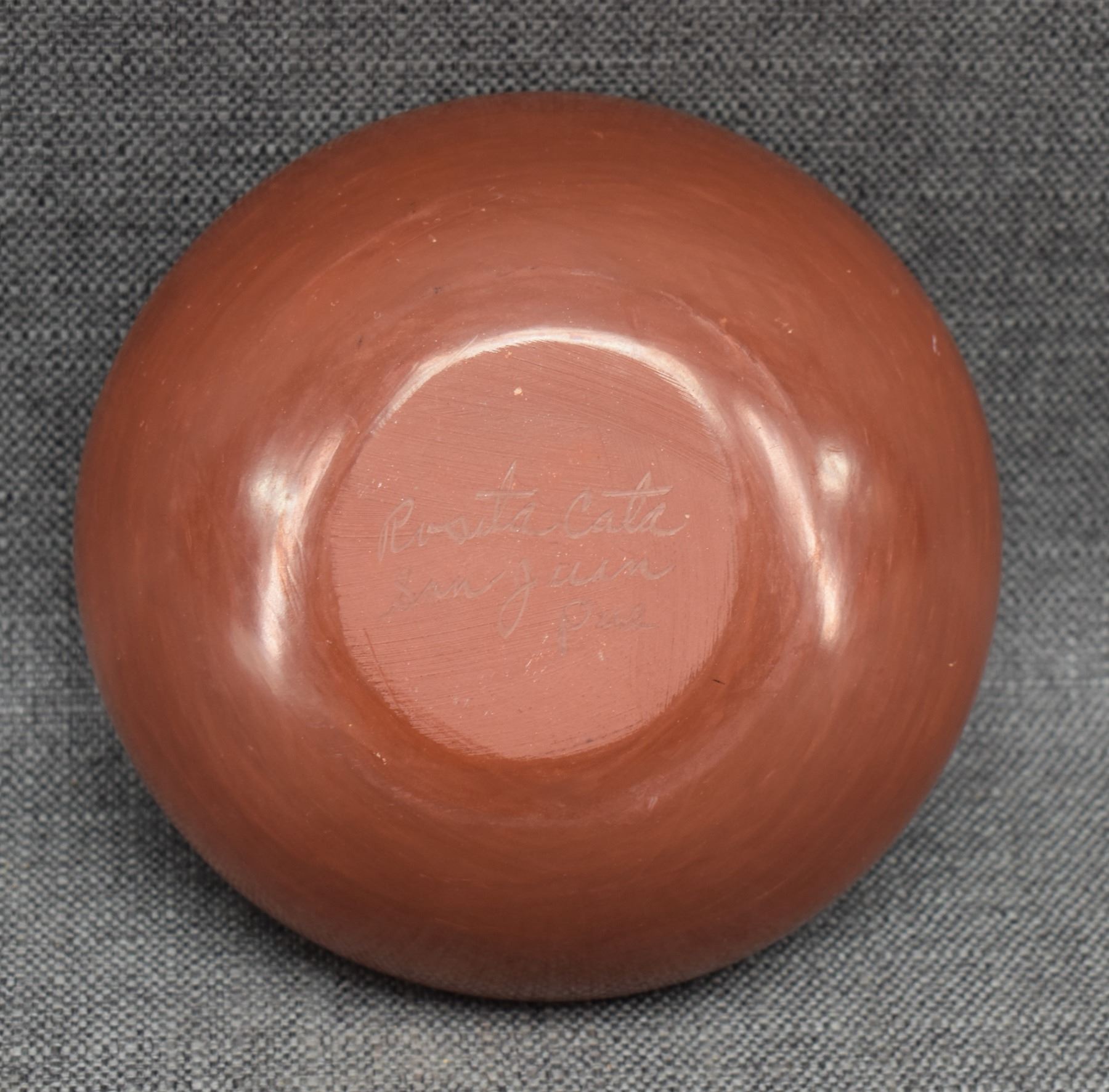 1970's San Juan Indian. Hand coiled and carved design pottery bowl, signed Rosita Cata. 3.5'' x 7''