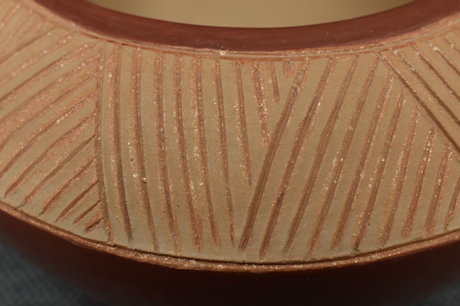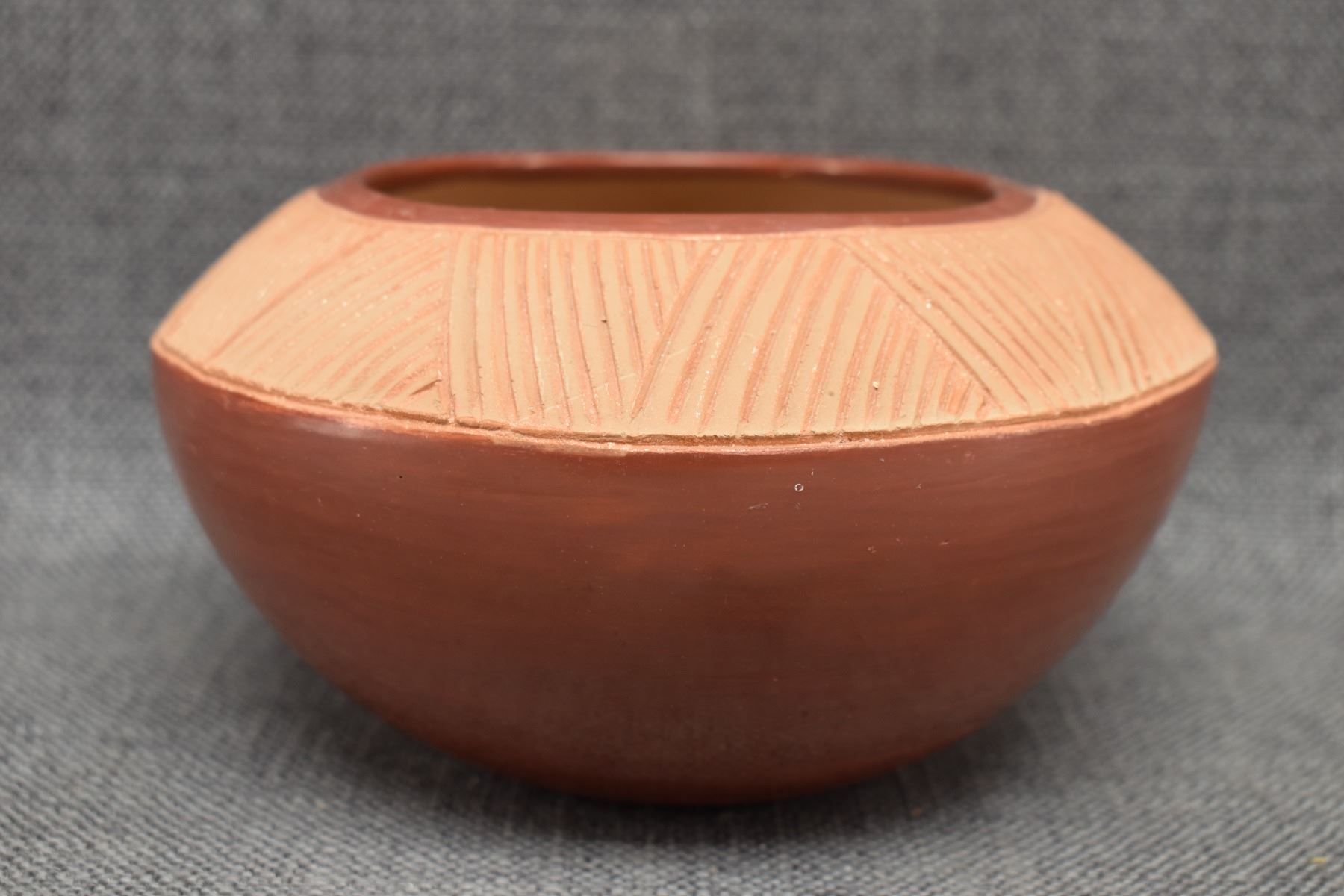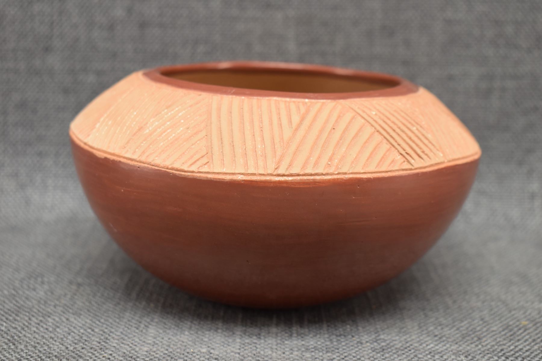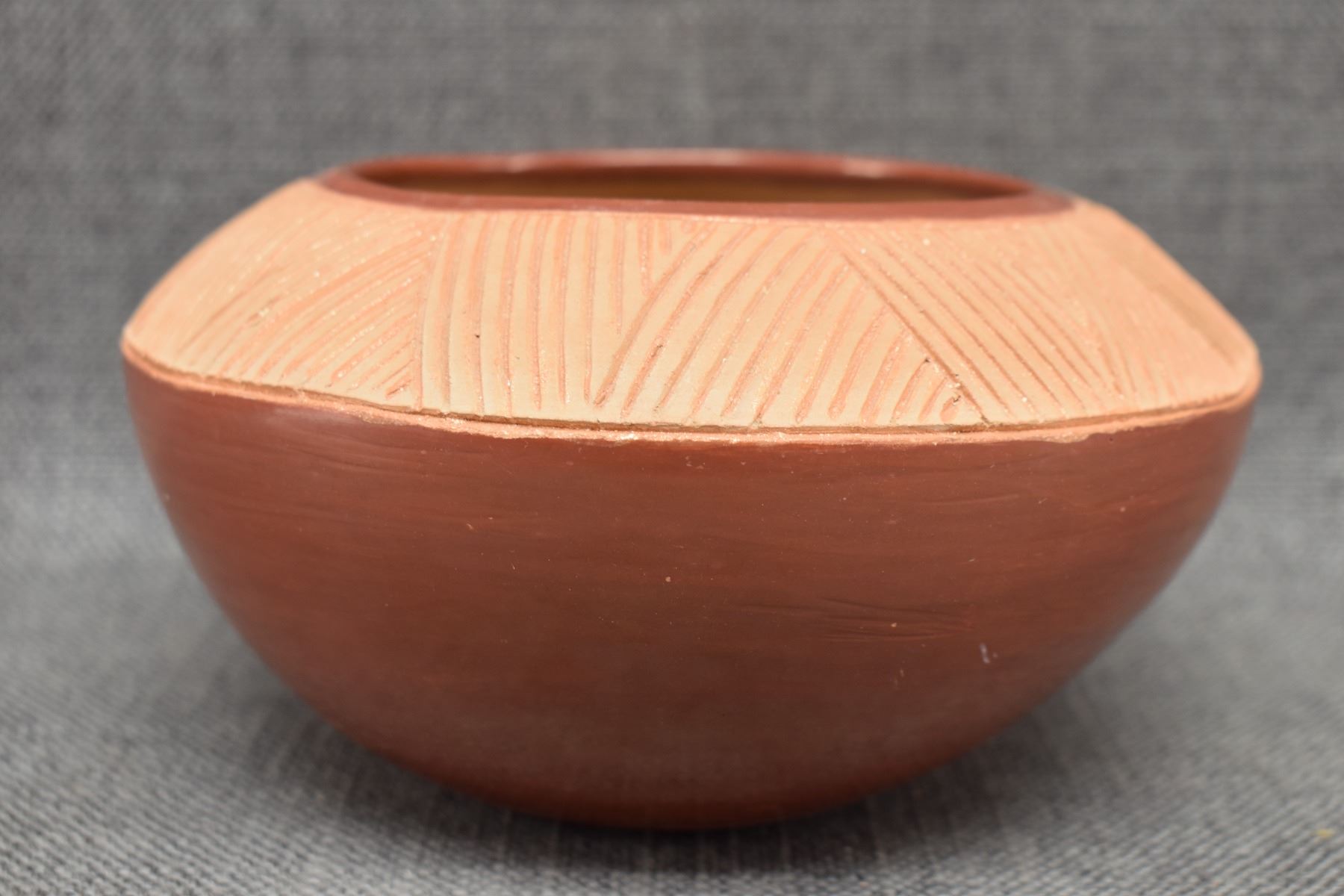 1970's San Juan Indian. Hand coiled and carved design pottery bowl, signed Rosita Cata. 3.5'' x 7''