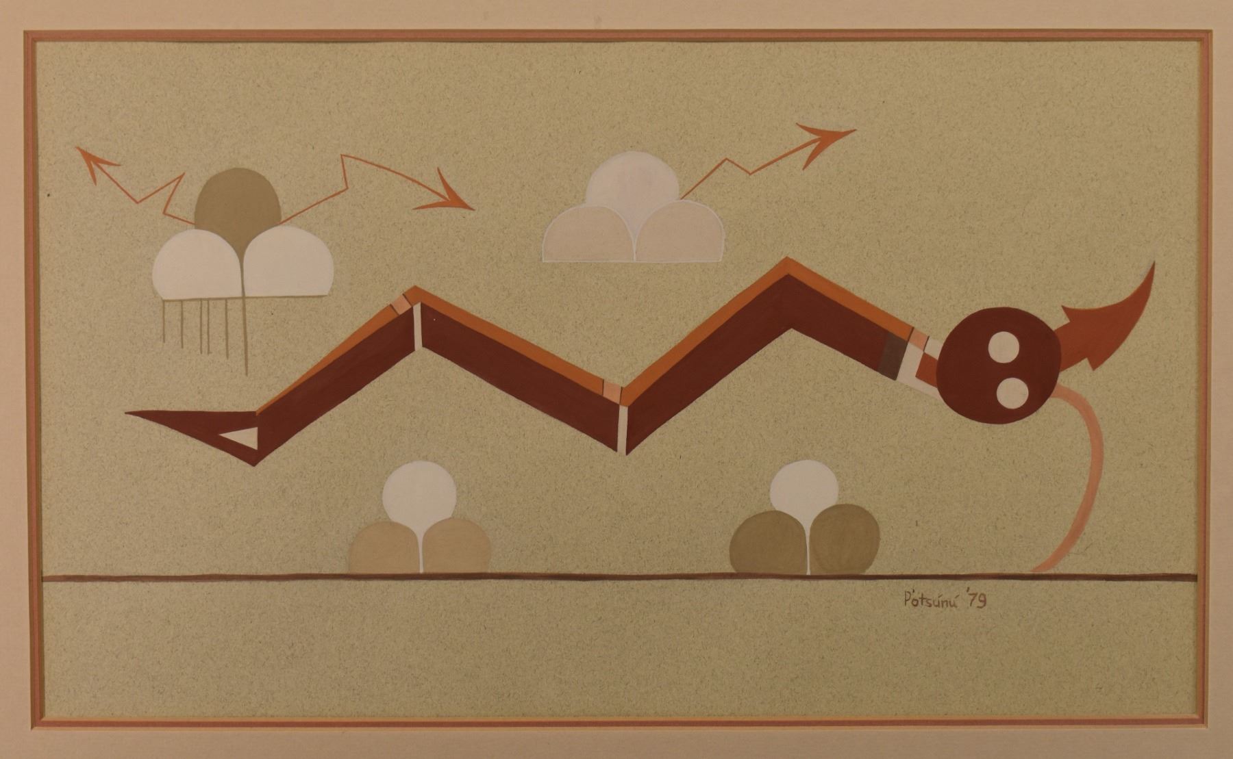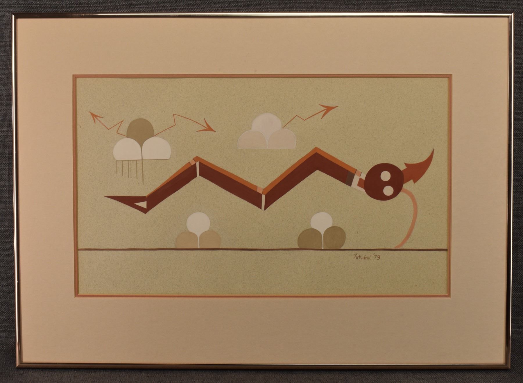 1979 San Juan. Original on paper depicting Avanyu design signed Potsunu. 11'' x 18'' frame size 18'' x 24''