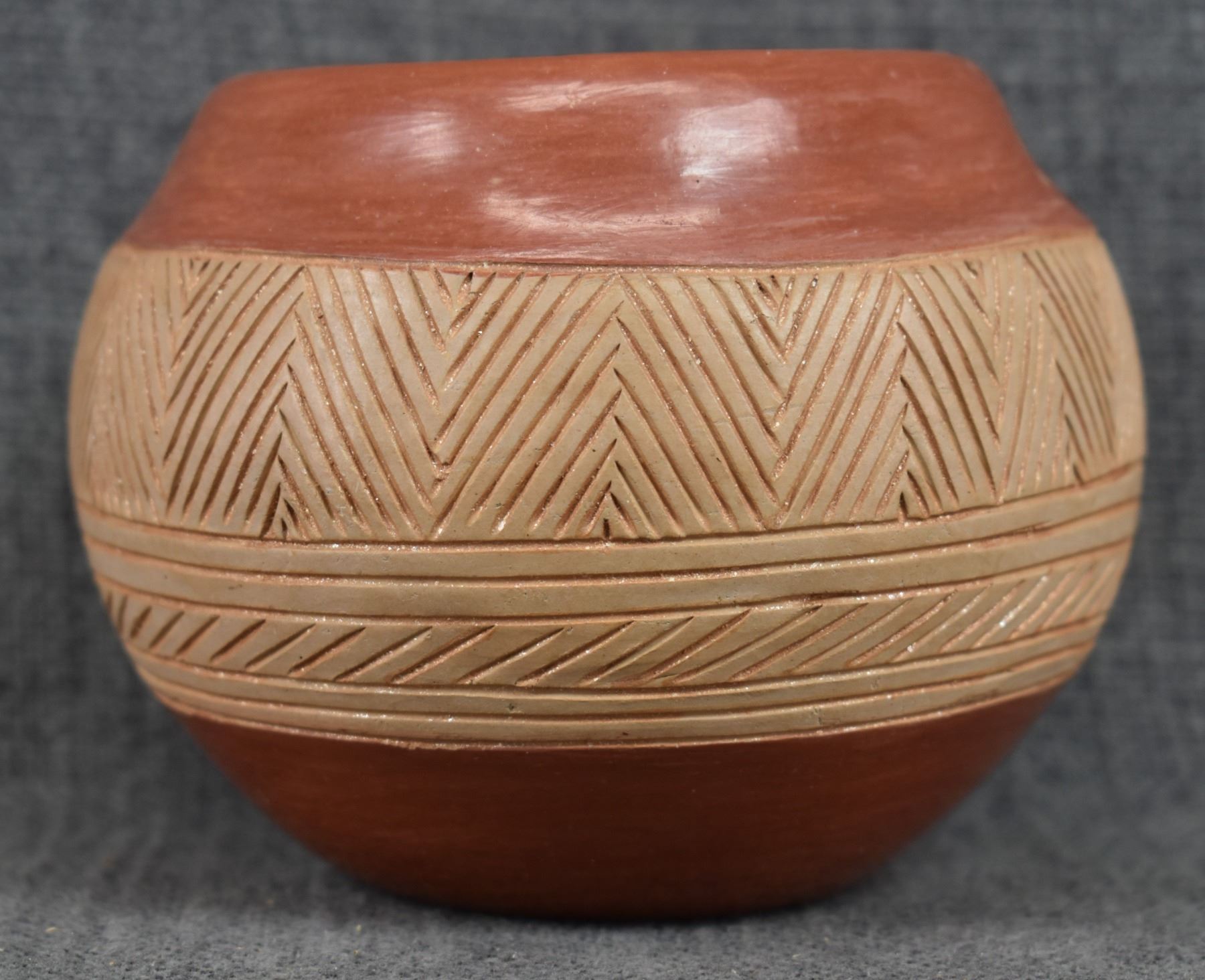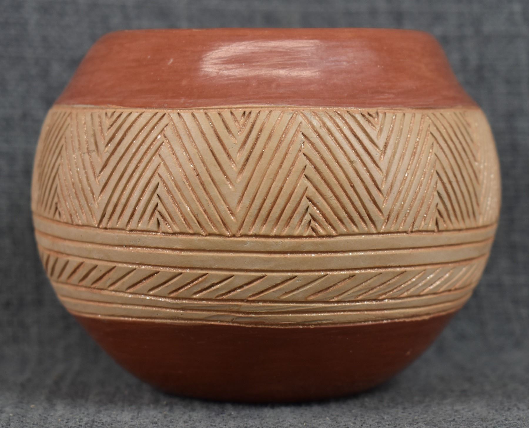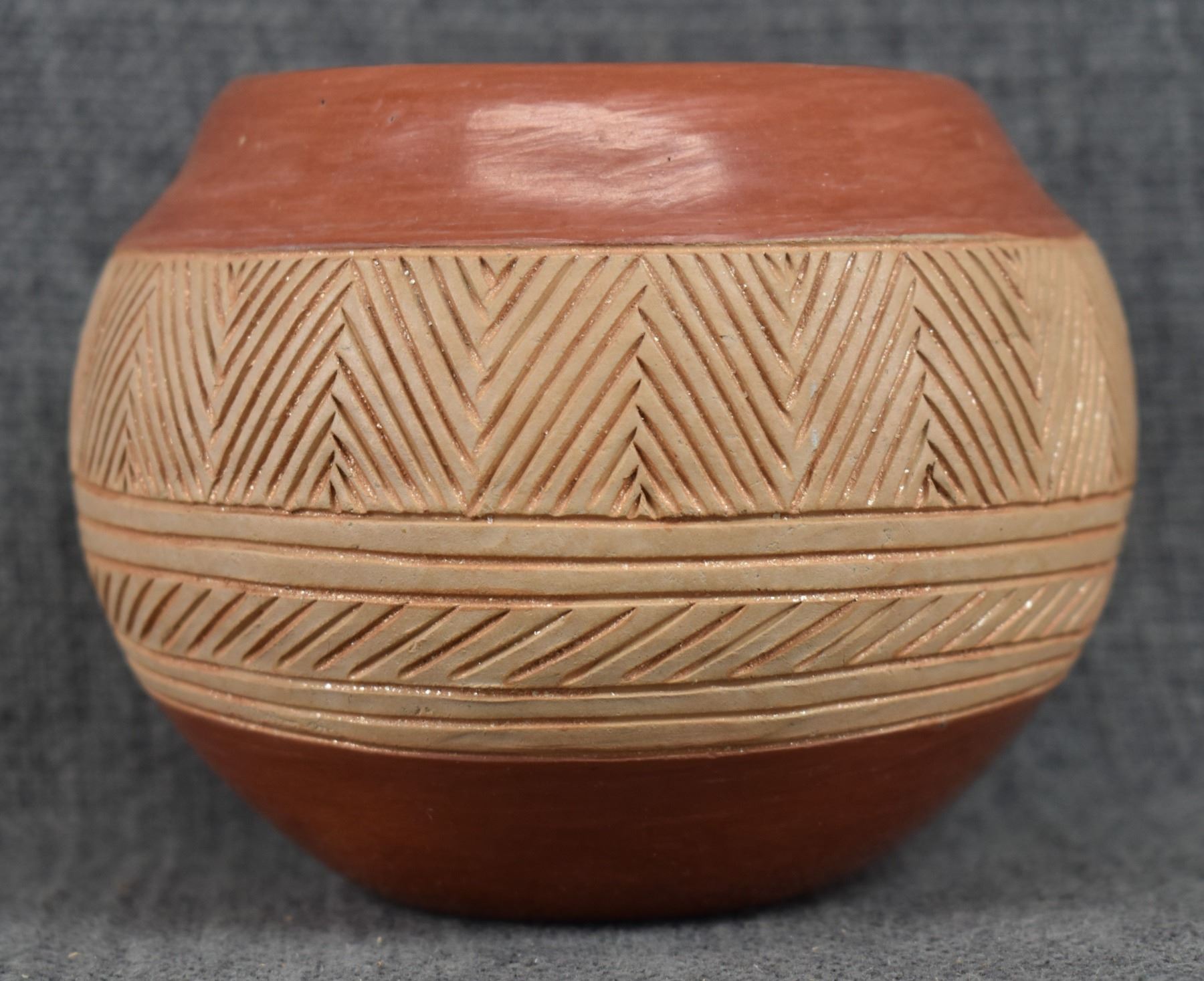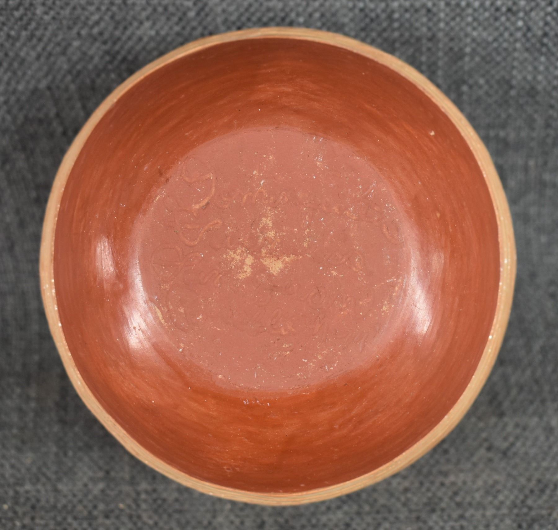 1960's San Juan . Hand coiled and carved design pottery bowl signed Dominguita Sisneros. 4'' x 4.5''