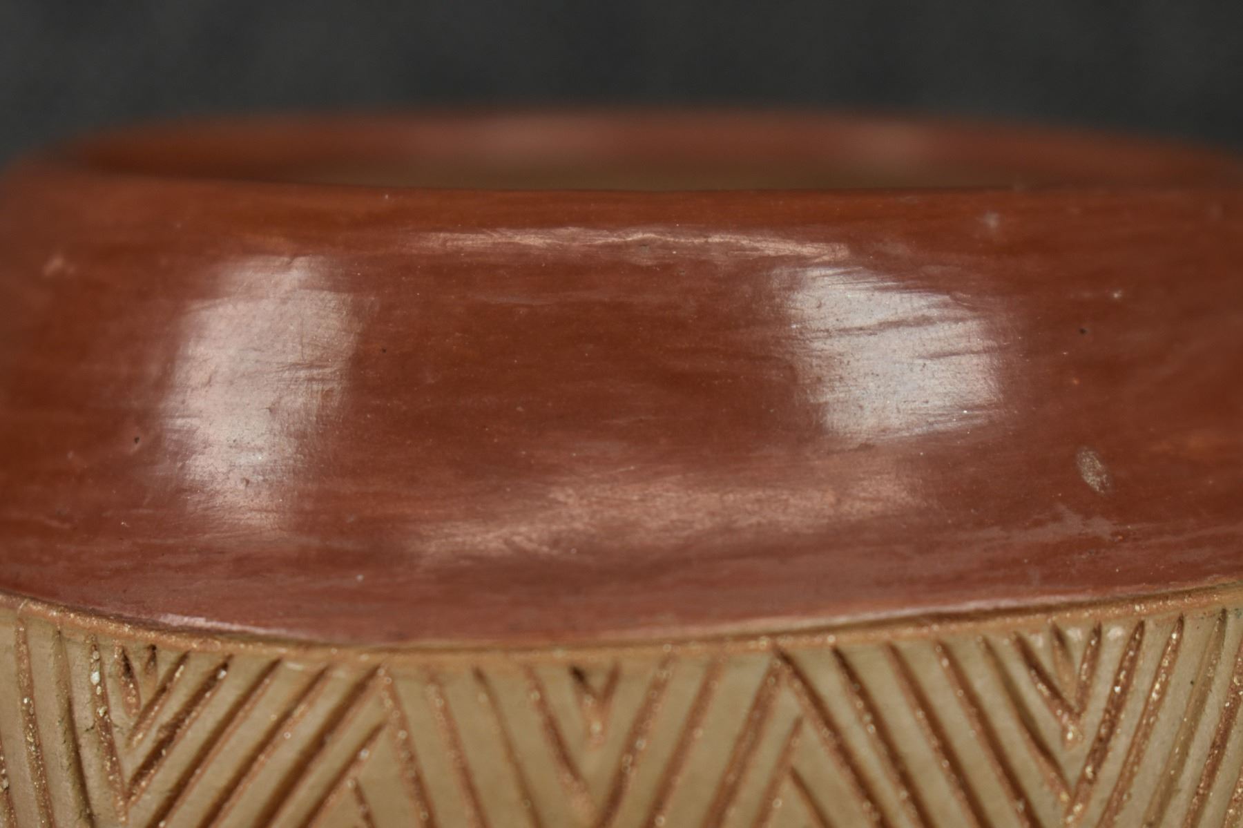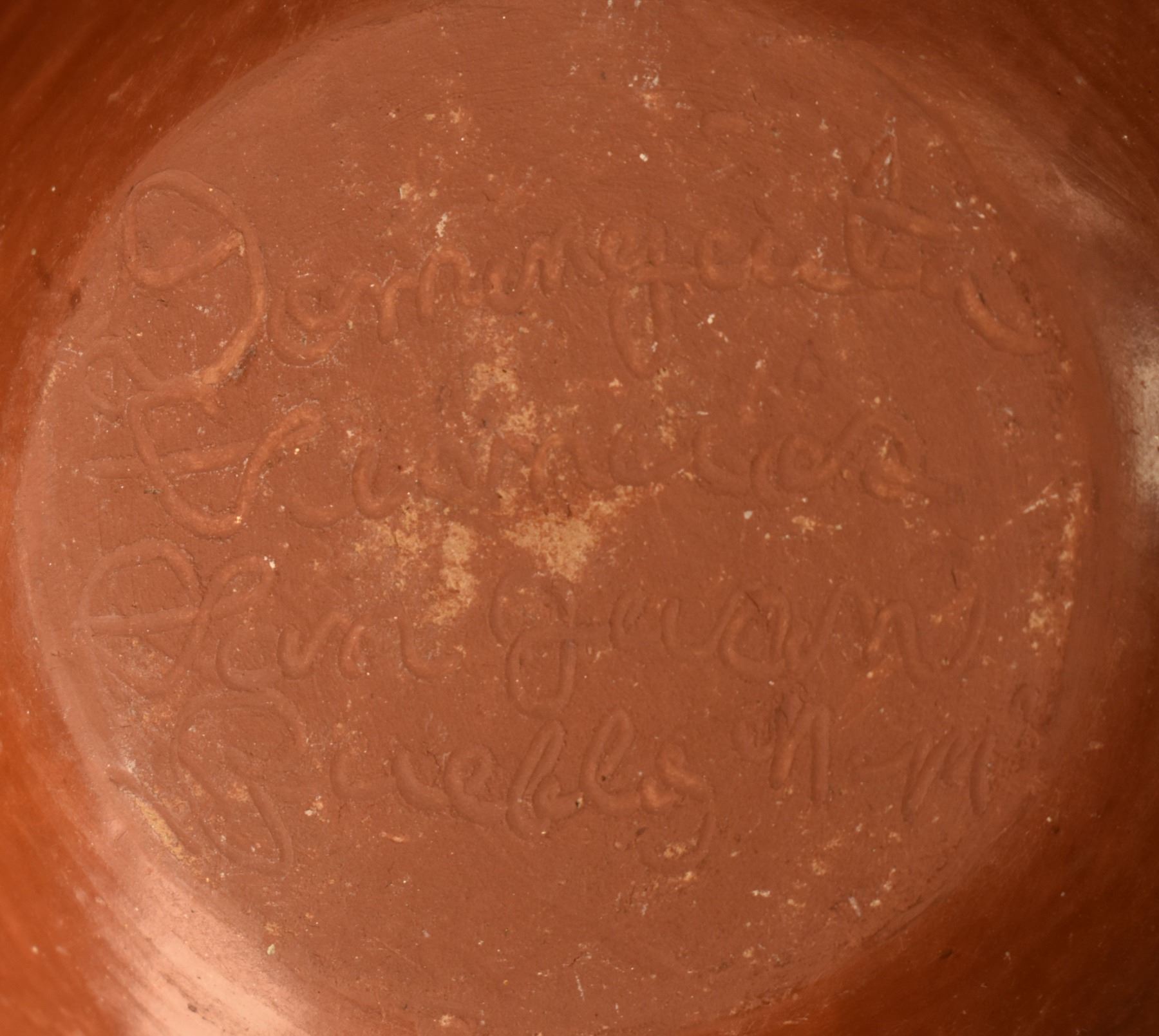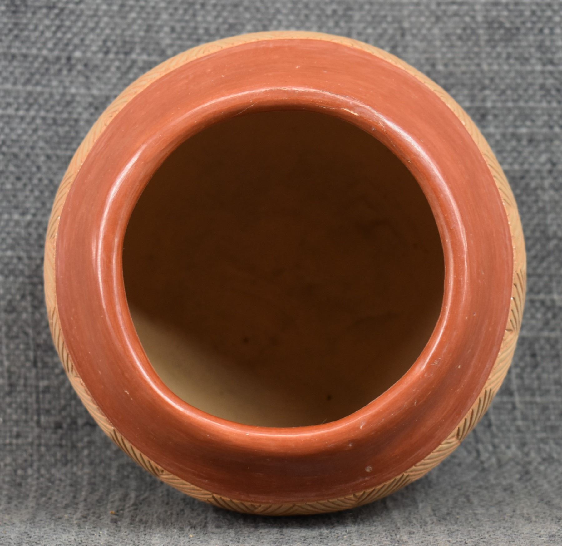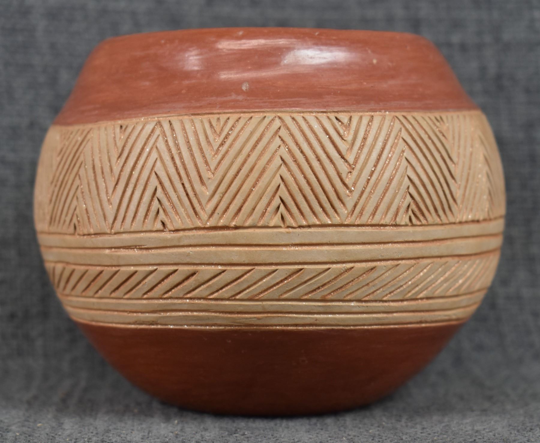 1960's San Juan . Hand coiled and carved design pottery bowl signed Dominguita Sisneros. 4'' x 4.5''