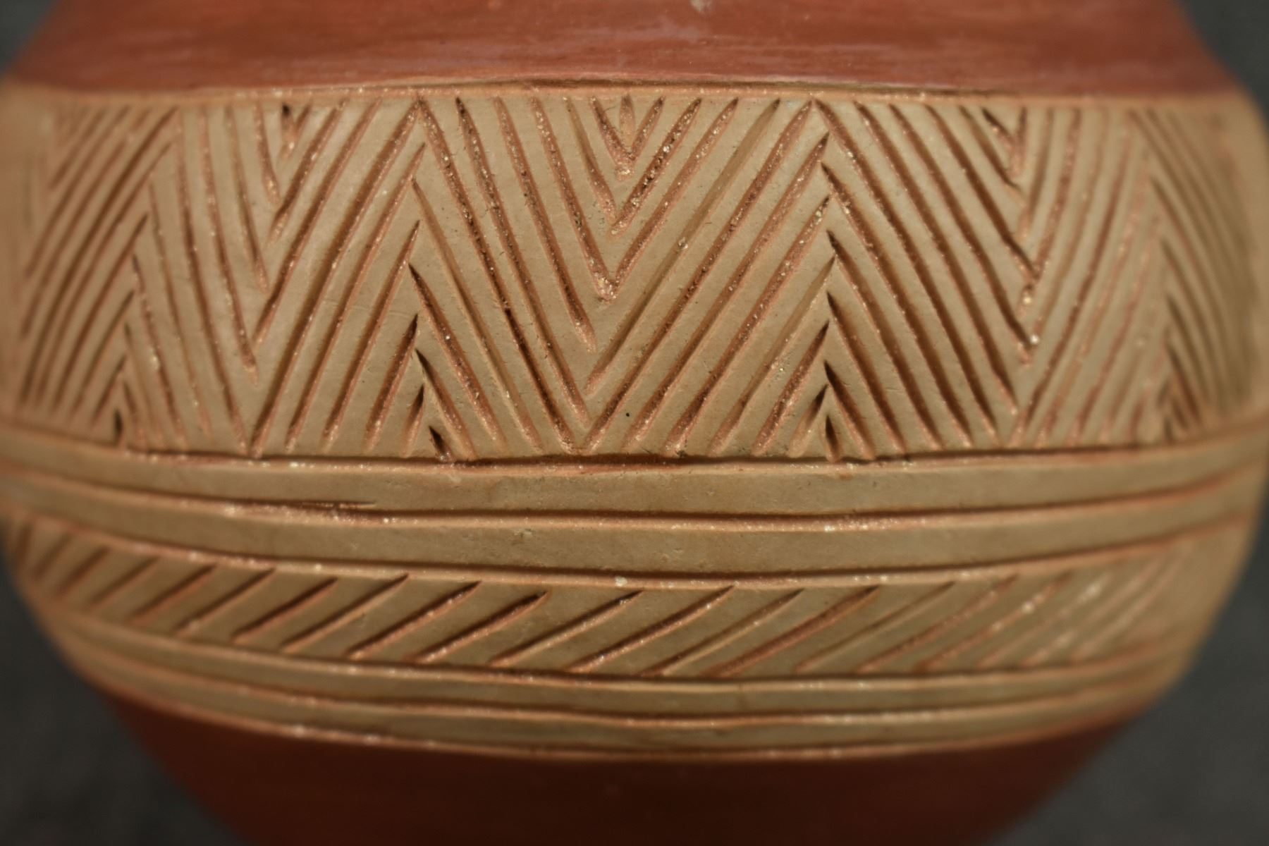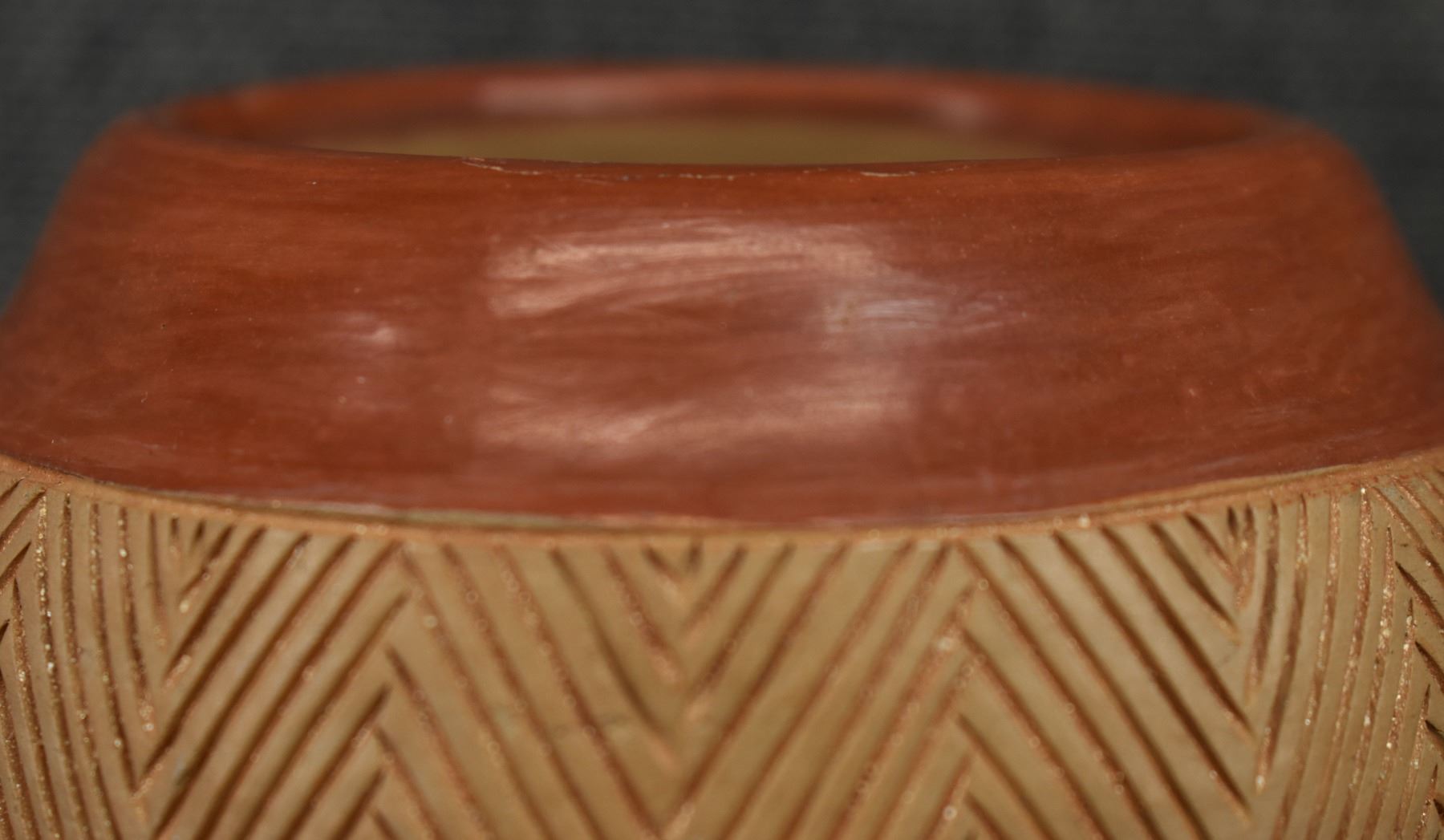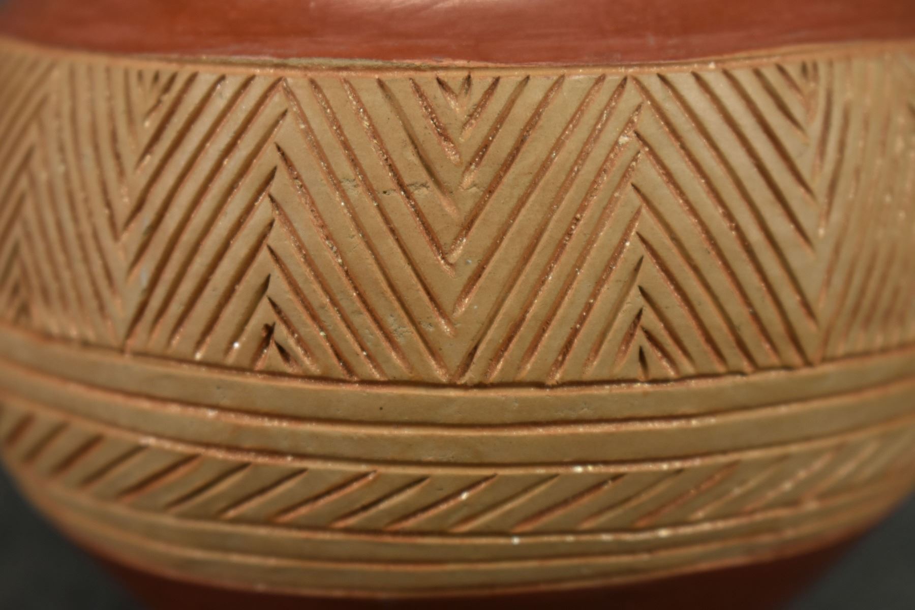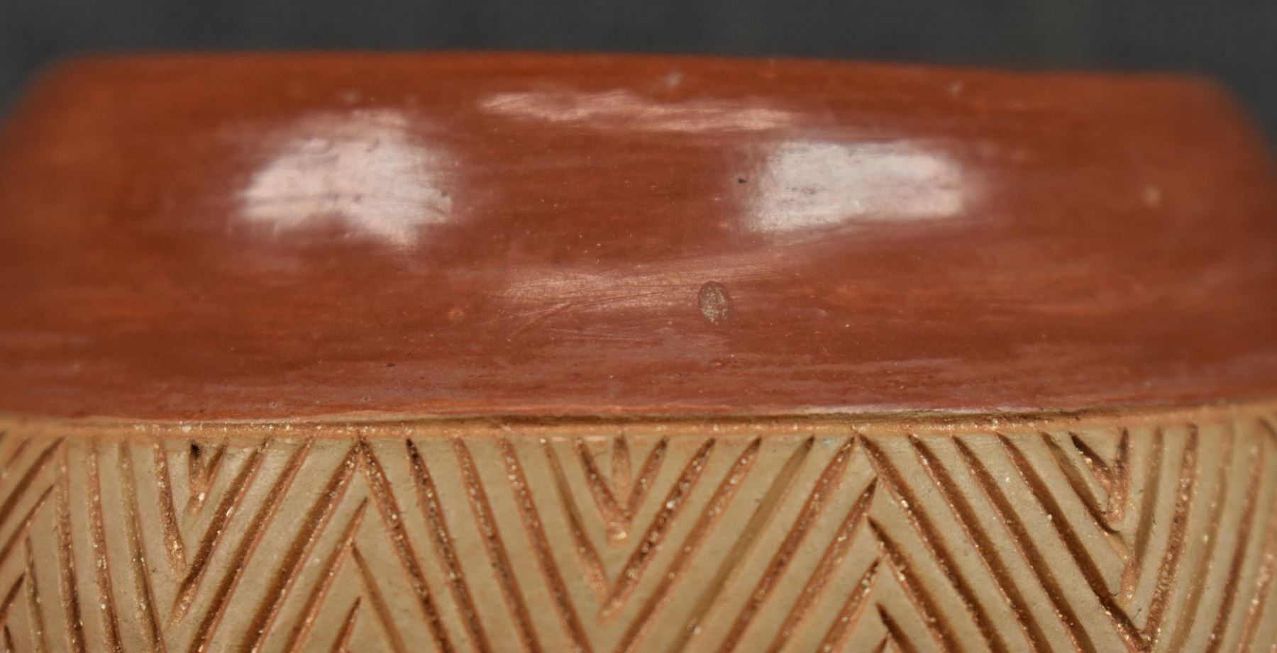 1960's San Juan . Hand coiled and carved design pottery bowl signed Dominguita Sisneros. 4'' x 4.5''