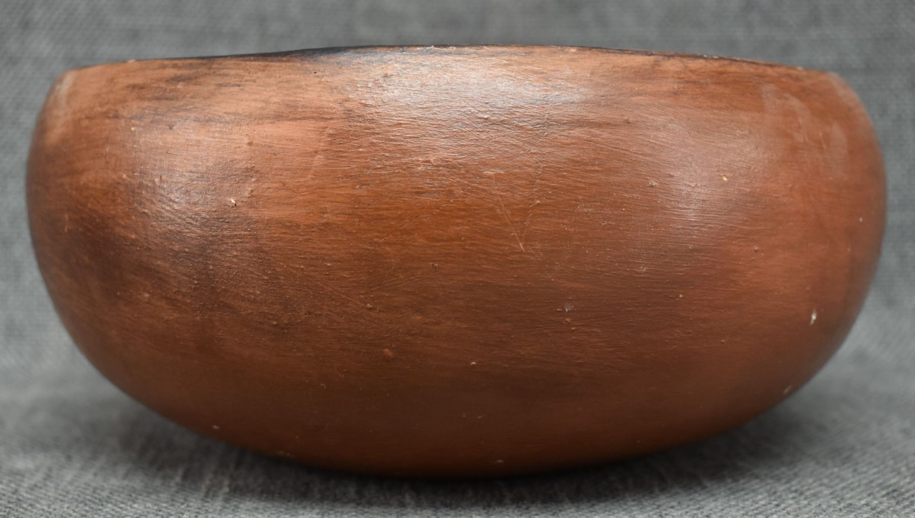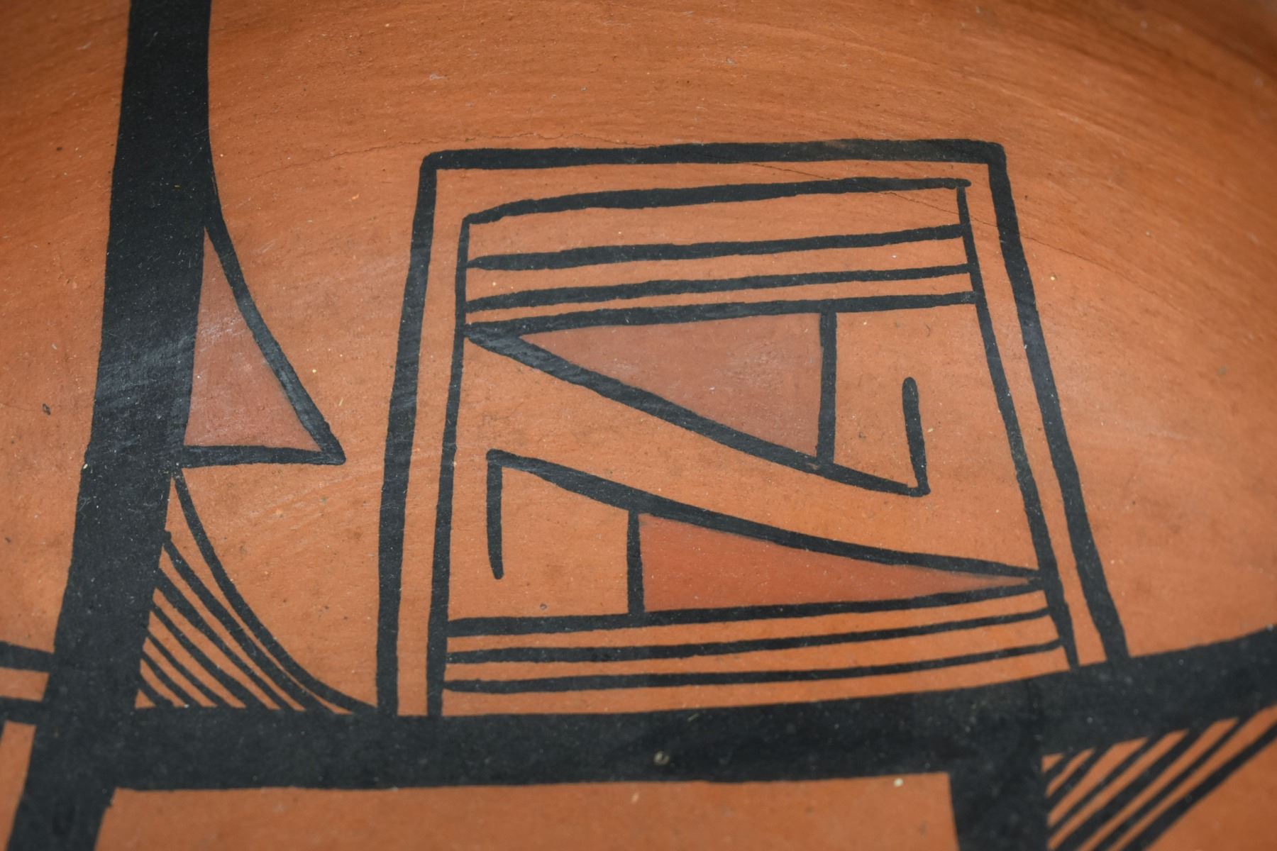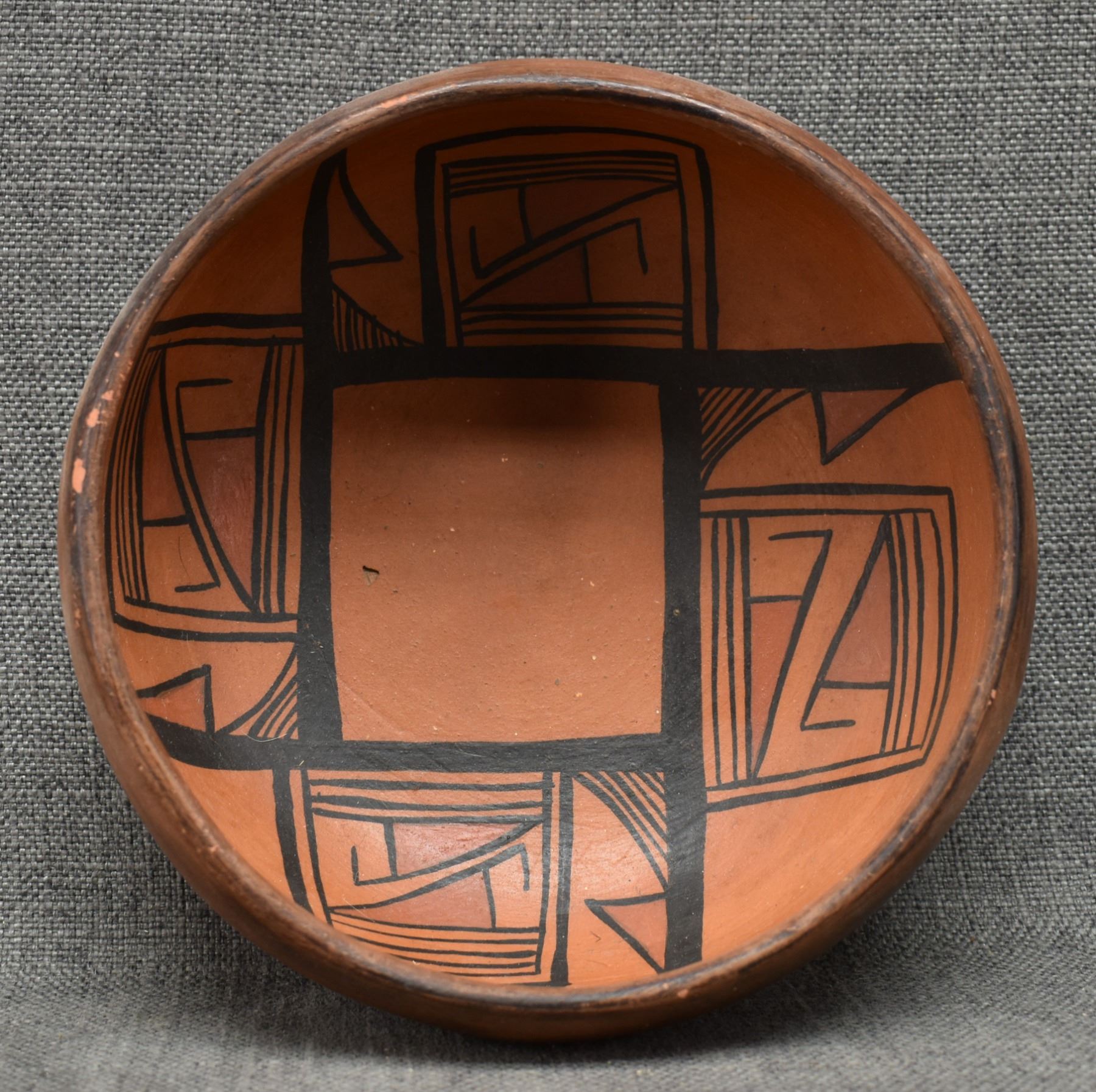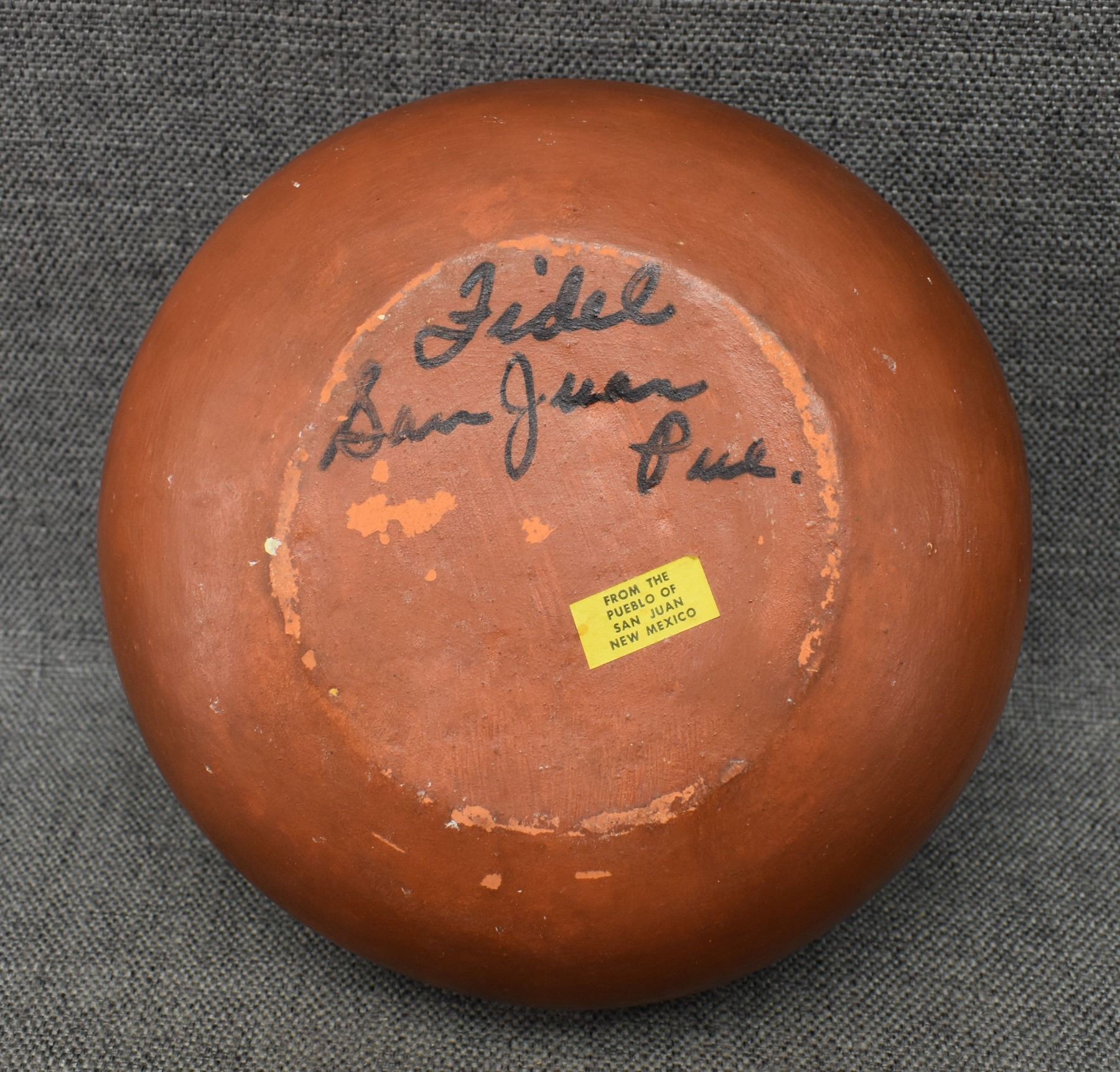 1960's San Juan. Hand coiled an painted design pottery bowl. Signed Fidel. 3.5'' x 8''