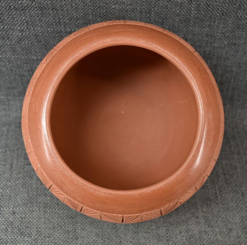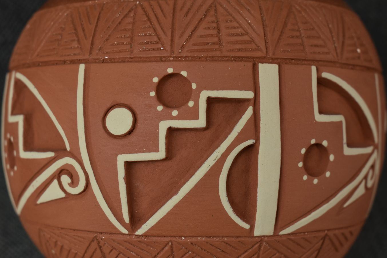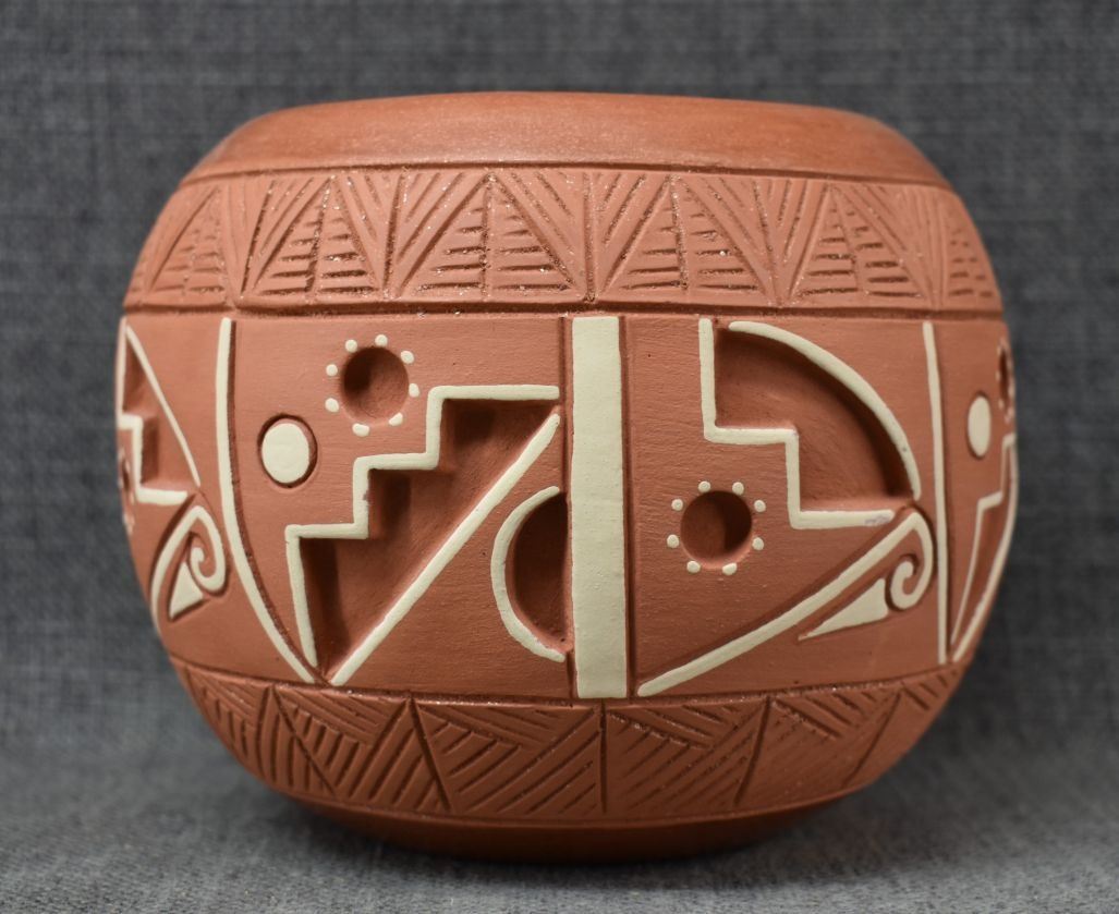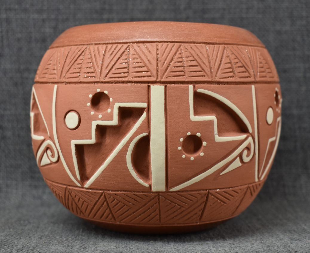 1980-90's San Juan, hand coiled with incised carved and painted geometric design by Rosita De Herrera 4.75" x 6"