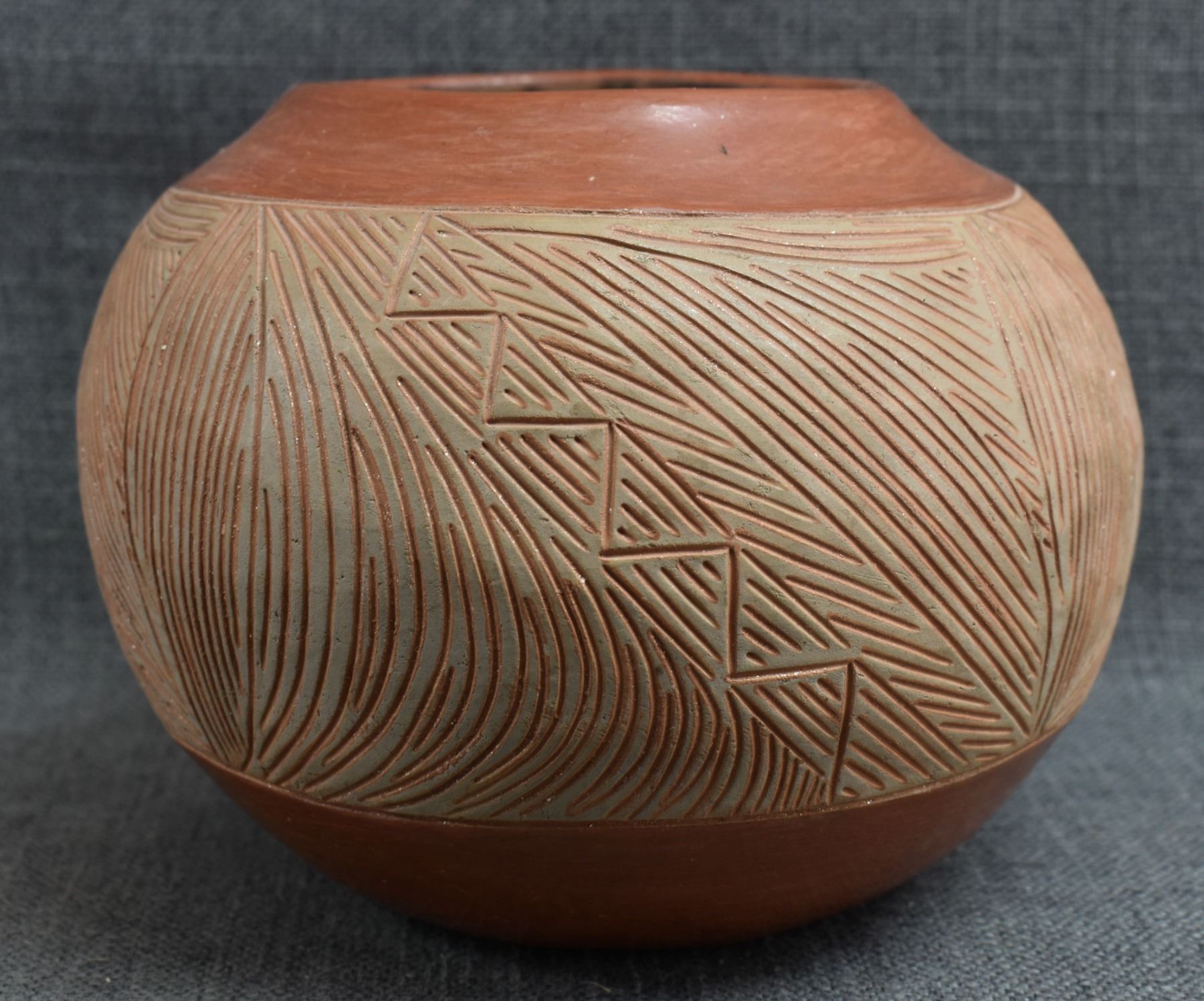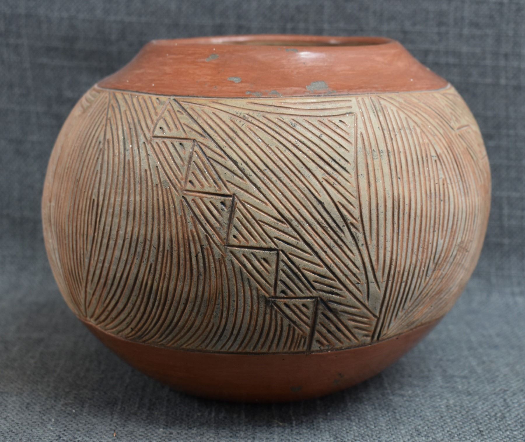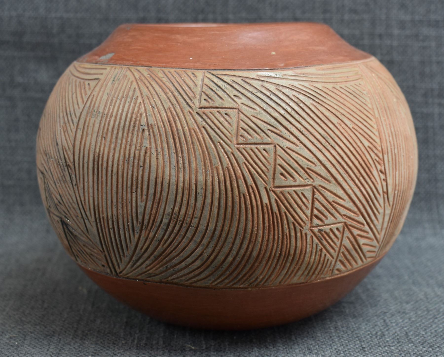 1960-70's San Juan, hand coiled with carved and polished design by Tomasita Montoya 6" x 7.25"