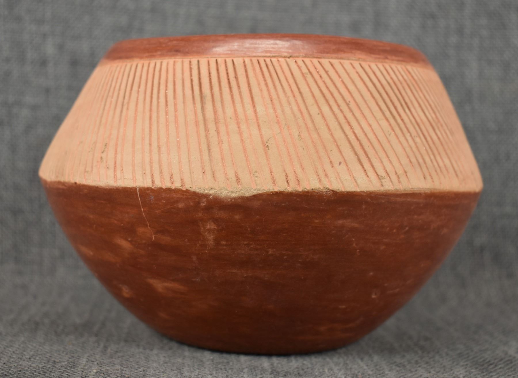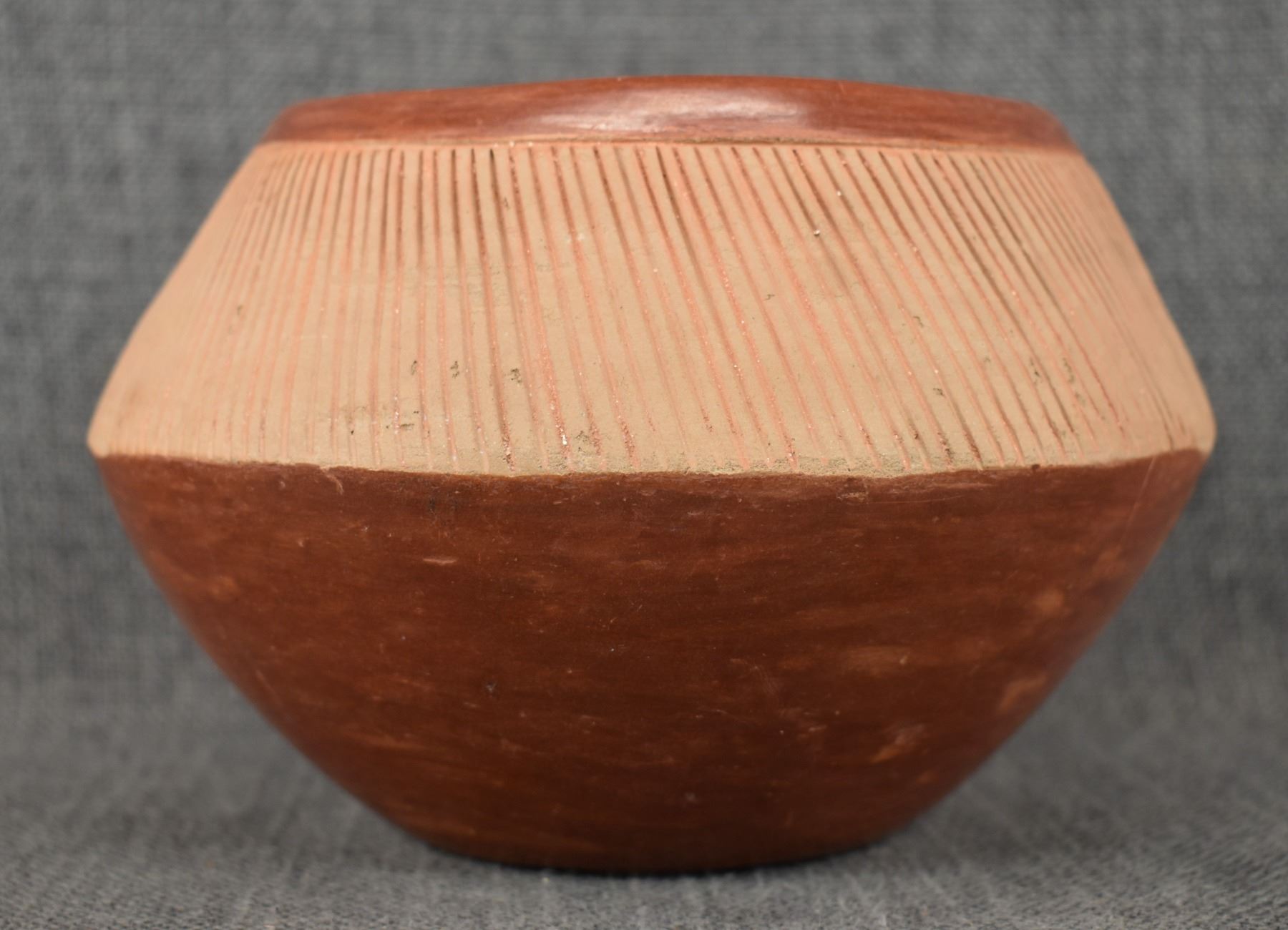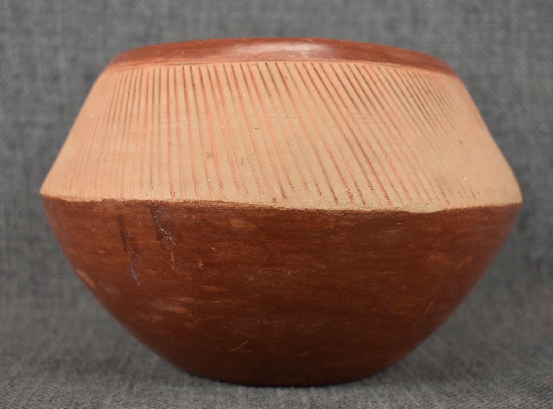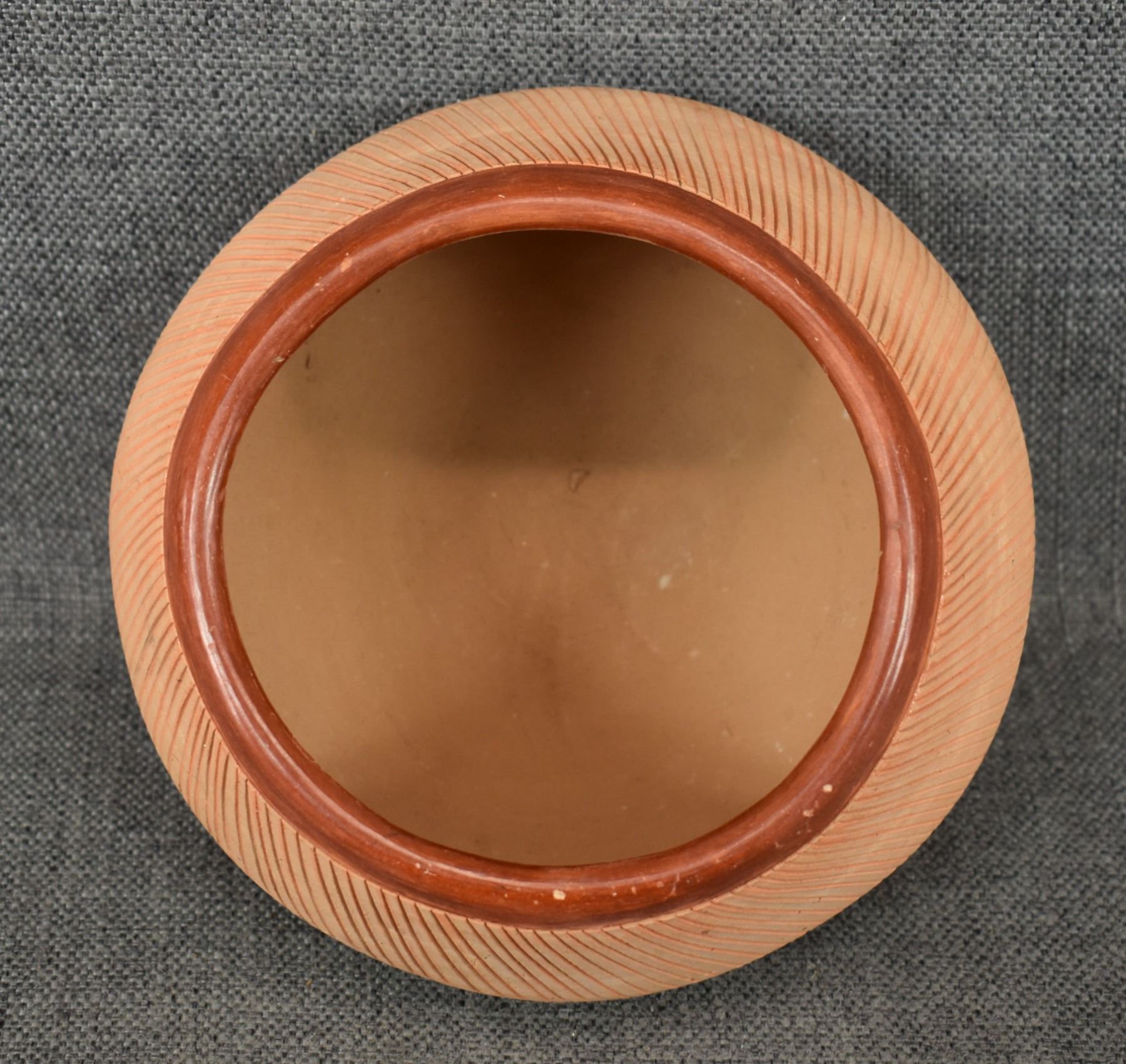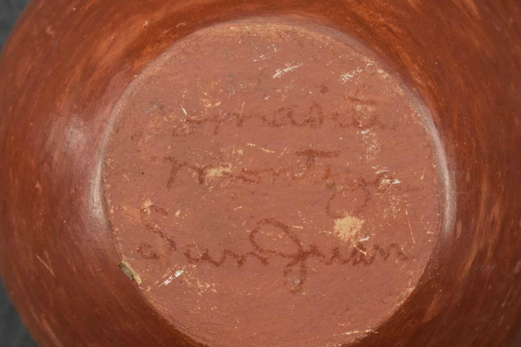 1950's San Juan, hand coiled with polished and carved design by Tomasita Montoya, 4.75" x 7".
