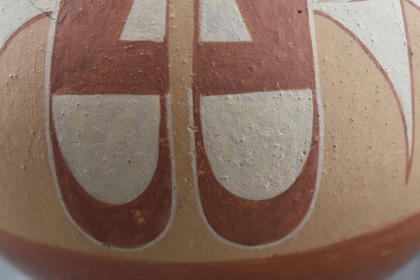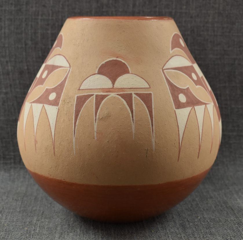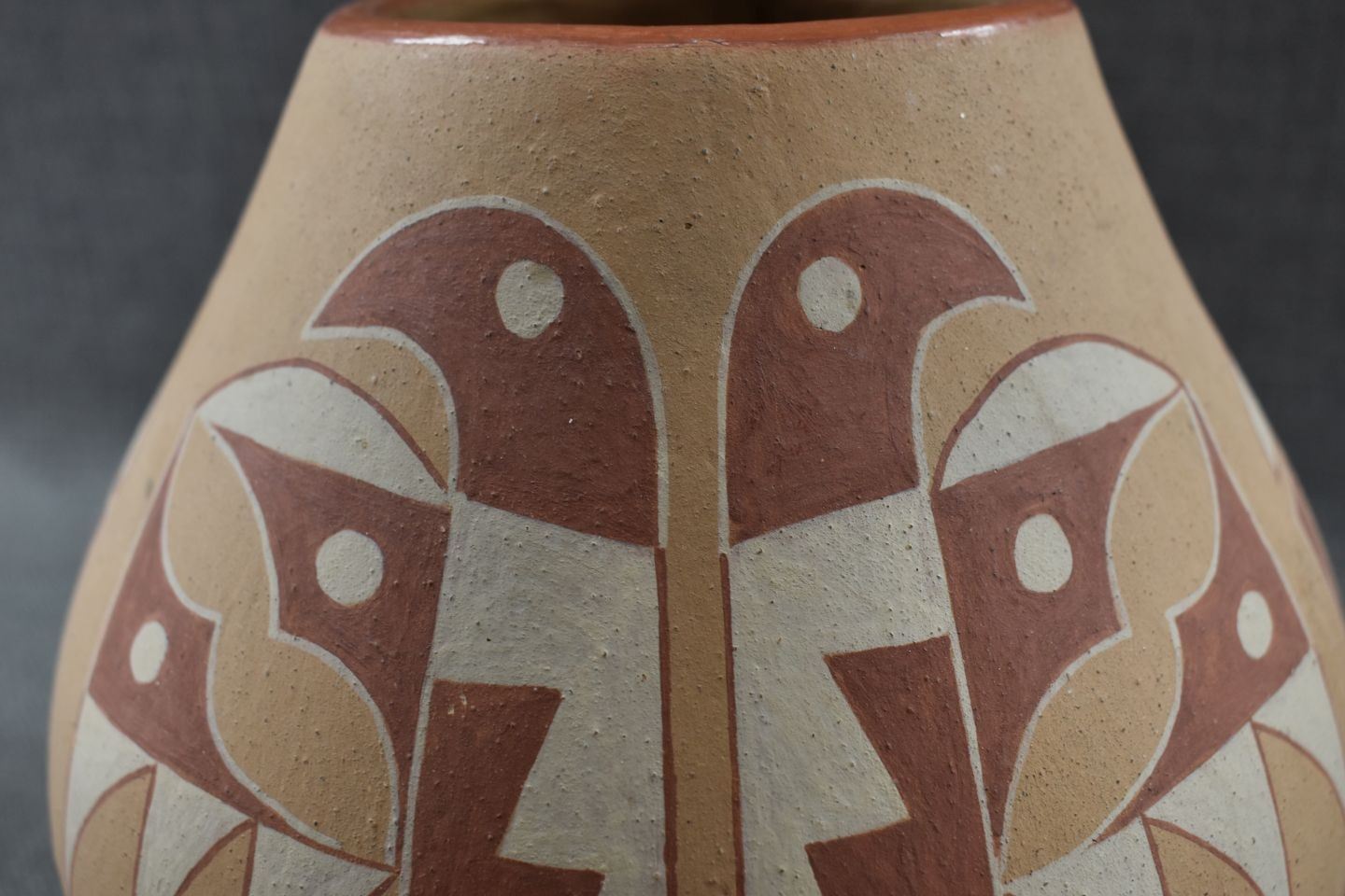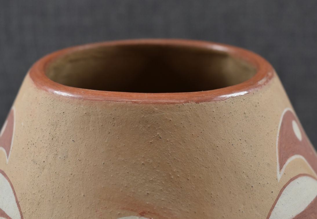 1960's San Juan. Hand coiled and painted polychrome design pottery vase. 8.5'' x 8''