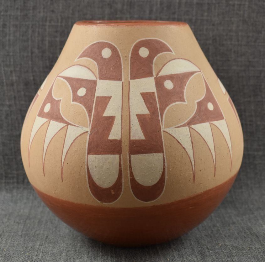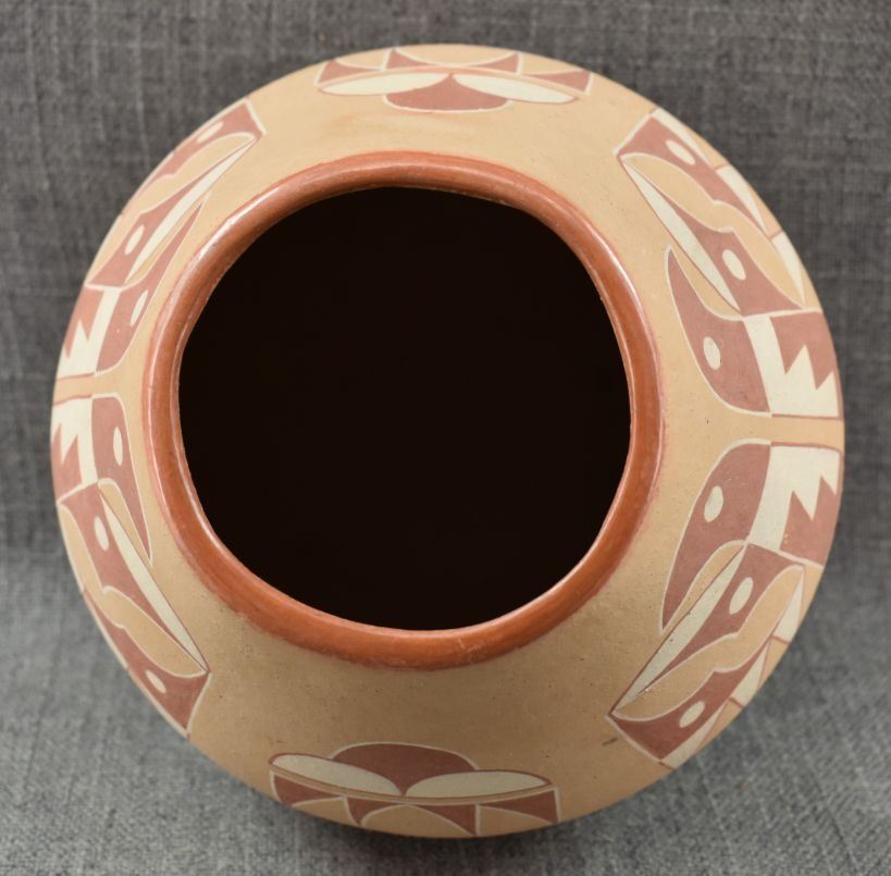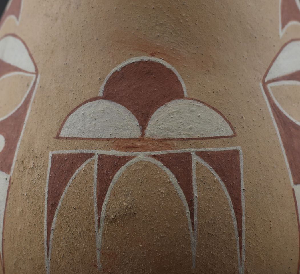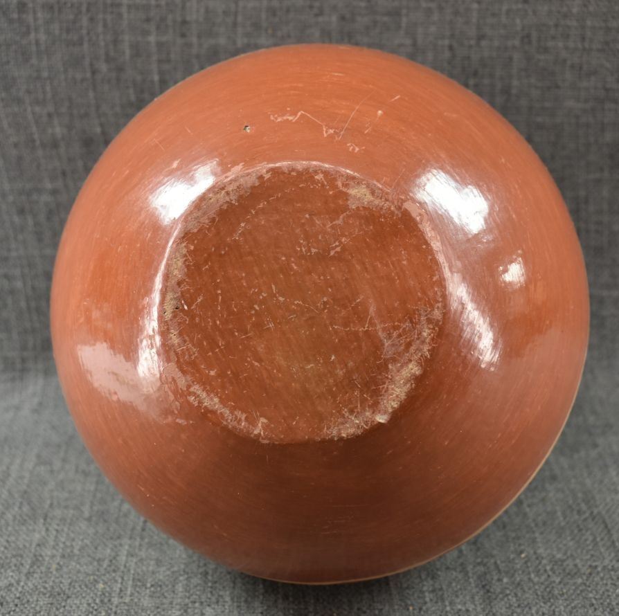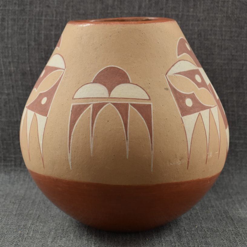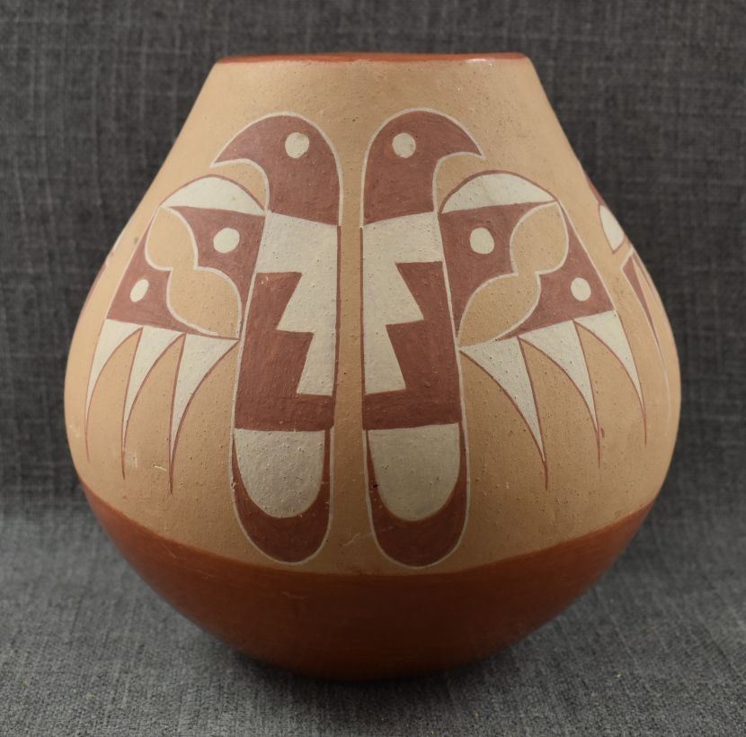 1960's San Juan. Hand coiled and painted polychrome design pottery vase. 8.5'' x 8''