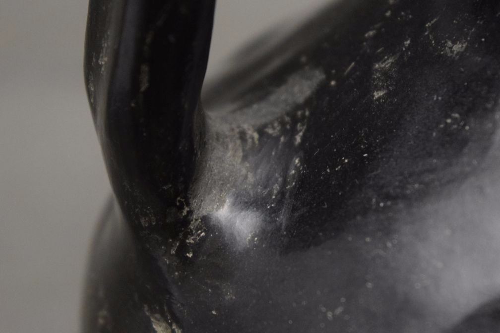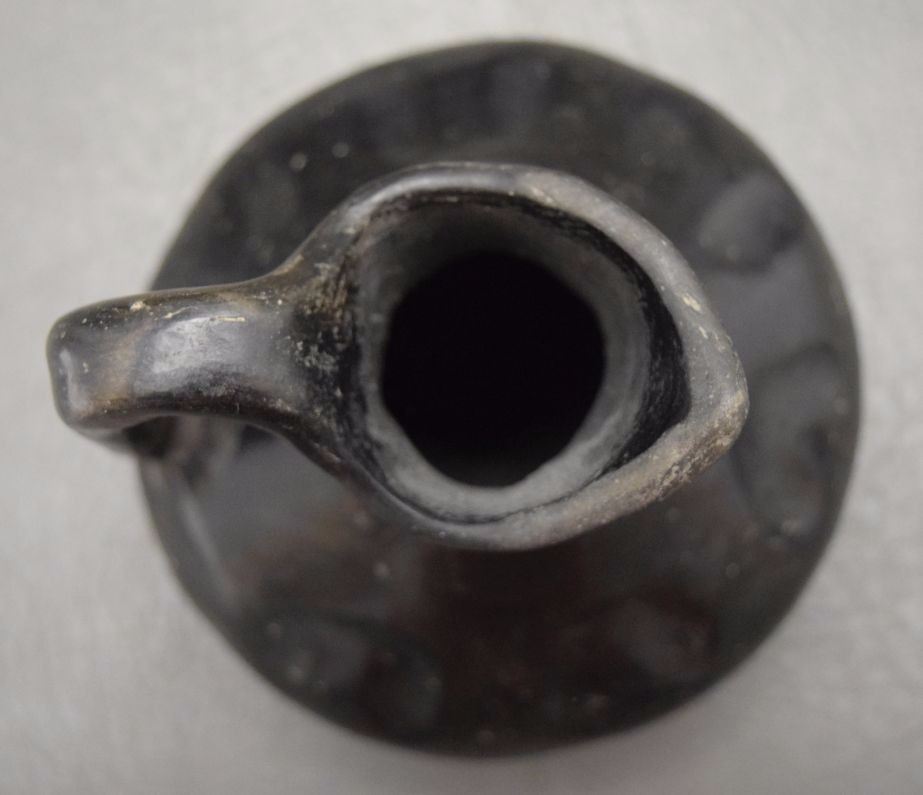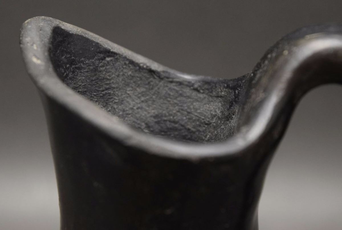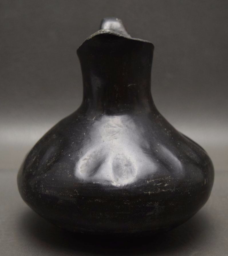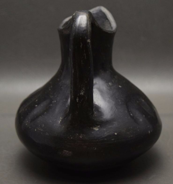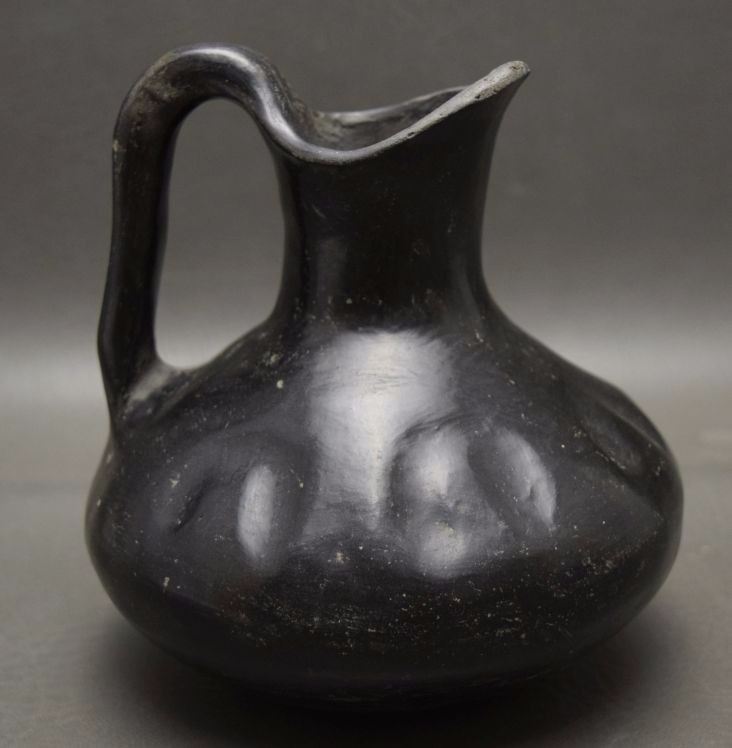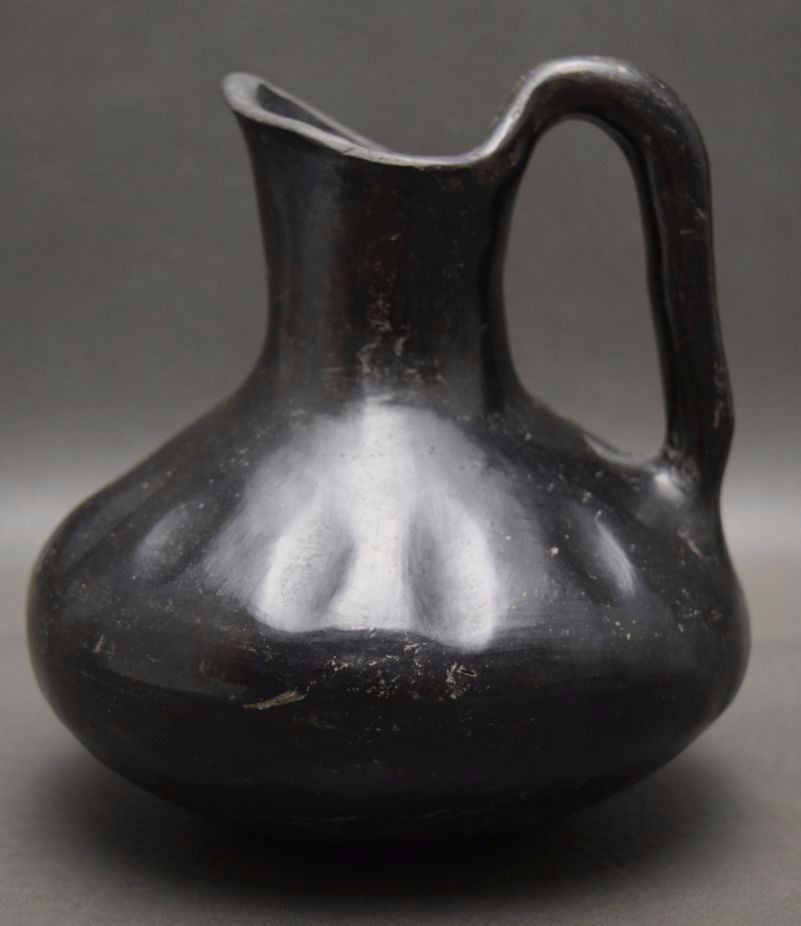 1920's polished black wear pottery pitcher has minor surface rubs. 6'' x 6''