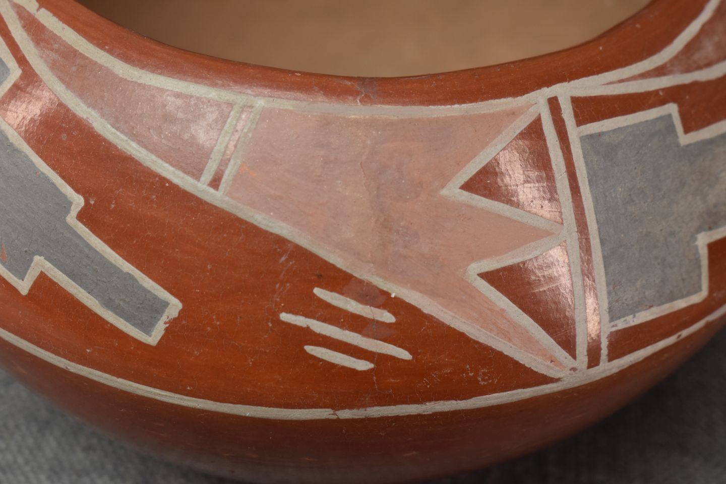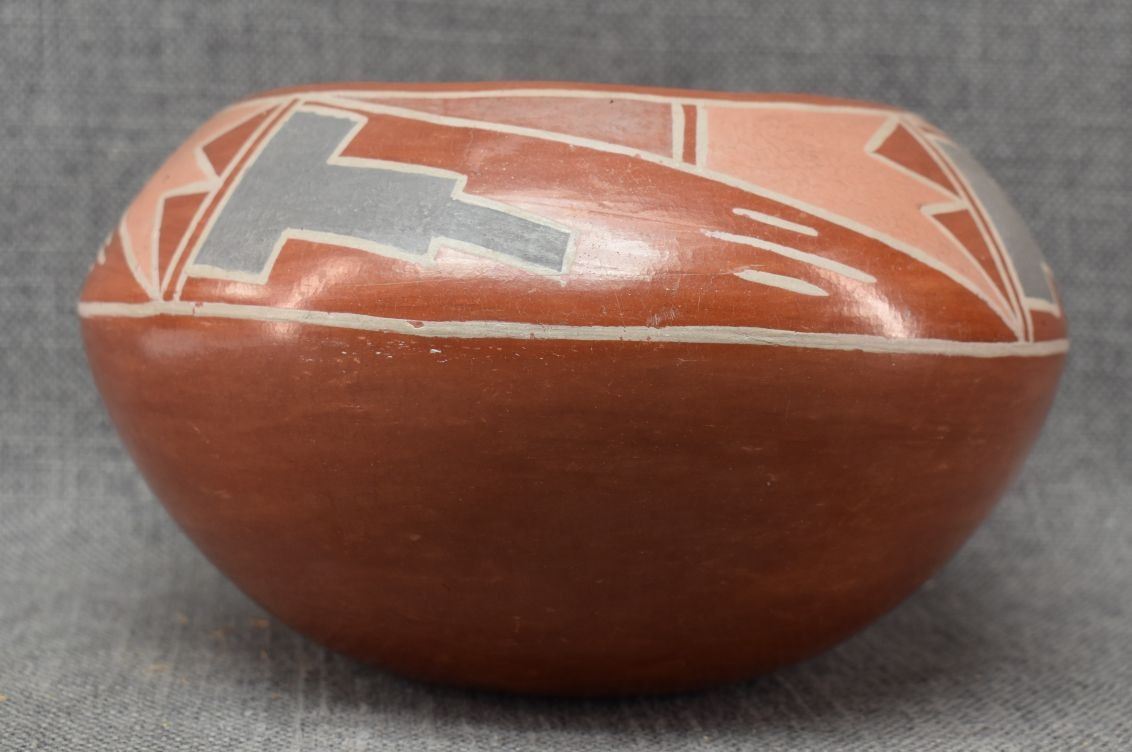 1940's Santa Clara. Hand coiled and p[painted polychrome design pottery bowl. 5'' x 9'' has cracks