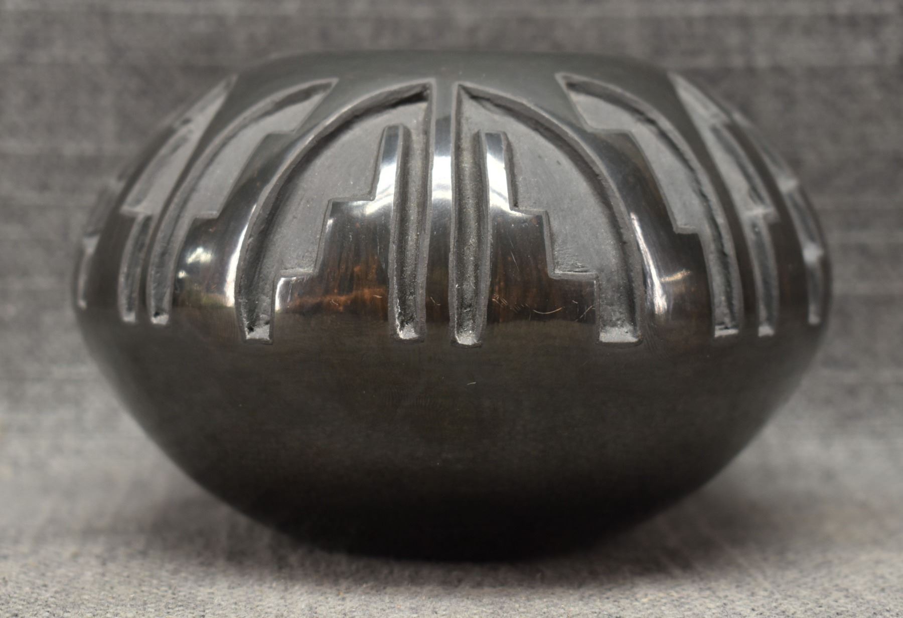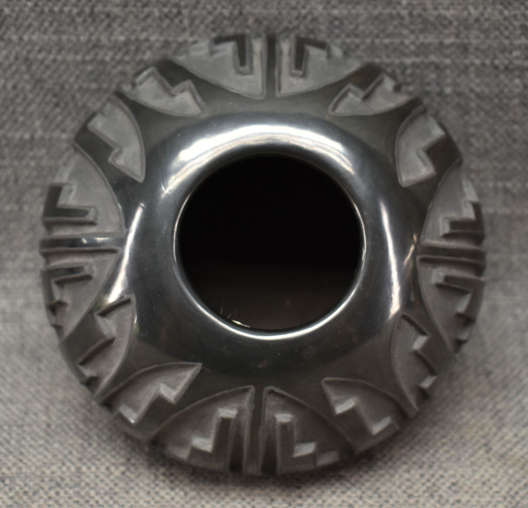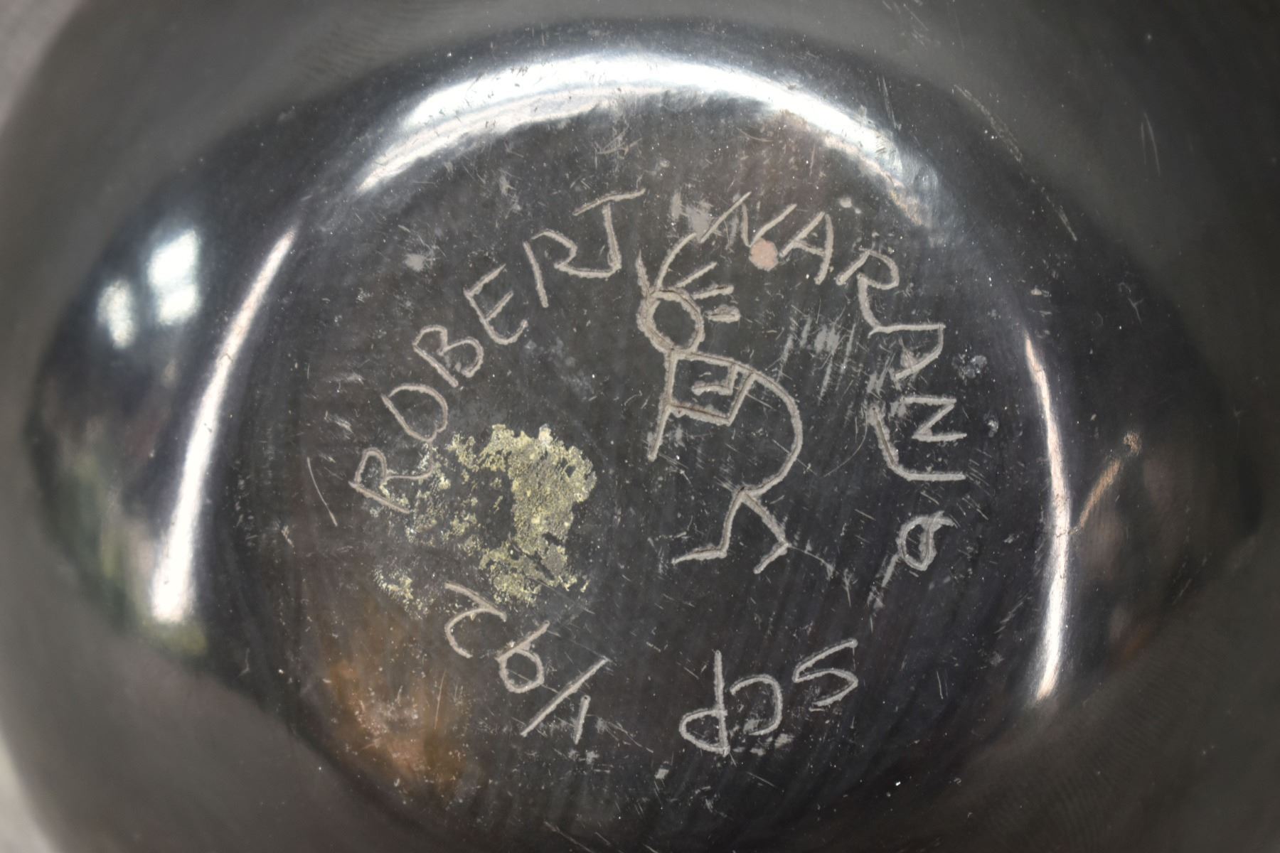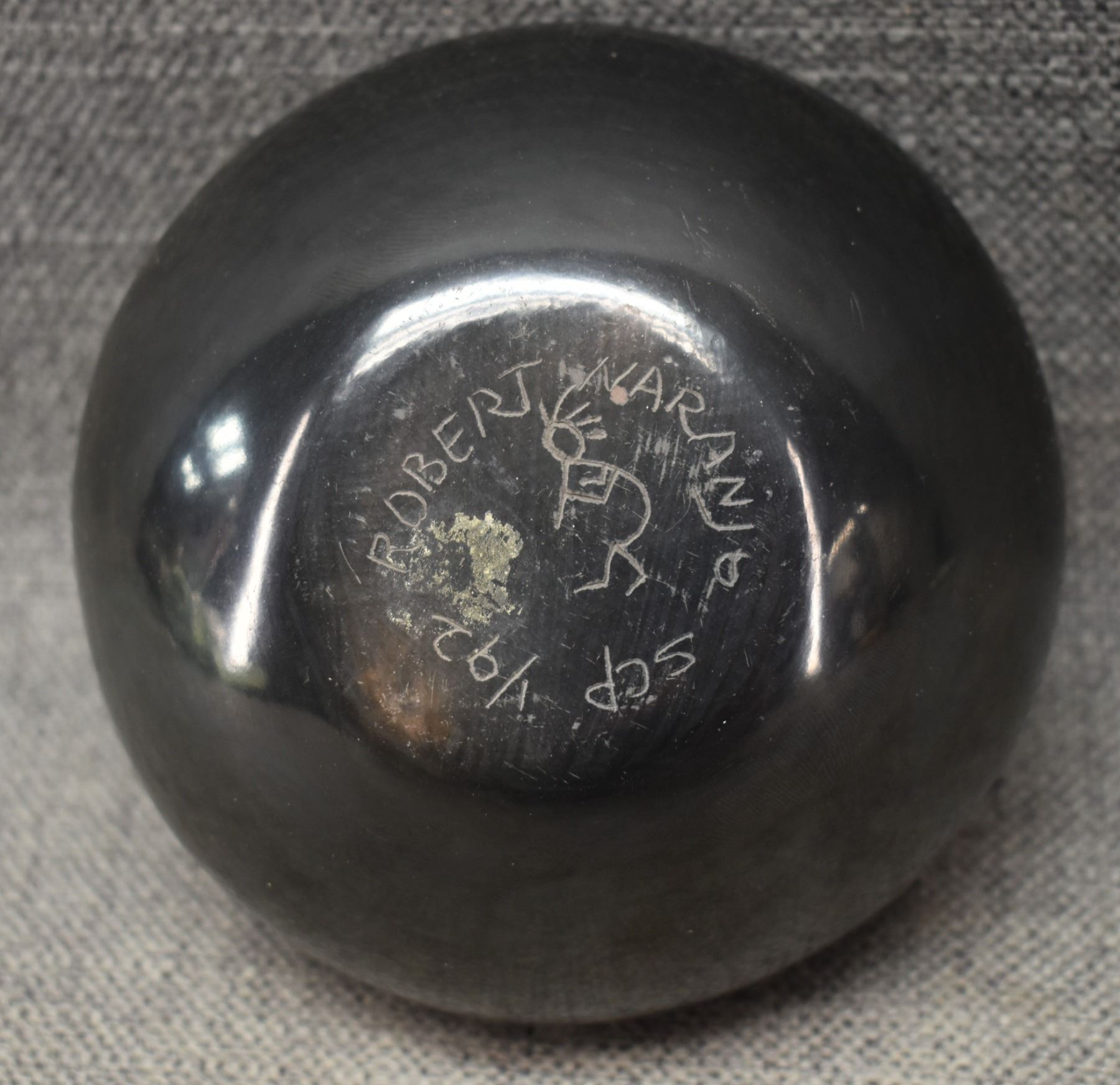1992 Santa Clara. Hand coiled and carved design pottery bowl. Signed Robert Naranjo. 3'' x 5''